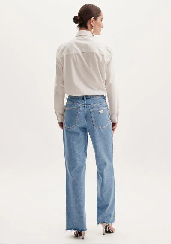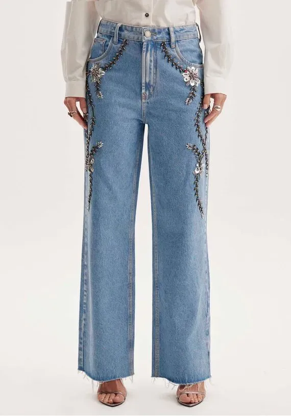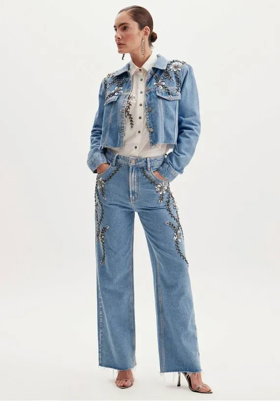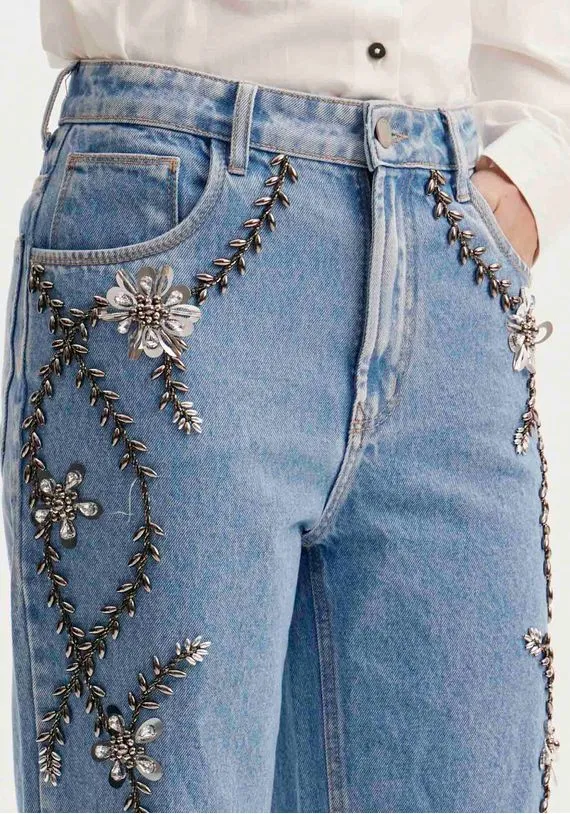 calça jeans em modelagem full length e de cintura alta é ideal para deixar seus looks mais estilosos. O modelo tem caimento amplo, bolsos funcionais e cós com passantes. As aplicações de flores e ramos metalizados agrega ainda mais charme ao look. Aposte nessa peça icônica!