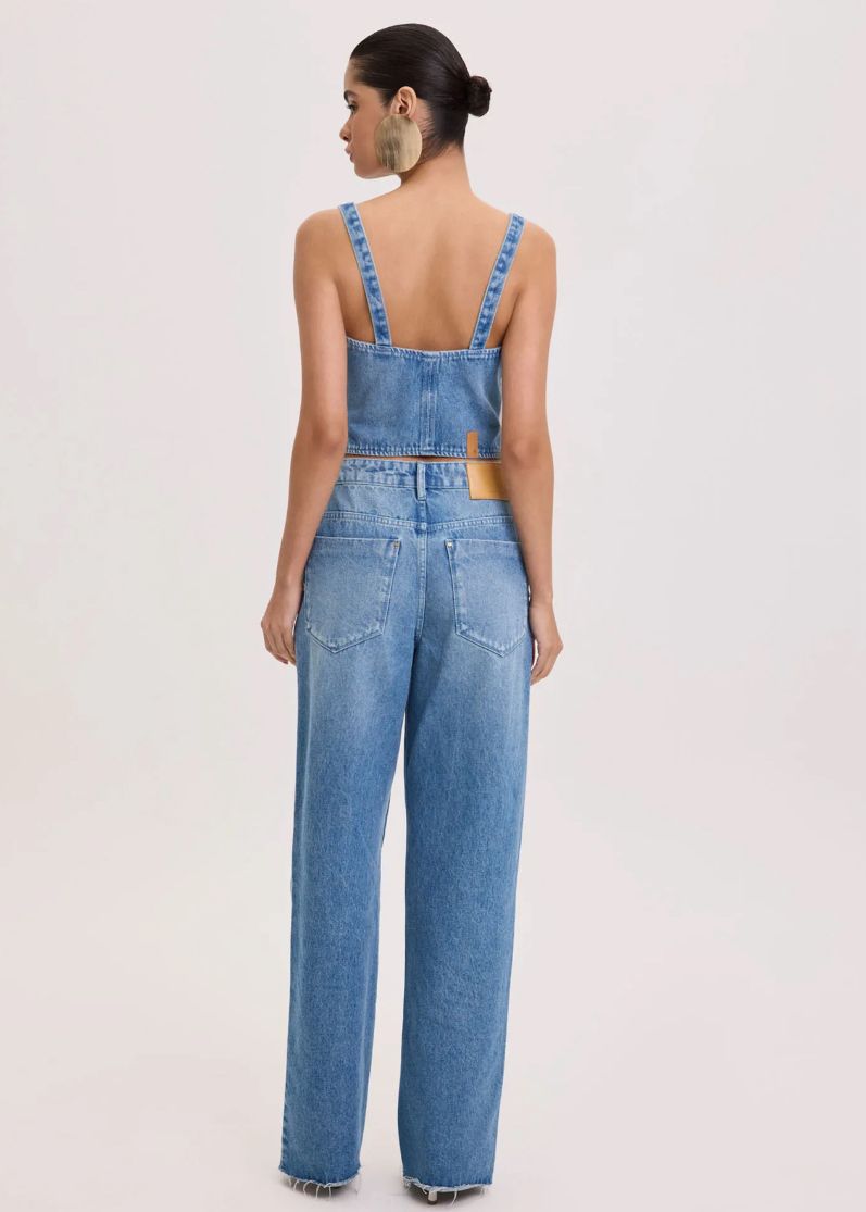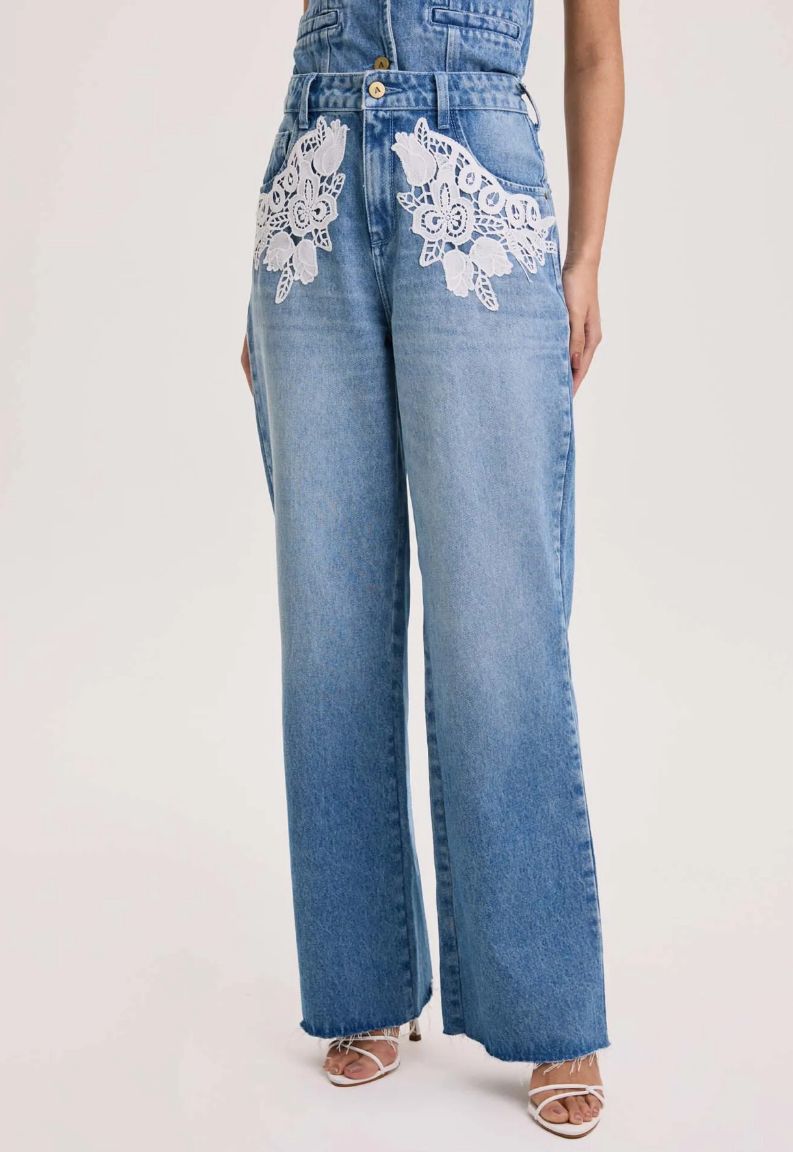 Complete o seu visual com a calça jeans. Nessa versão, possui modelagem wide leg, cintura alta, cós com passantes, bolsos funcionais e detalhe em bordado que garantem a personalidade deste clássico repaginado.