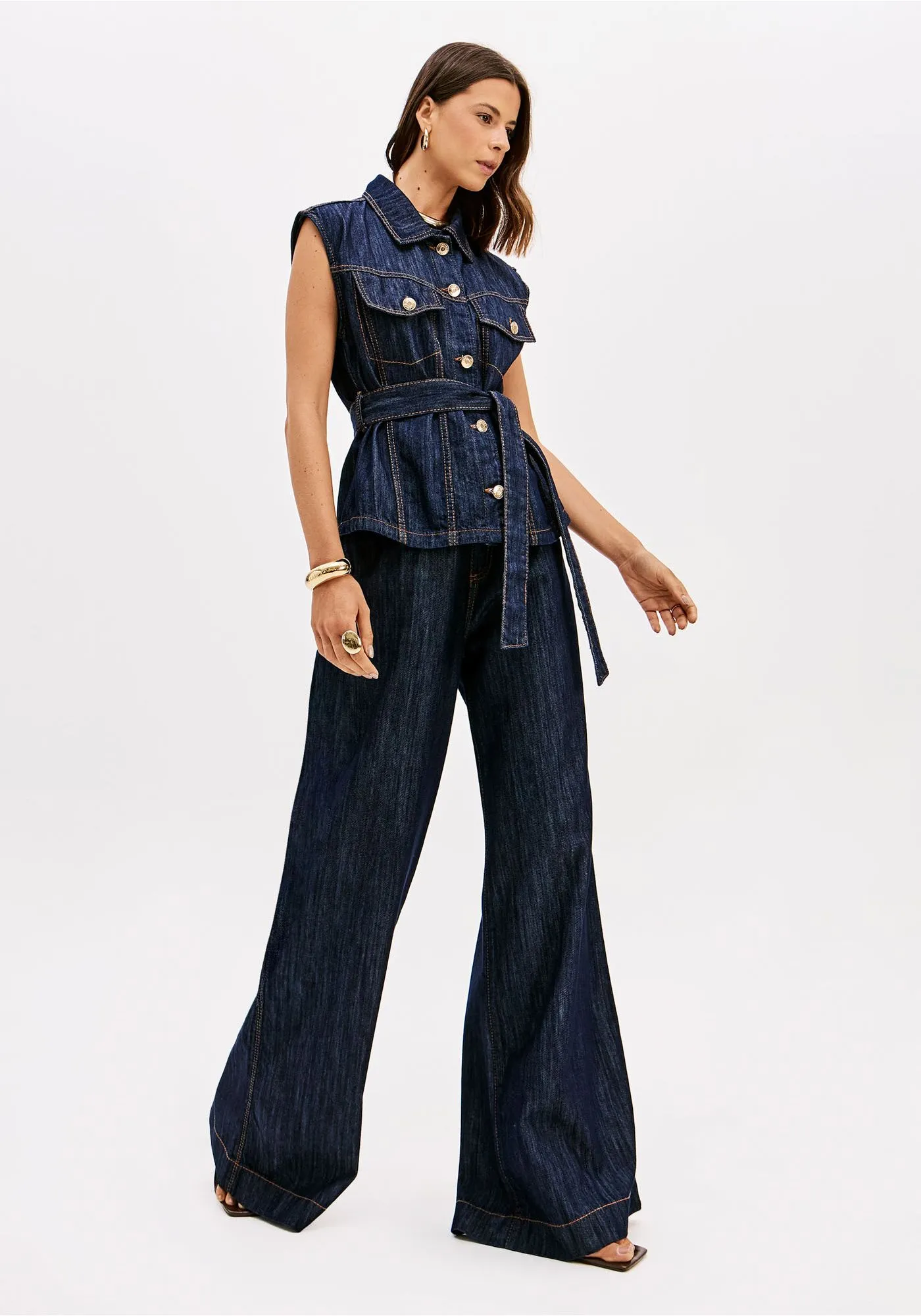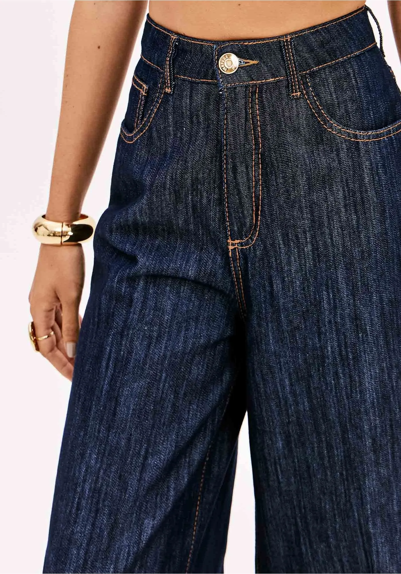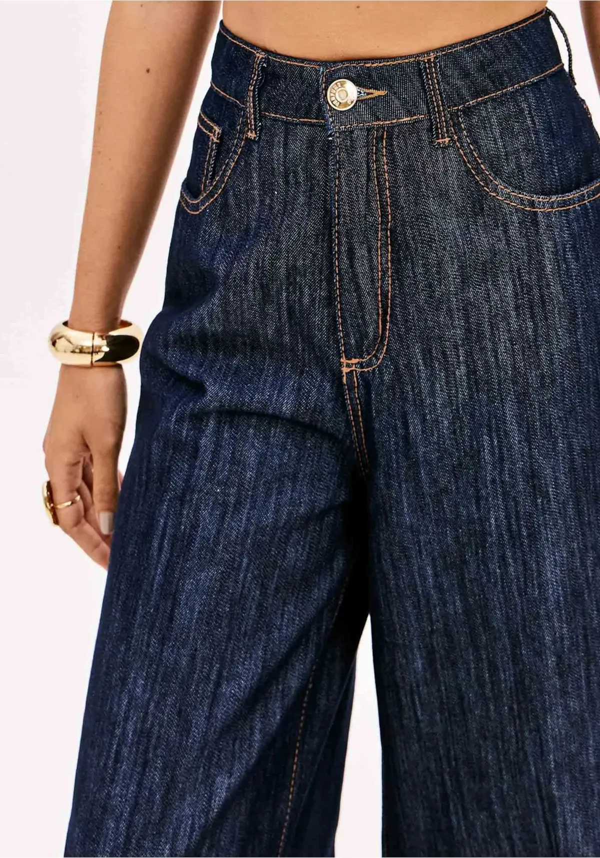 A calça pantalona é feita em jeans sem elasticidade e destaca-se pela modelagem de pernas amplas e soltas que alonga a silhueta. Possui cintura super alta, bolsos funcionais, passantes no cós e fechamento tradicional. Aposta indispensável no closet!