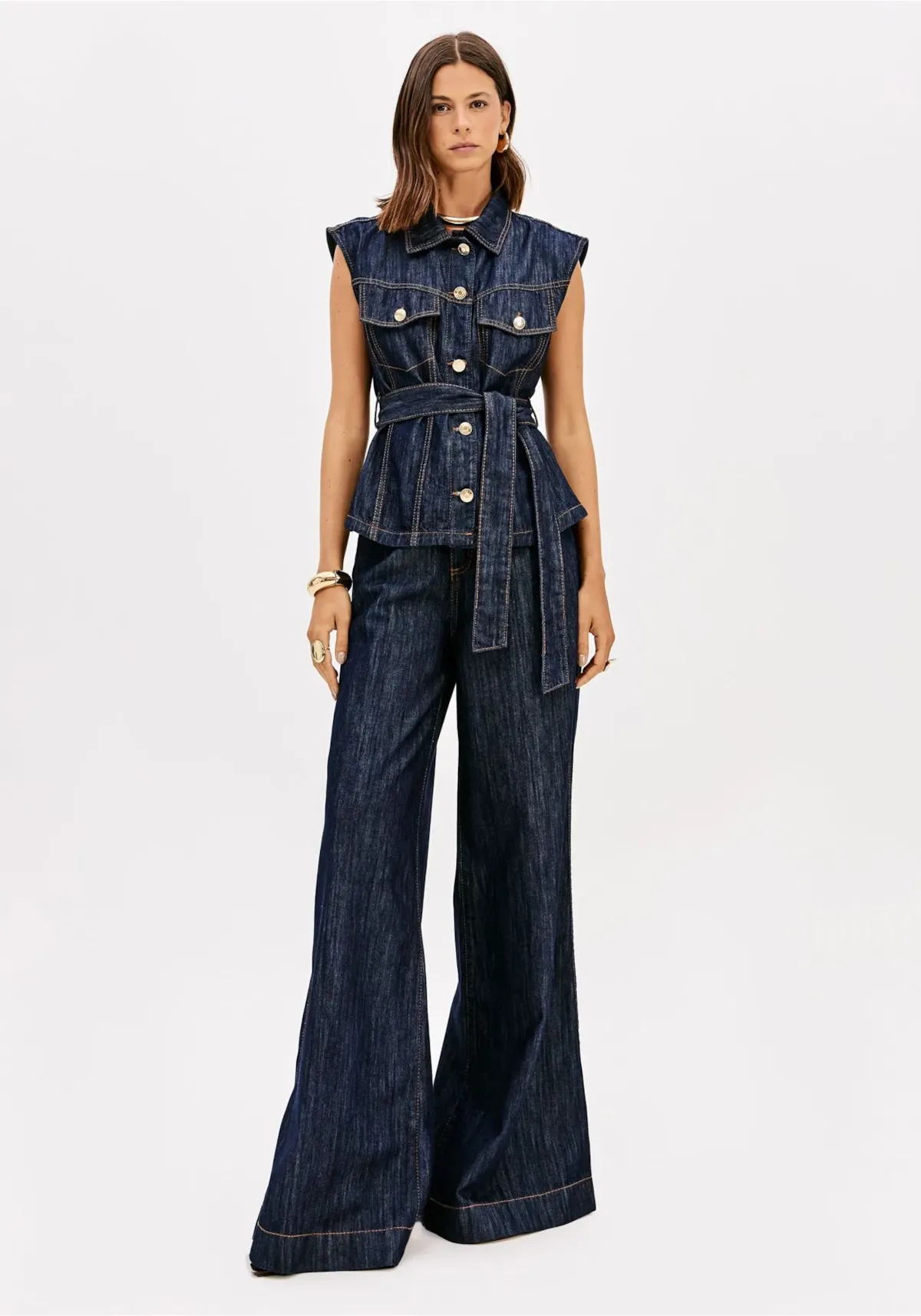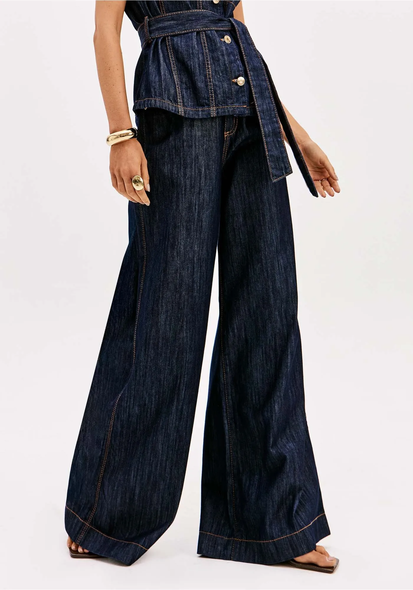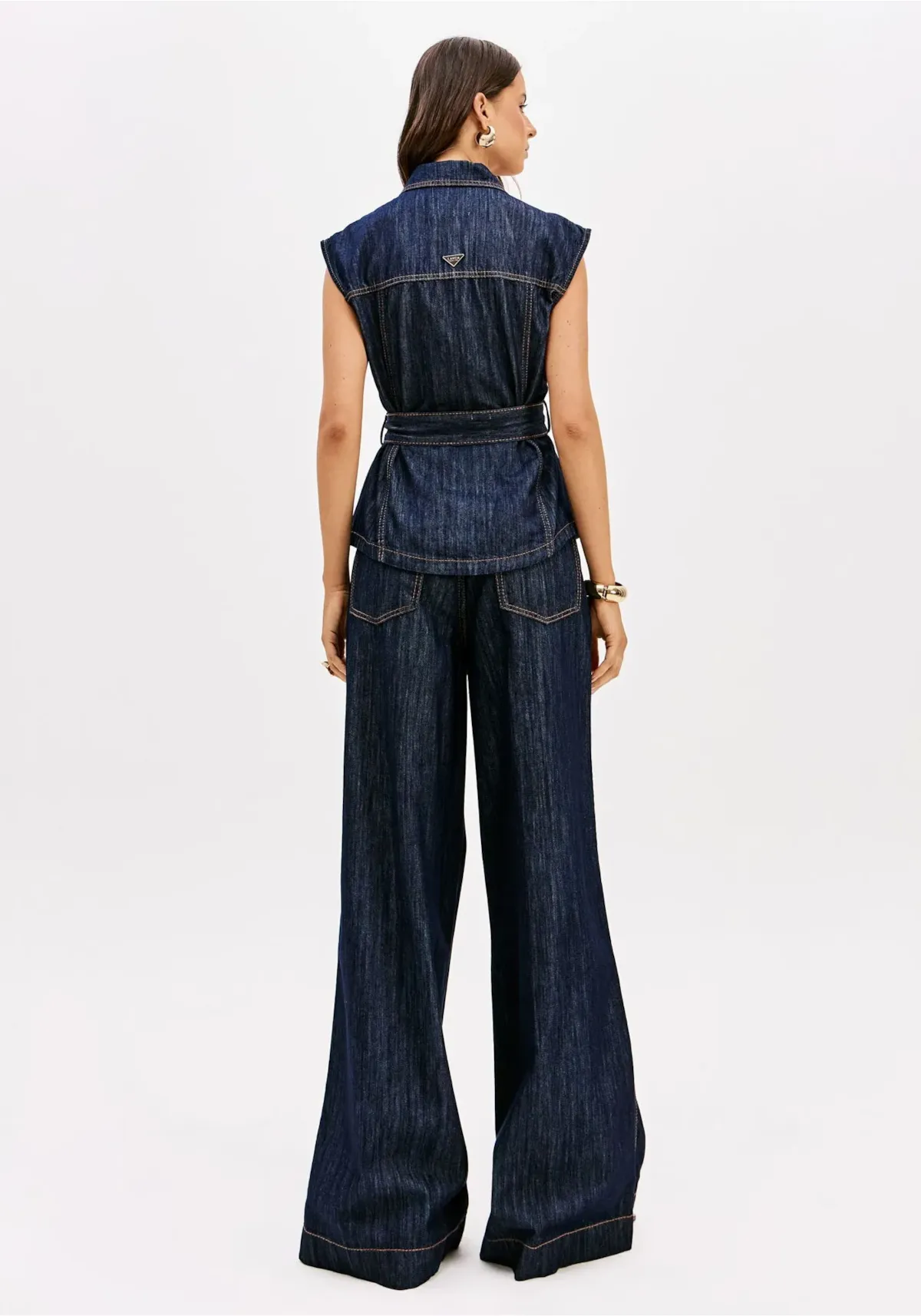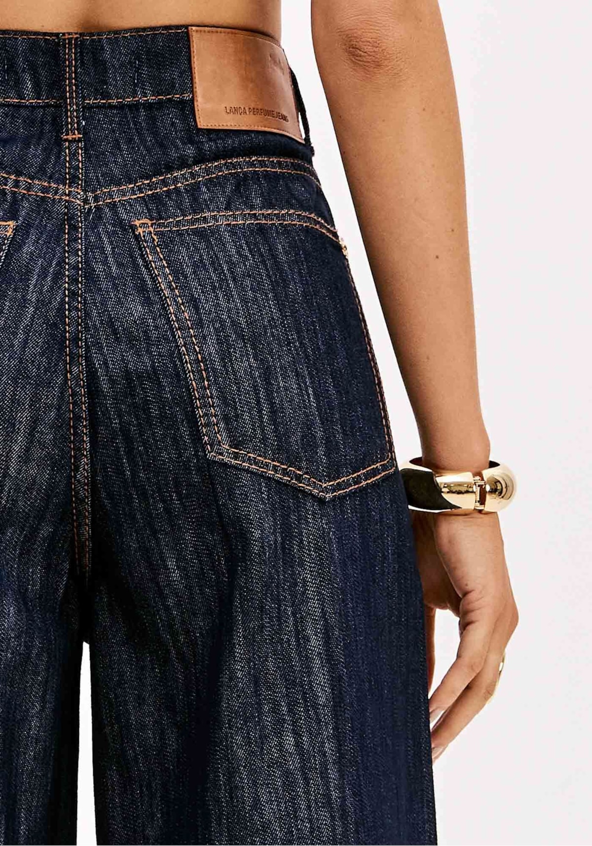 A calça pantalona é feita em jeans sem elasticidade e destaca-se pela modelagem de pernas amplas e soltas que alonga a silhueta. Possui cintura super alta, bolsos funcionais, passantes no cós e fechamento tradicional. Aposta indispensável no closet!