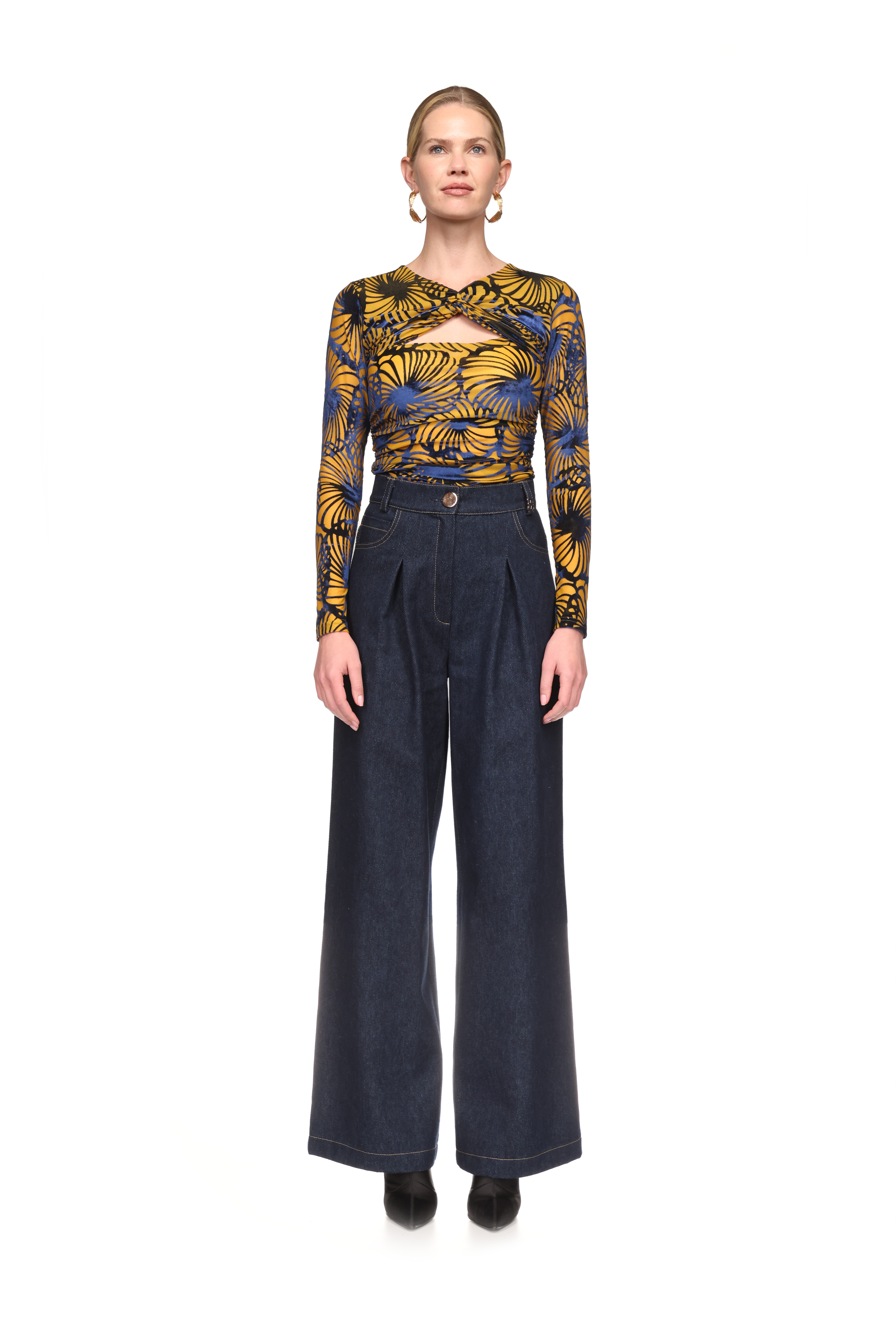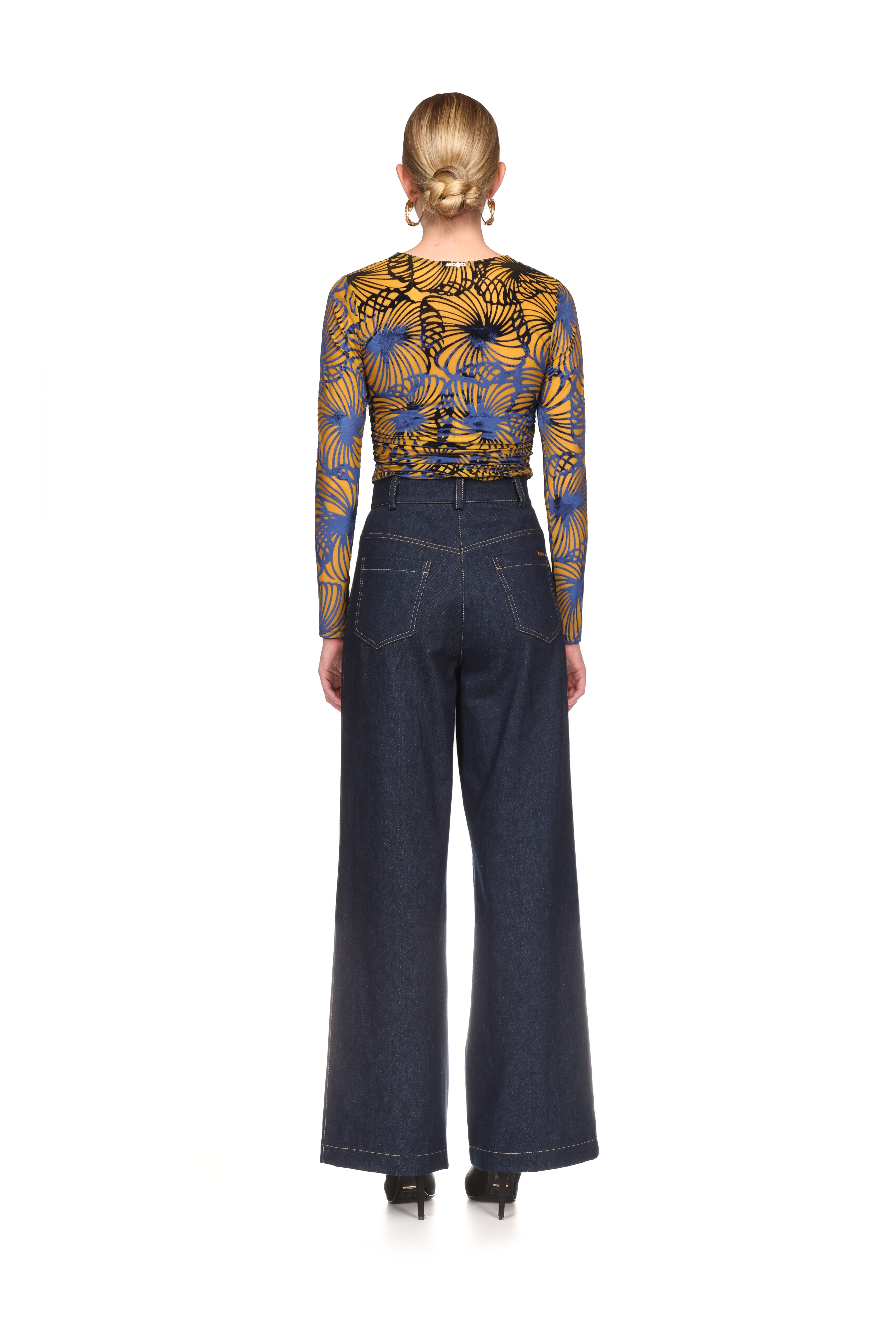 Jeans de cintura alta e cós com presilhas. Modelo wide leg. Cinco bolsos. Pormenor de aplique de joias. Fecho à frente com fecho de correr e botão.