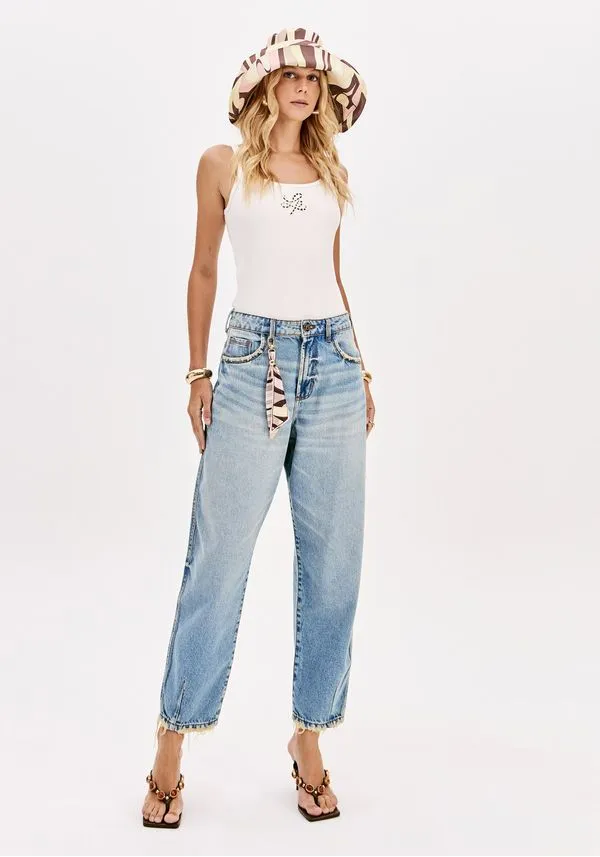 A calça de cintura alta em jeans com elastano traz corte justo do quadril até a barra. Possui bolsos, comprimento encurtado e fechamento frontal por botão e zíper. O bordado lança perfume no cós finaliza o modelo com autenticidade. Invista!
