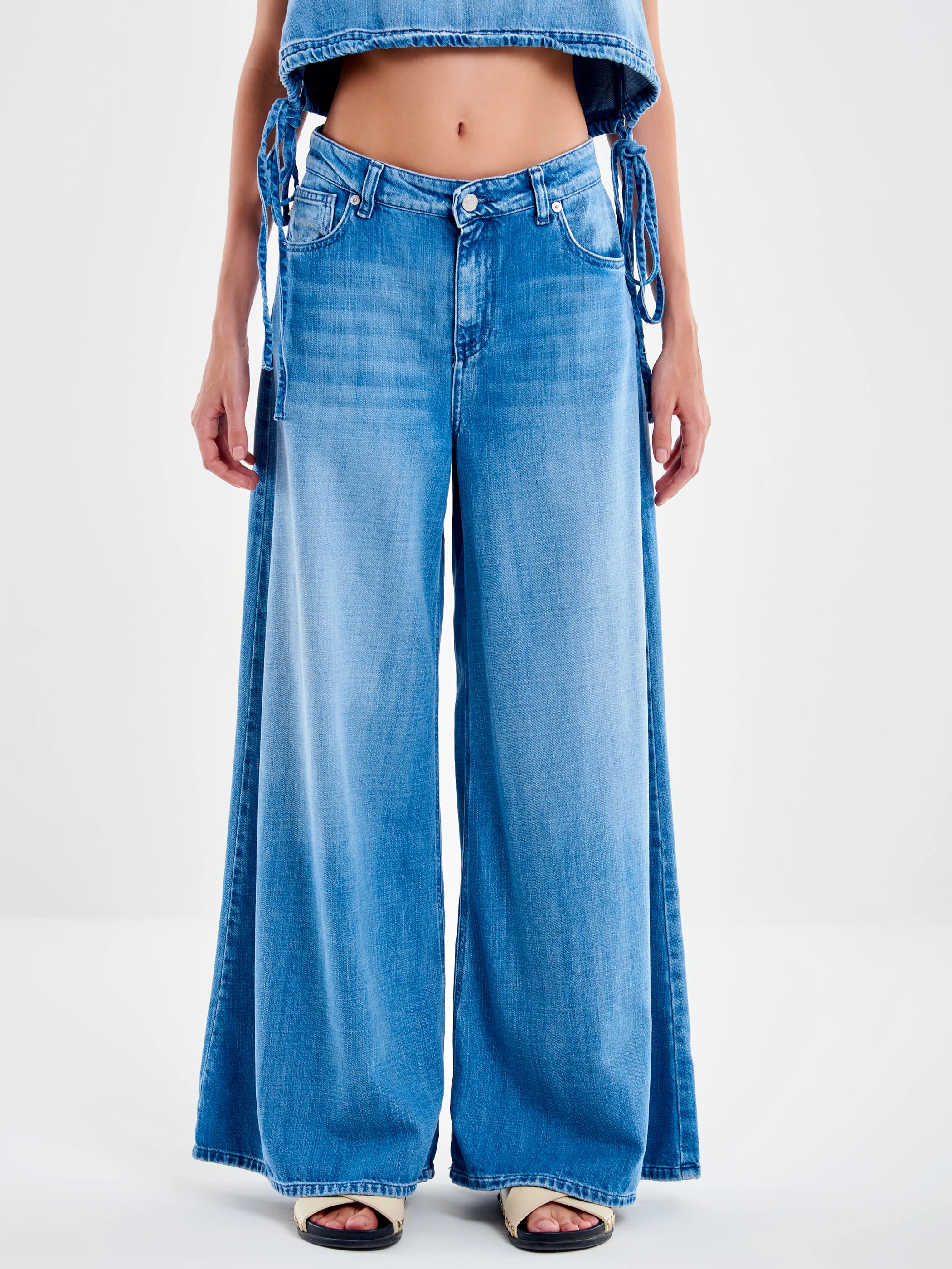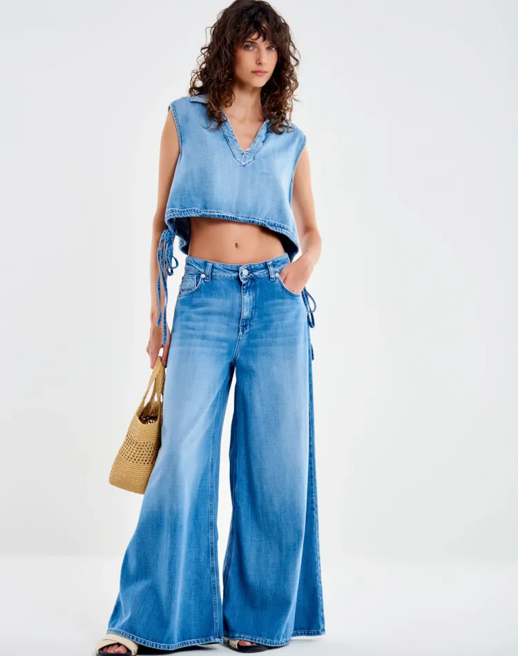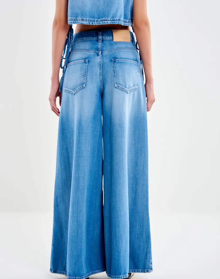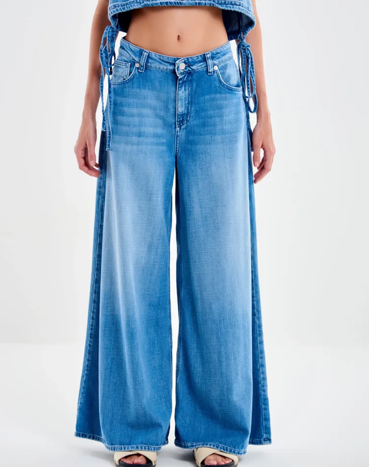 Calça jeans Lucy, perna larga, cintura média. Modelo de cinco bolsos. Fechamento frontal com zíper e botão de metal. Perna longa e larga. Jeans com efeito desbotado.