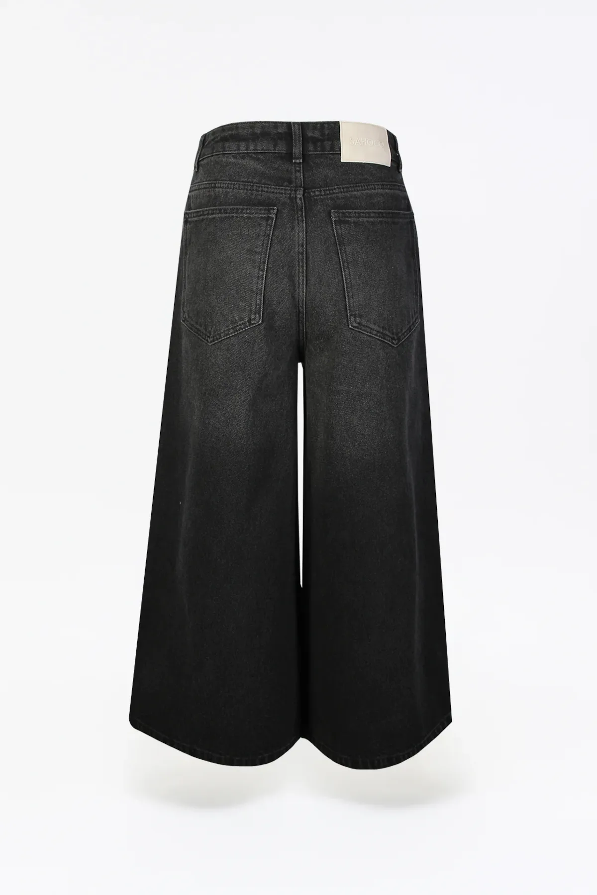 Jeans de cintura subida e cinco bolsos. Perna larga e curta. Fecho frontal com fecho de correr e botão. O denim uniforme reforça o caráter limpo e versátil da peça.