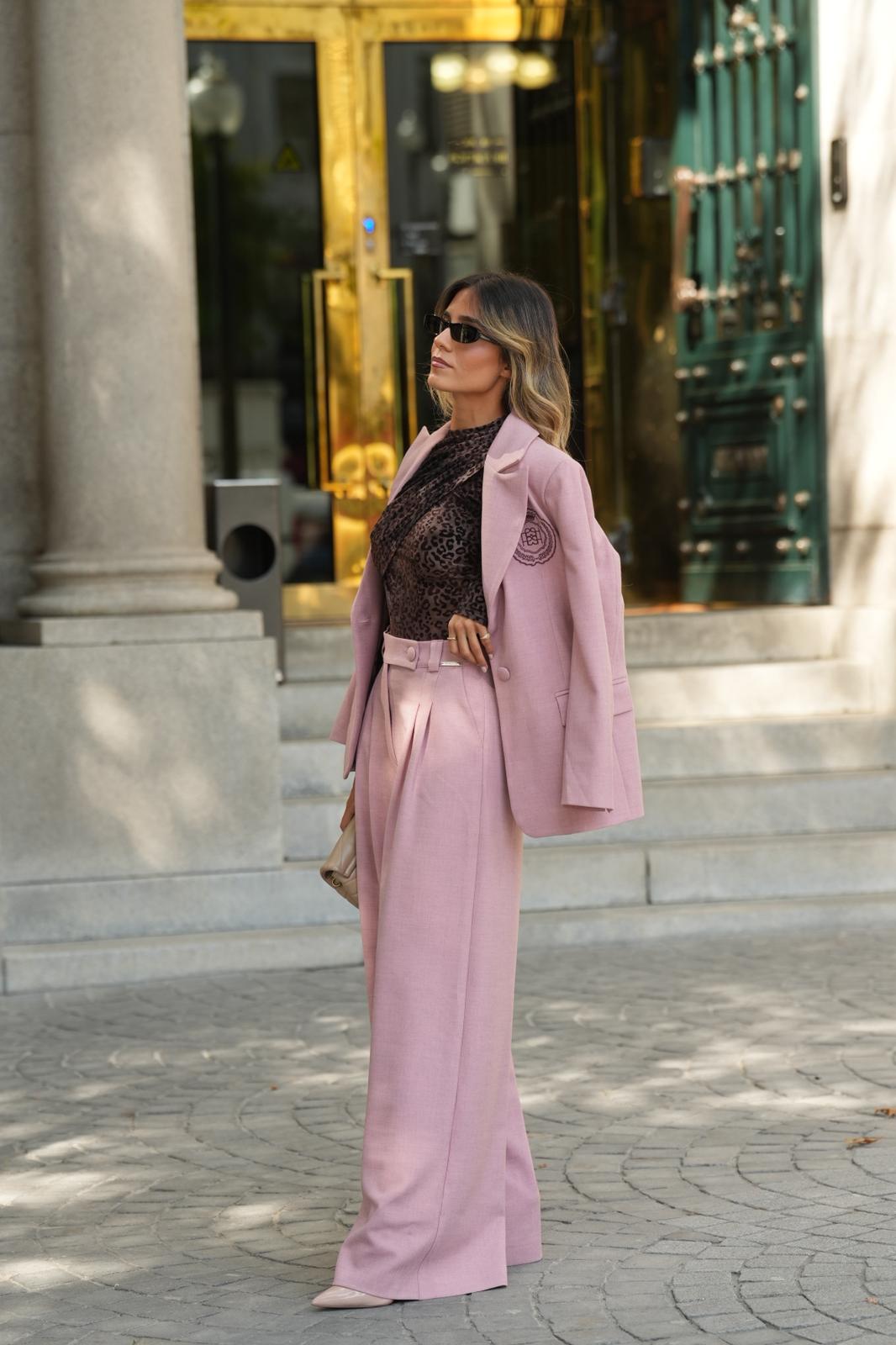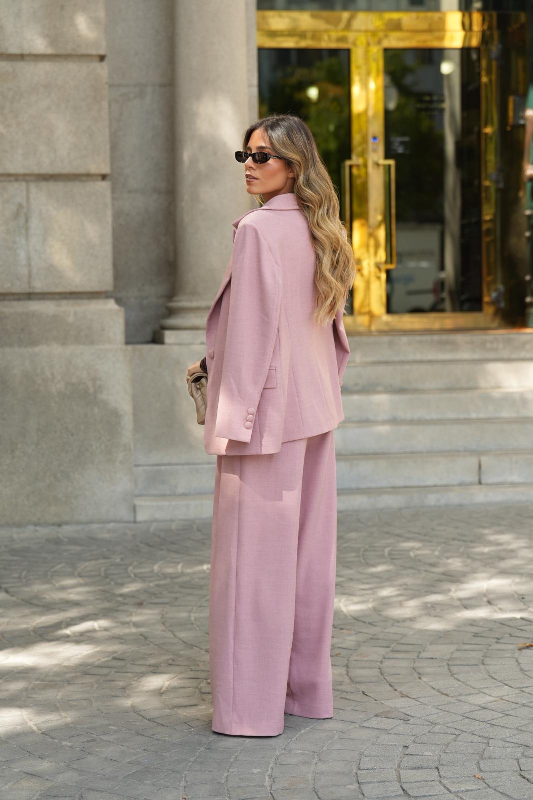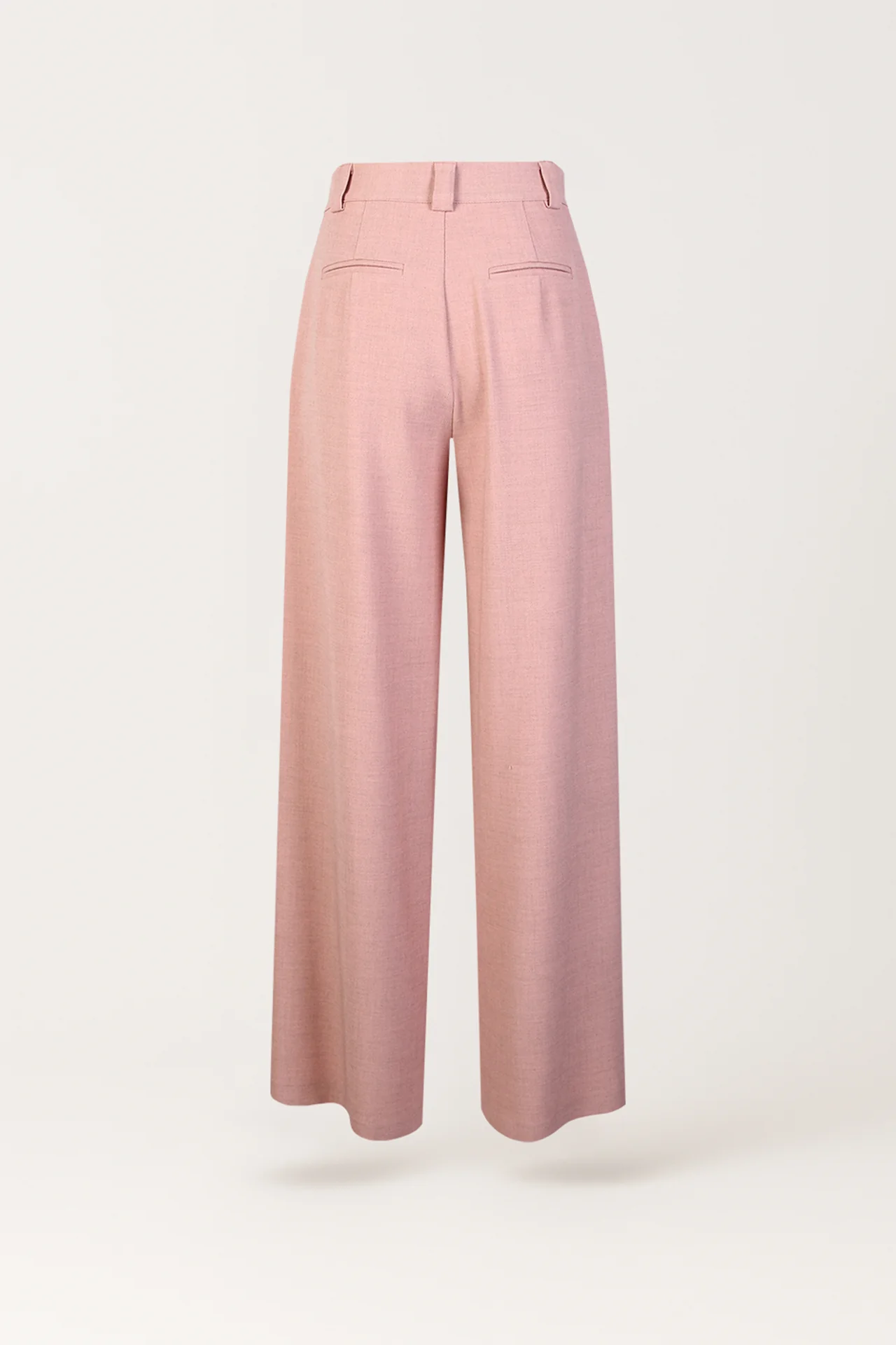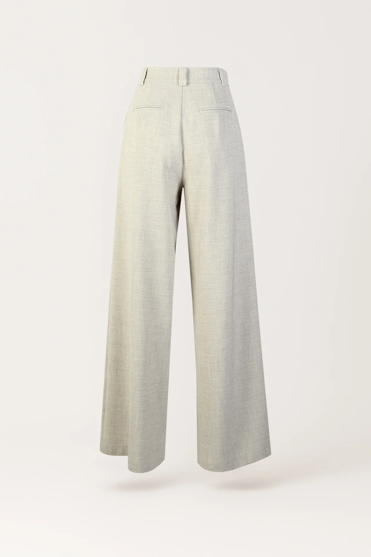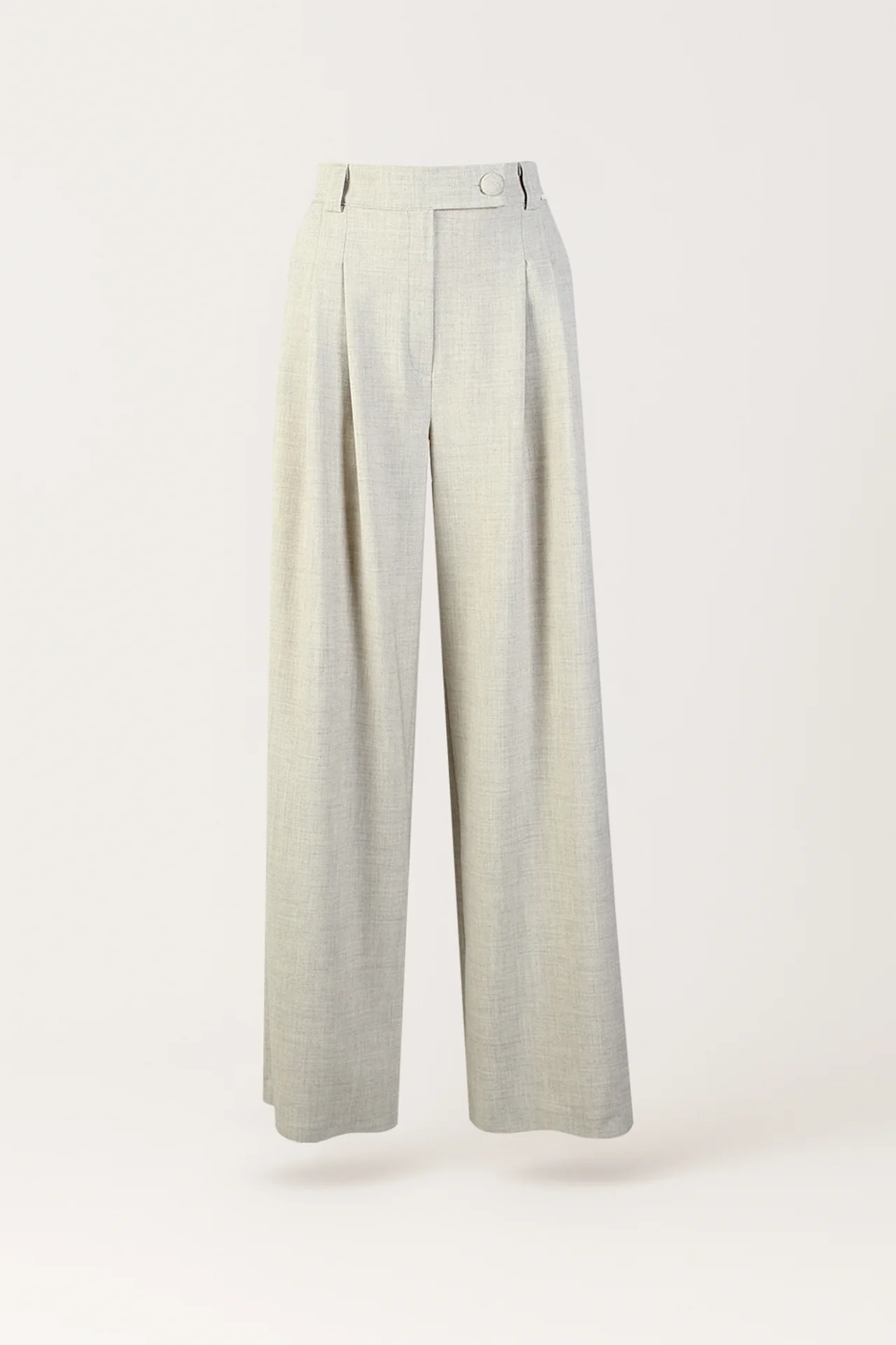 Calças de alfaiataria em tecido compacto e fluido. Cintura média com passantes, pregas frontais e botão forrado. Bolsos à frente e bolsos falsos com vivos atrás. A perna larga prolonga a linha visual, mantendo leveza no movimento.