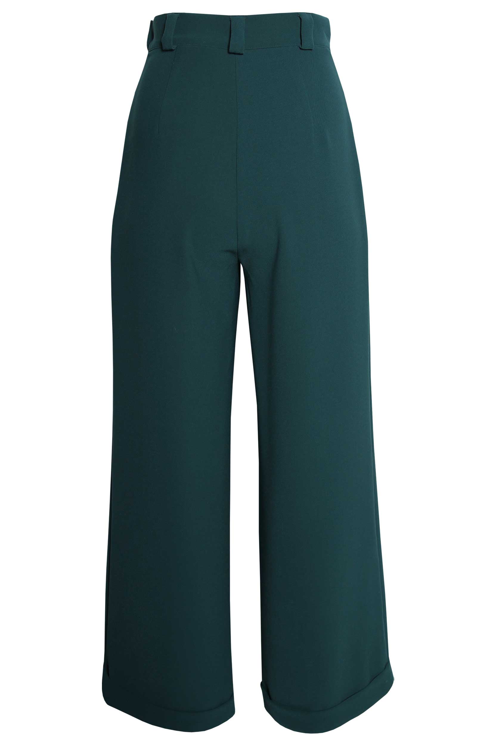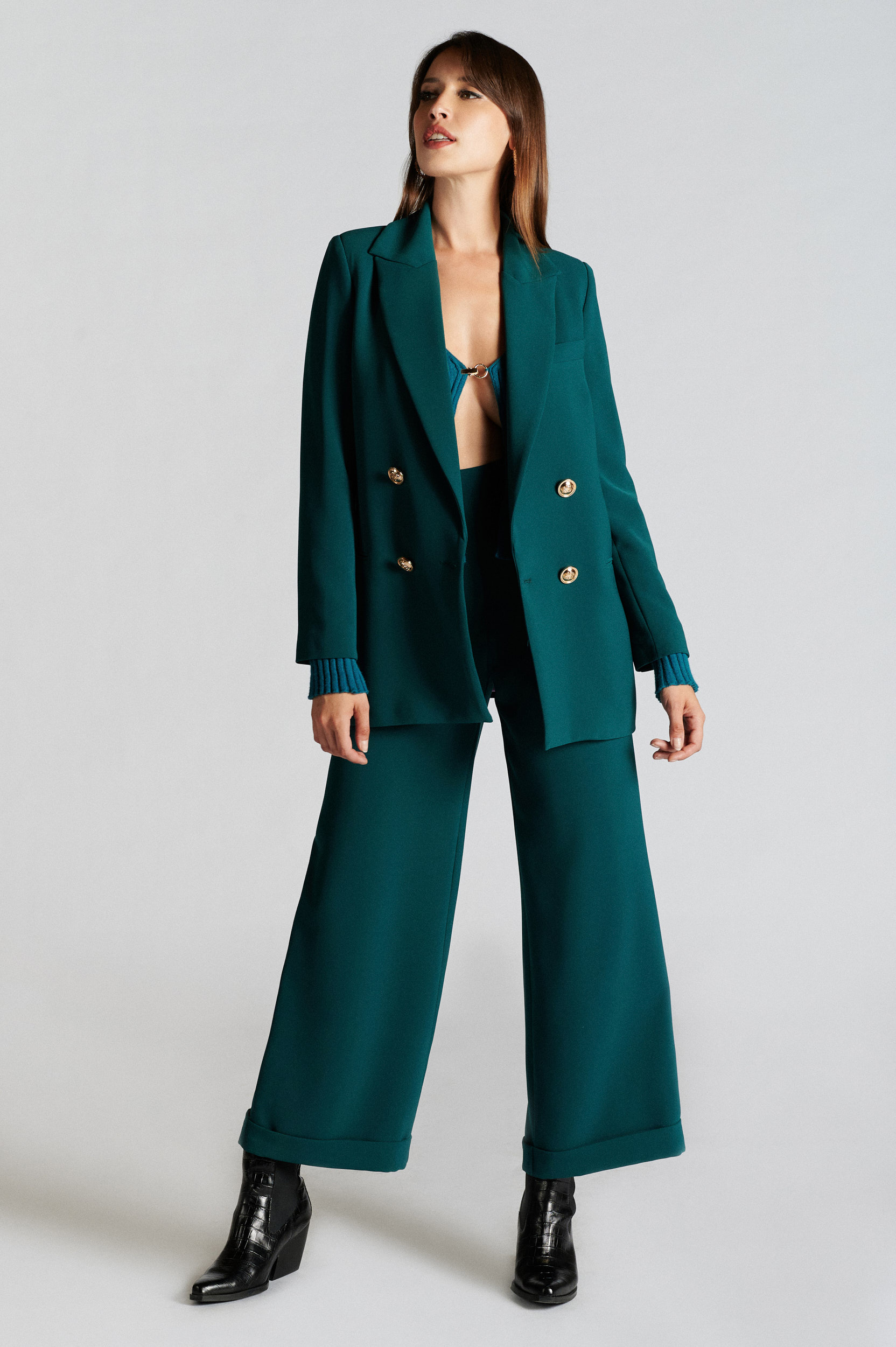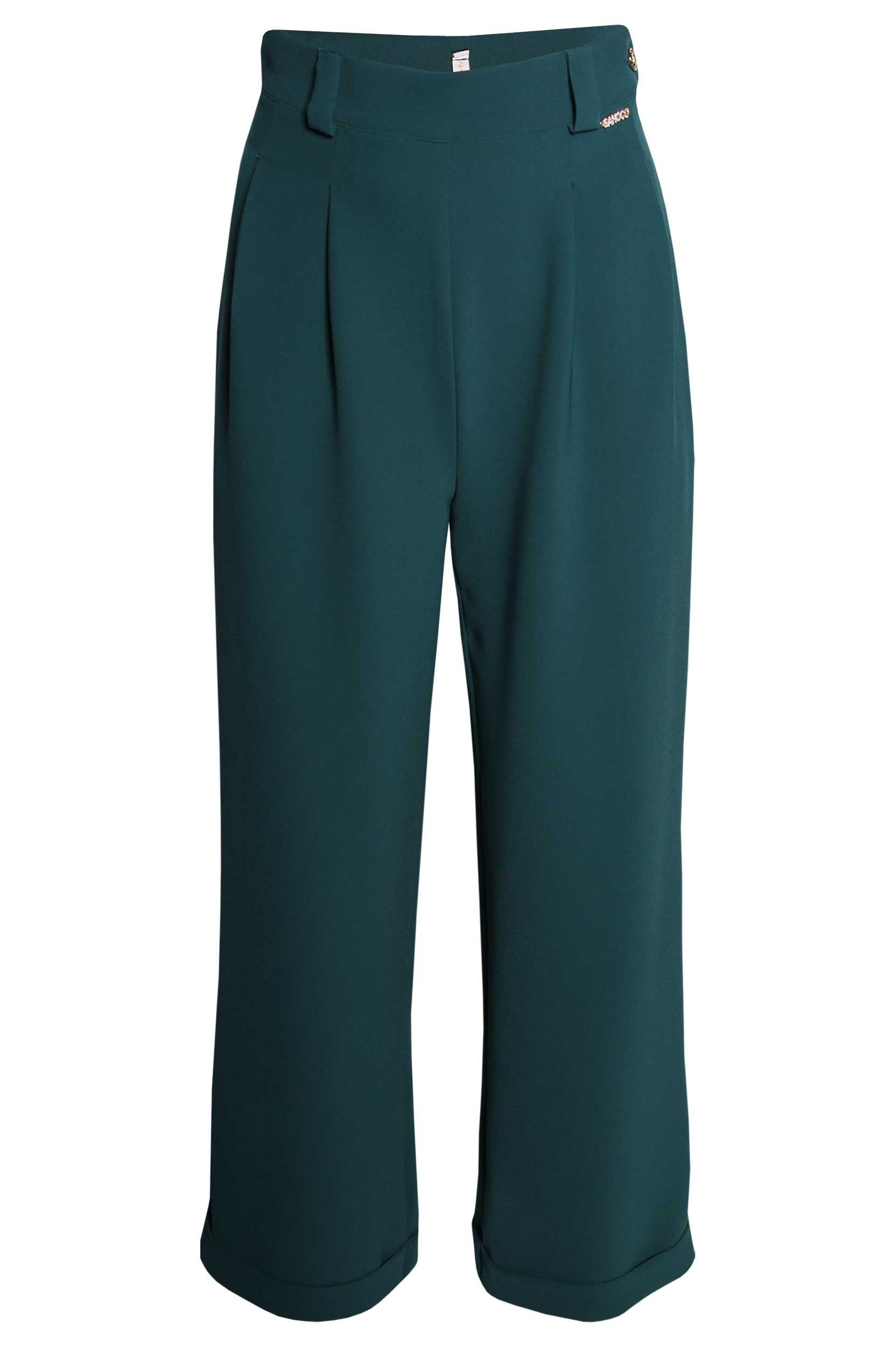 Calças de alfaiataria de cintura subida, corte pantalona com virola e pinças. Bolsos laterais. Abertura lateral com fecho de correr e botão.