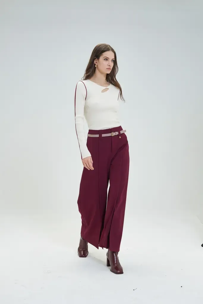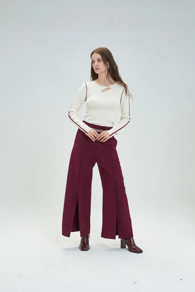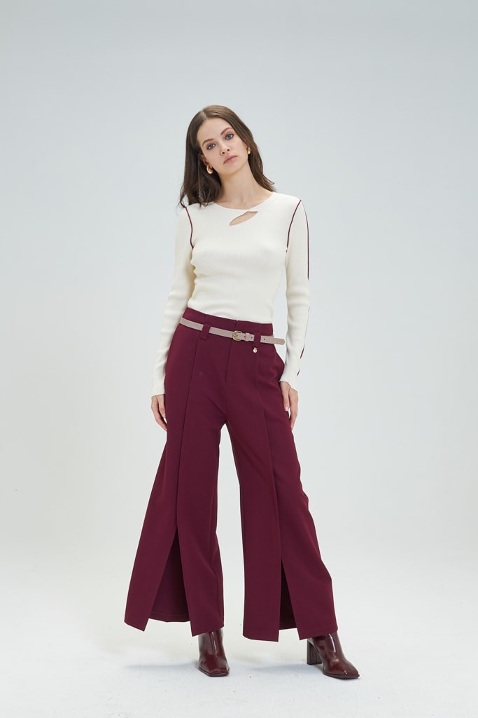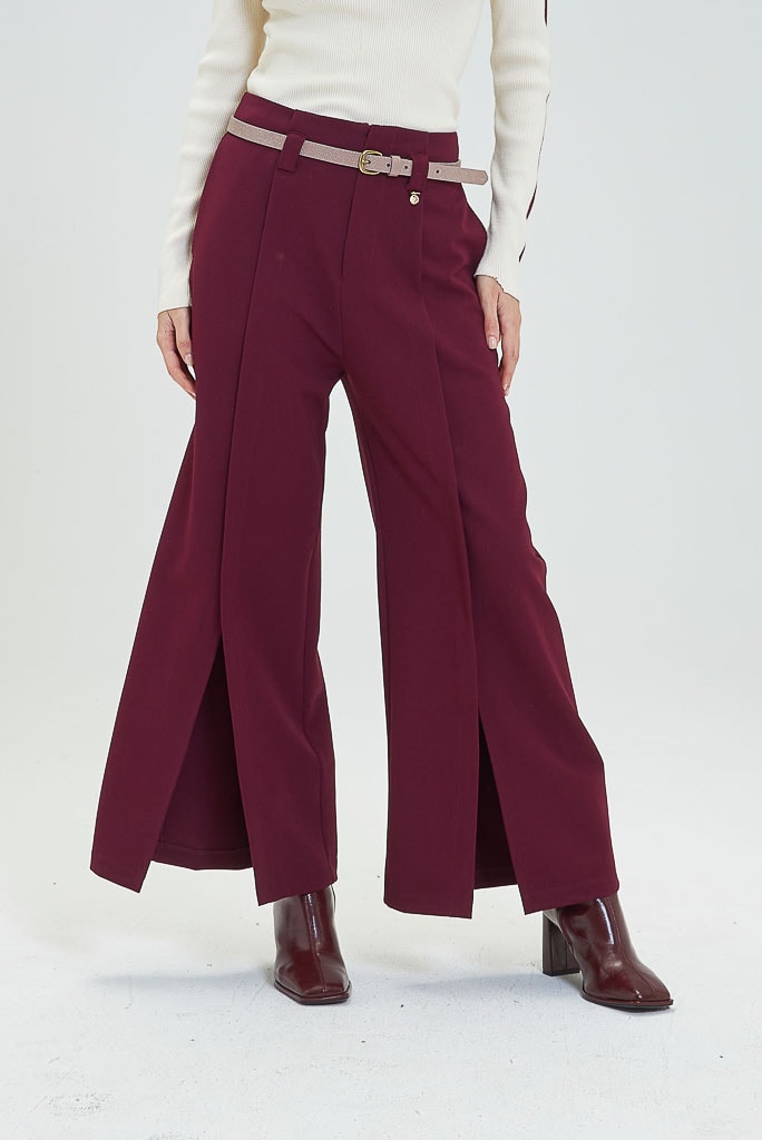 Calça palazzo com rachas centrais. Design de pernas largas e caimento fluido. Cós com detalhe de cinto decorativo. Rachas frontais para um look dinâmico. Tecido estruturado e elegante. Fecho frontal por zíper e botão.