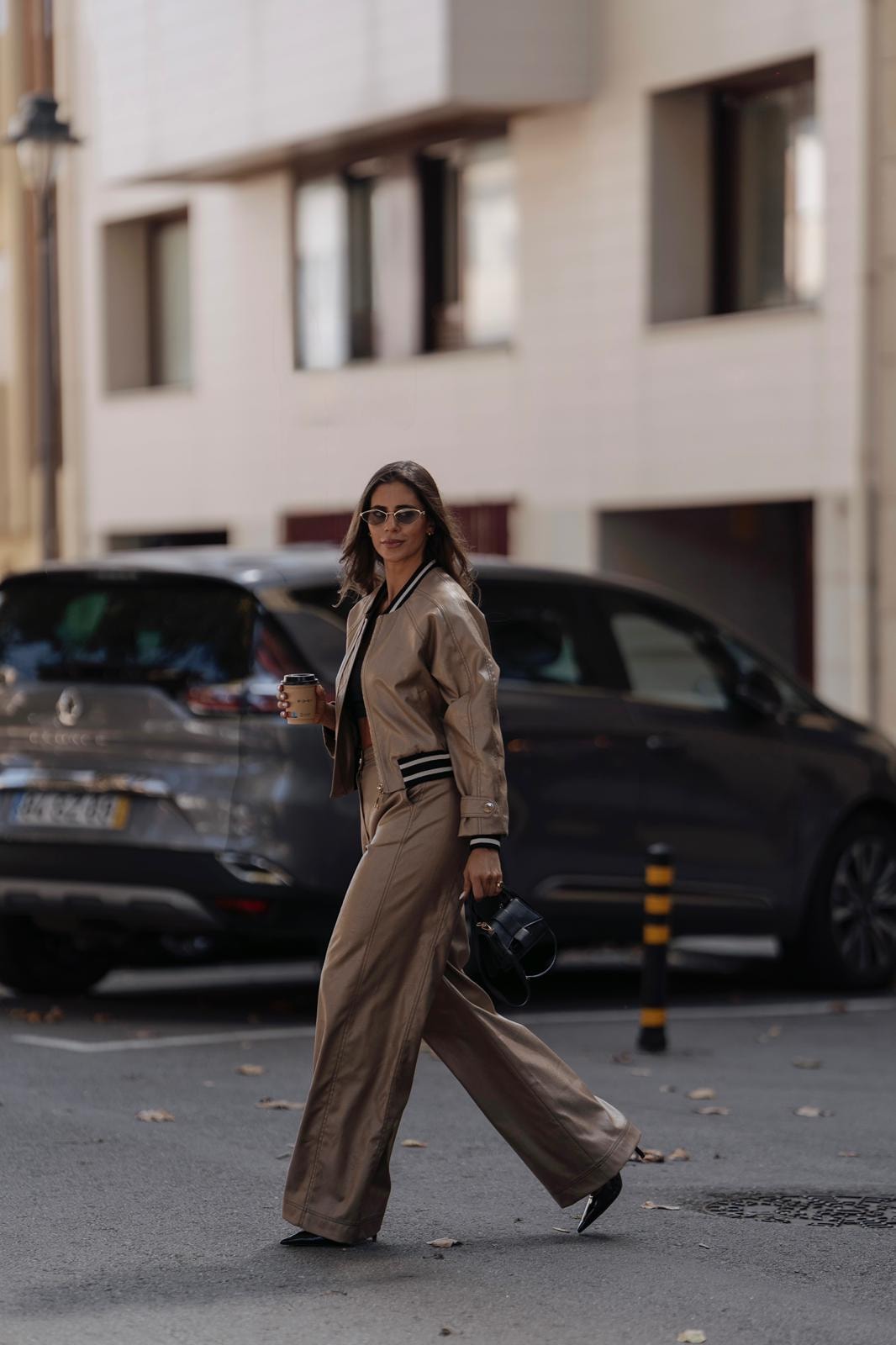 Calças Sahoco em eco pele de toque macio e brilho subtil, com cintura subida e corte reto. O design minimalista é valorizado pelo acabamento impecável e pelo conforto do material, que oferece estrutura sem rigidez. Apresentam fecho frontal com botão metálico personalizado e bolsos laterais discretos.