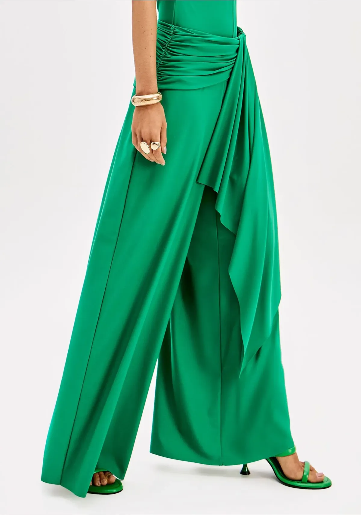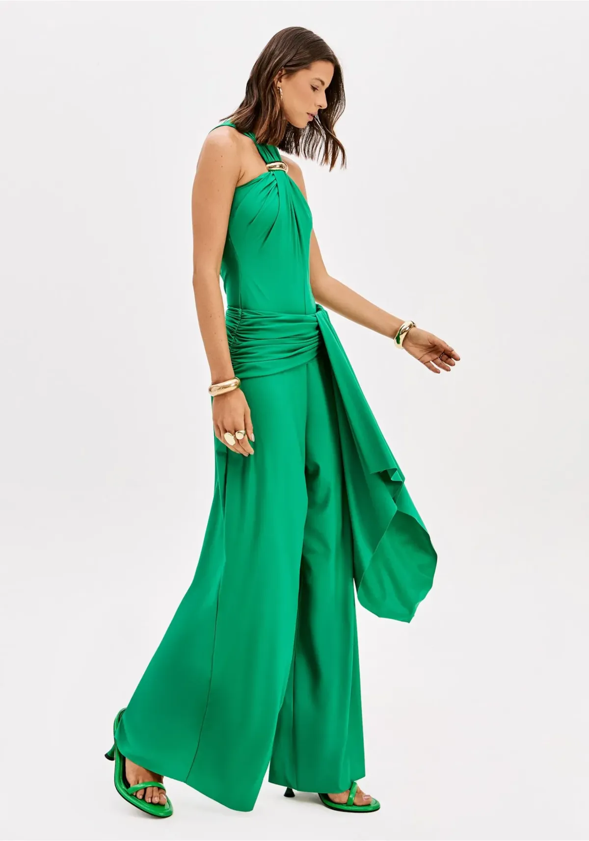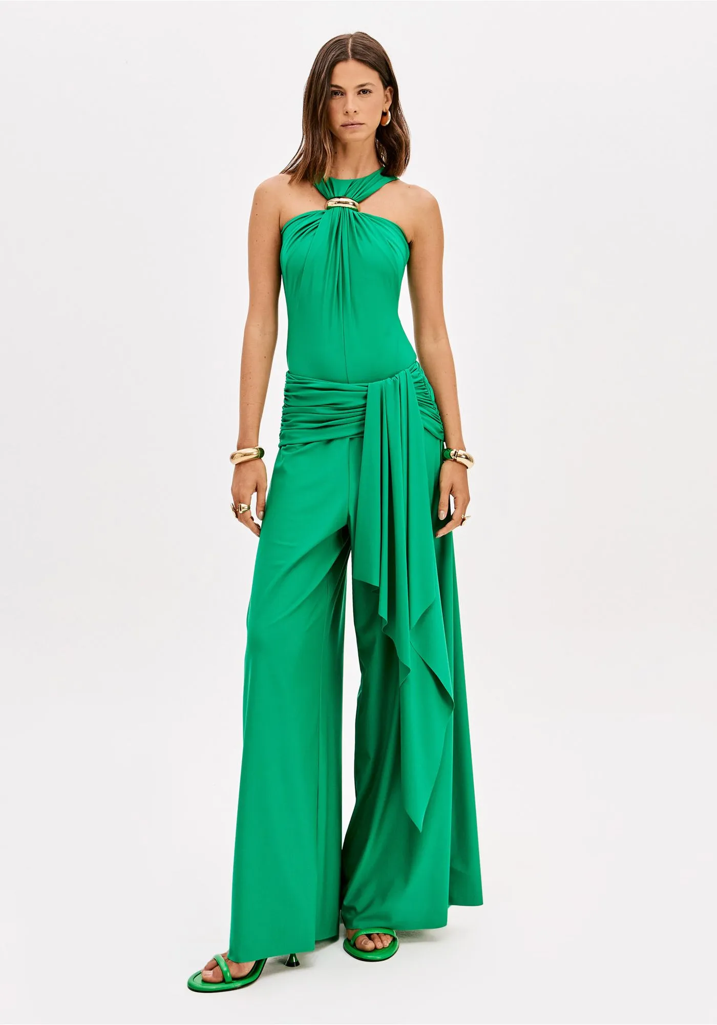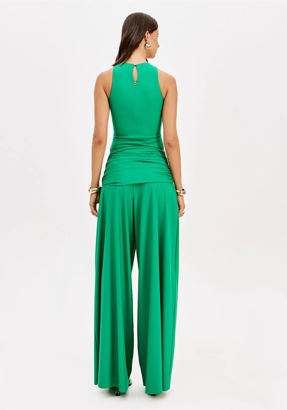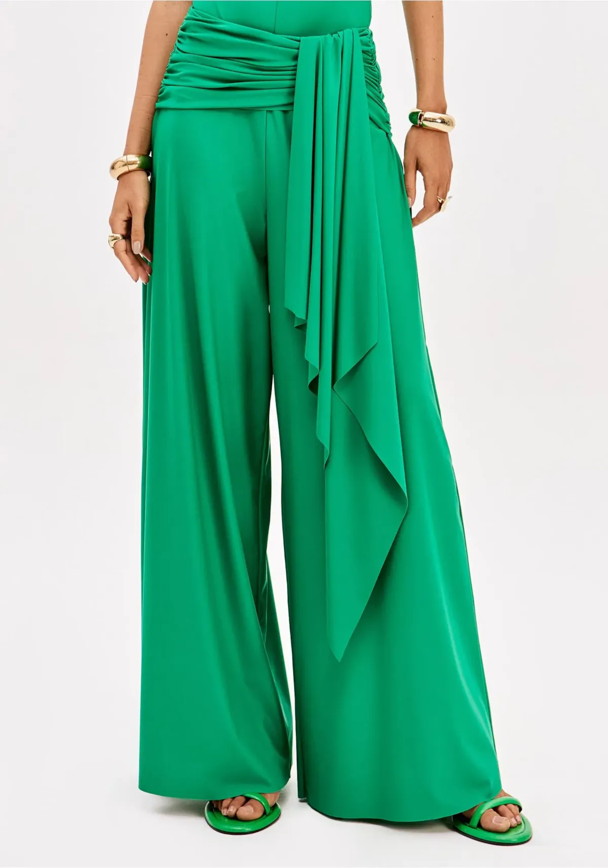 A calça pantalona confeccionada em malha leve apresenta cintura alta, barras cortadas a fio e caimento fluido. Os franzidos no quadril aliados à faixa sobreposta adicionam charme extra. Combine com body lp e crie composições únicas!