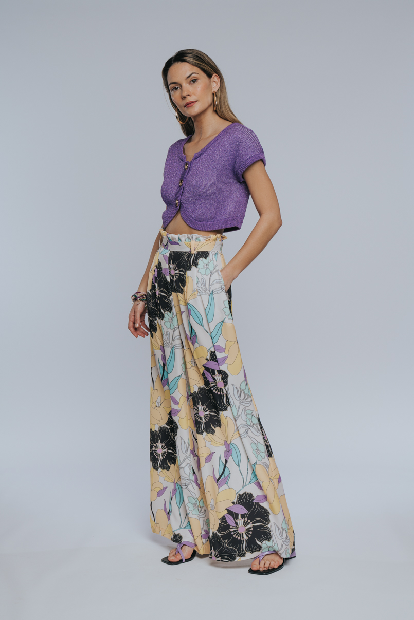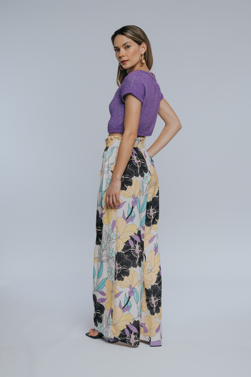 Calças estilo pantalona de cintura subida com presilhas e folho na cintura. Bolsos laterais e fecho mediante fecho invisível atrás.
