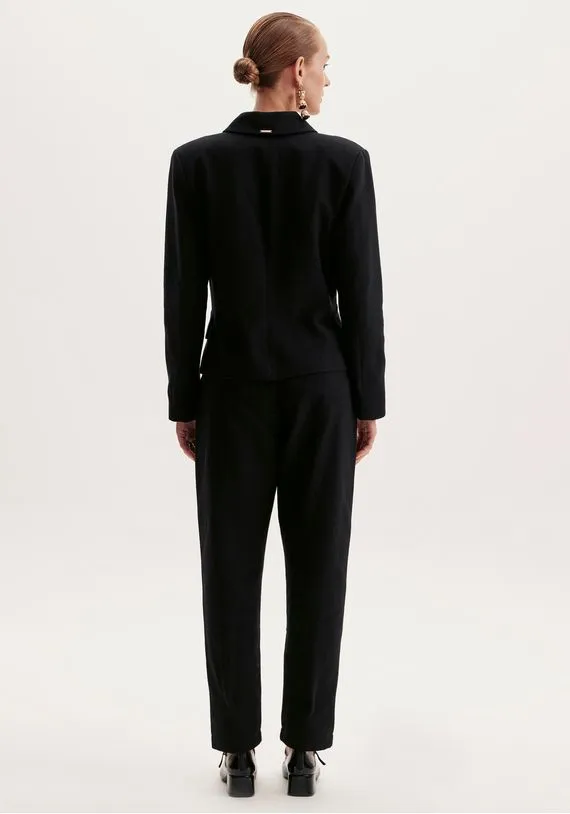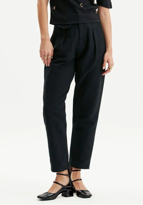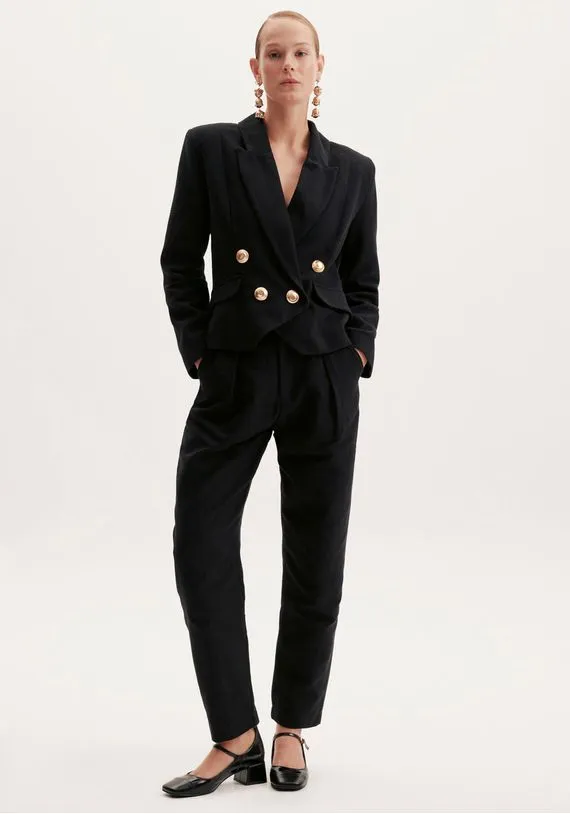 A calça apresenta modelagem carrot, cintura alta e fecho por botão. A peça traz um conceito de elegância e naturalidade no look, ideal para compor com o blazer de mesmo tecido. Aposte!