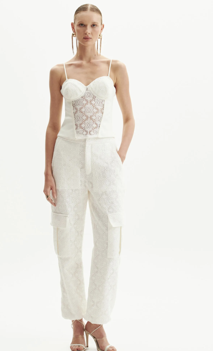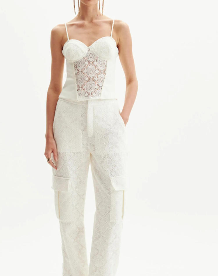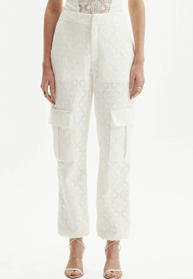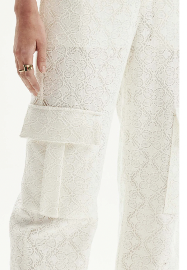 calça feminina possui cintura média, bolsos tipo cargo e caimento confortável. A modelagem ampla e o delicado tecido rendado conferem um toque de charme e romantismo às composições casuais. Use com salto e irradie sofisticação!