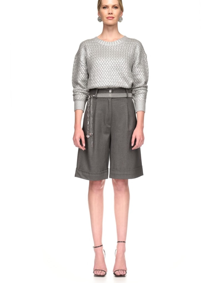 Calções bermuda de alfaiataria pelo joelho. Cintura subida com pinças à frente. Bainha terminada em dobra. Fecho frontal com botões e fecho de correr oculto na costura .