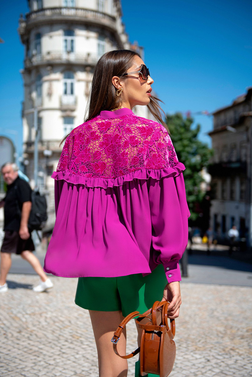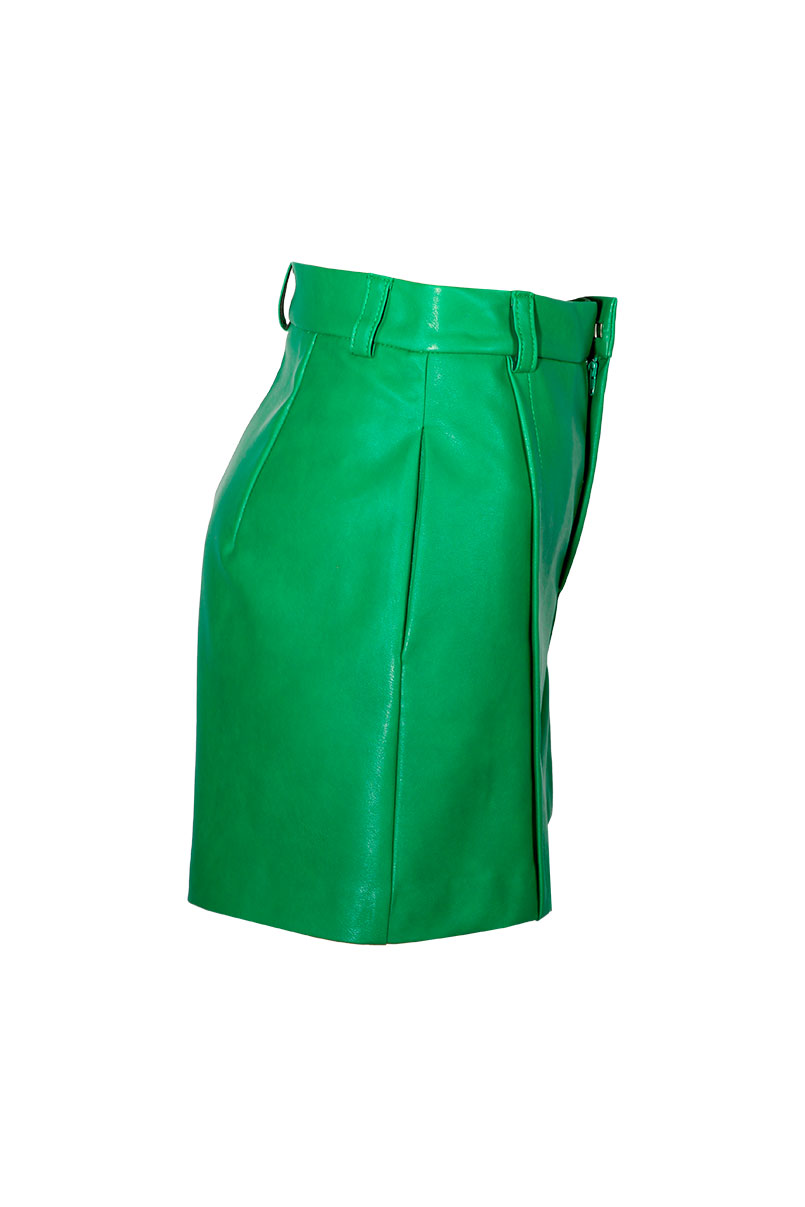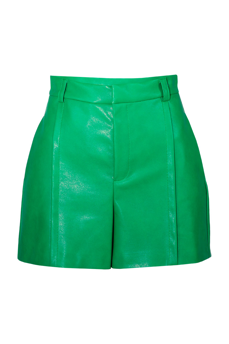 Calções de cintura subida efeito pele com bolsos à frente. Fecho de correr oculto na costura.
