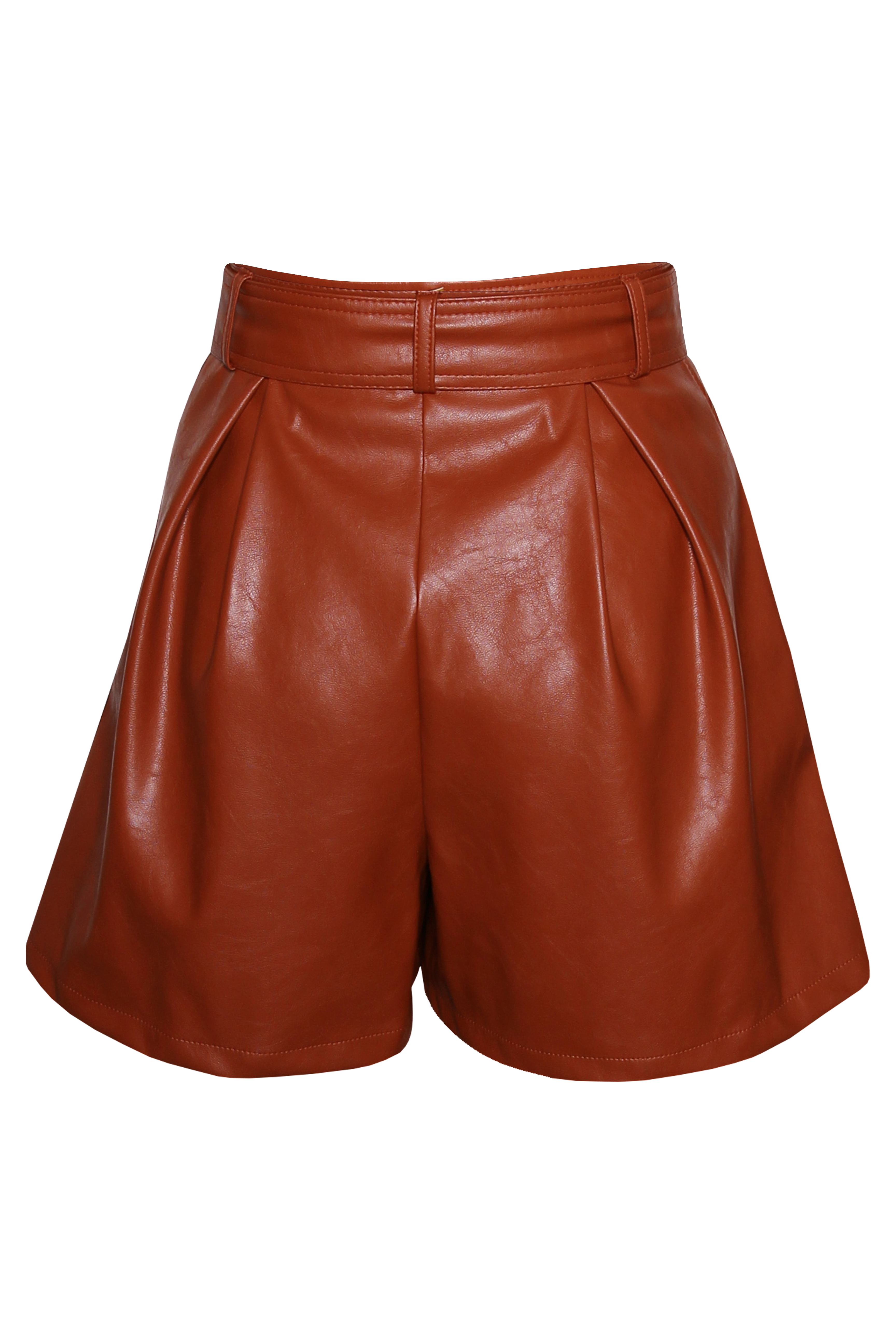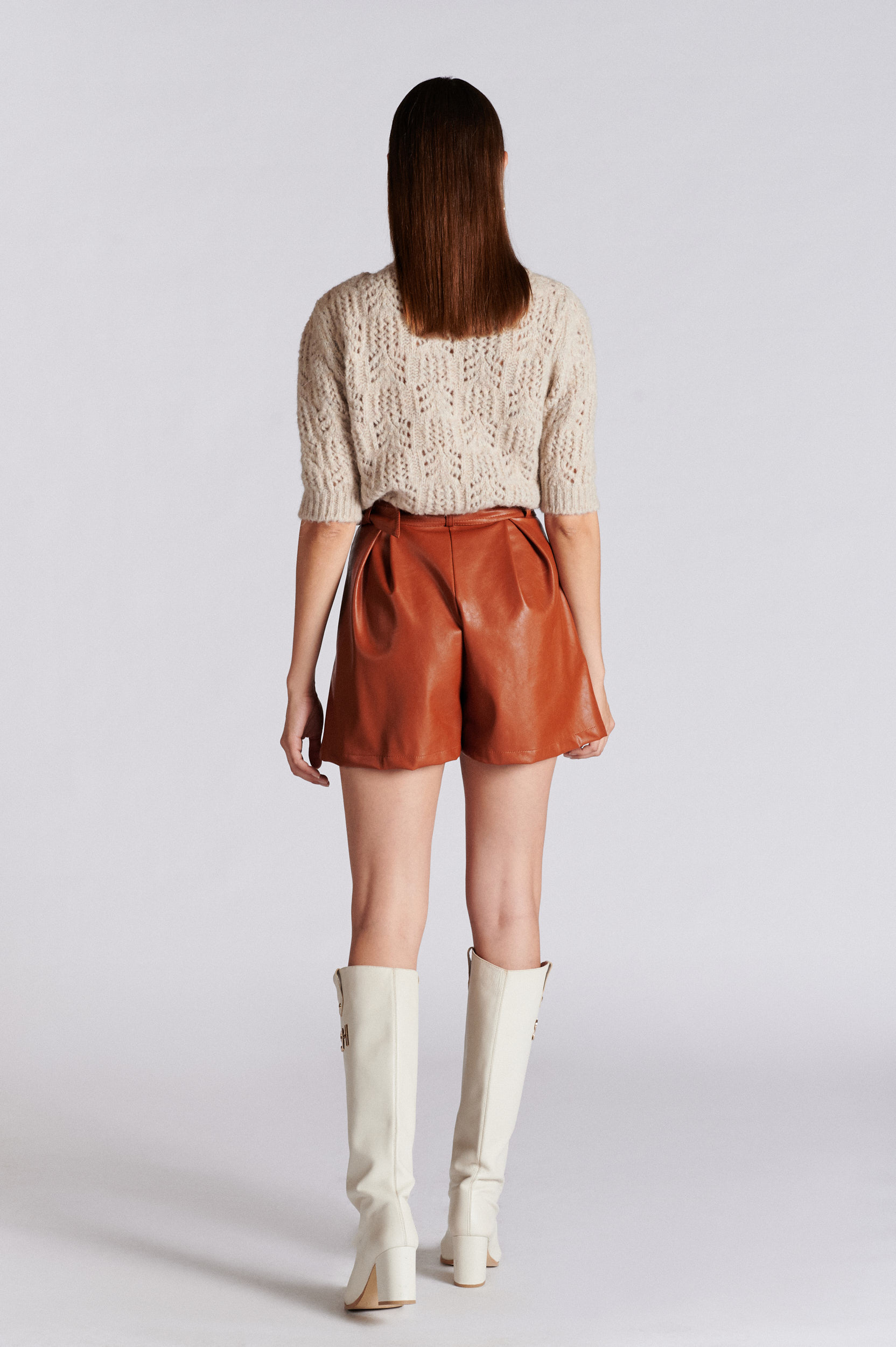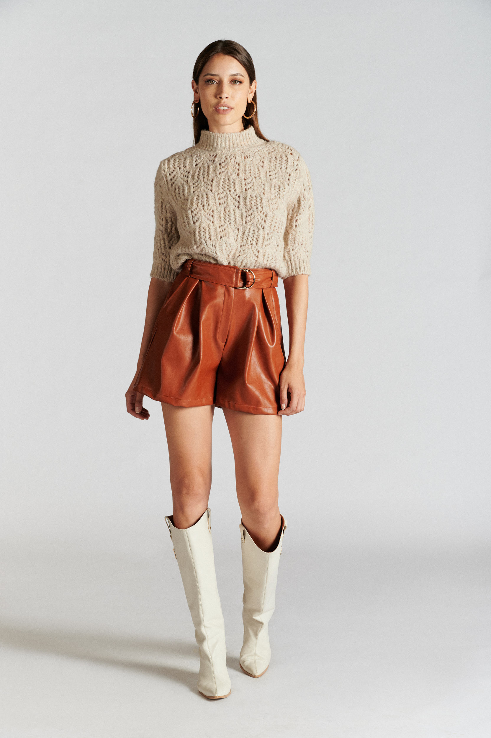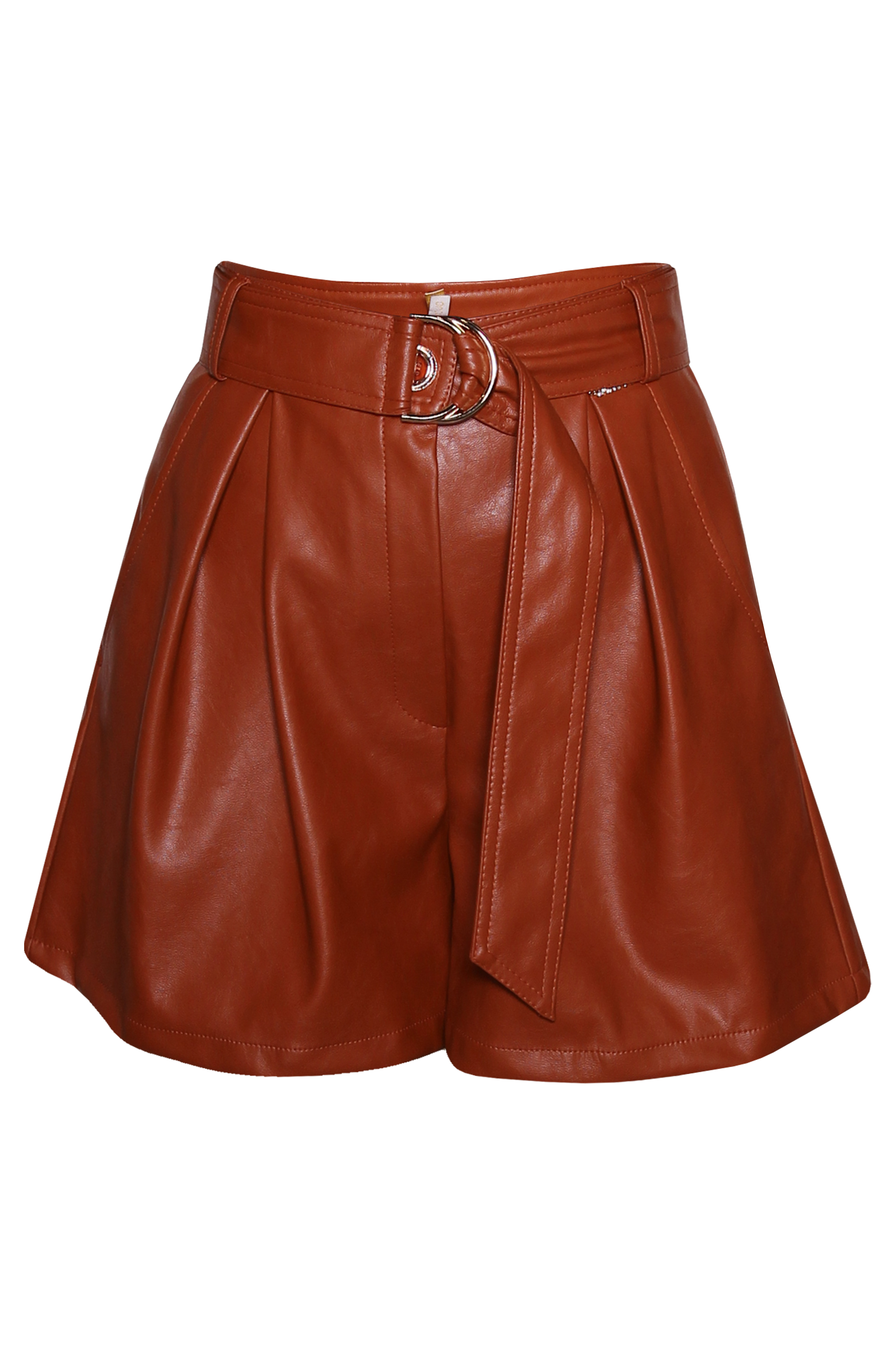 Calções em napa de cintura subida com cinto no mesmo tecido. Cinto com detalhe de fivela metálica. Pregas na frente e costas da peça. Fecho com fecho de correr e botão.