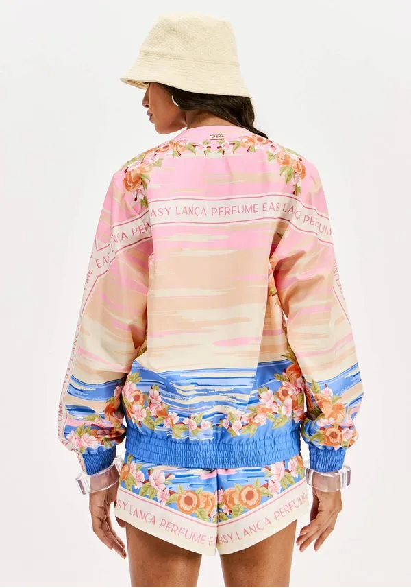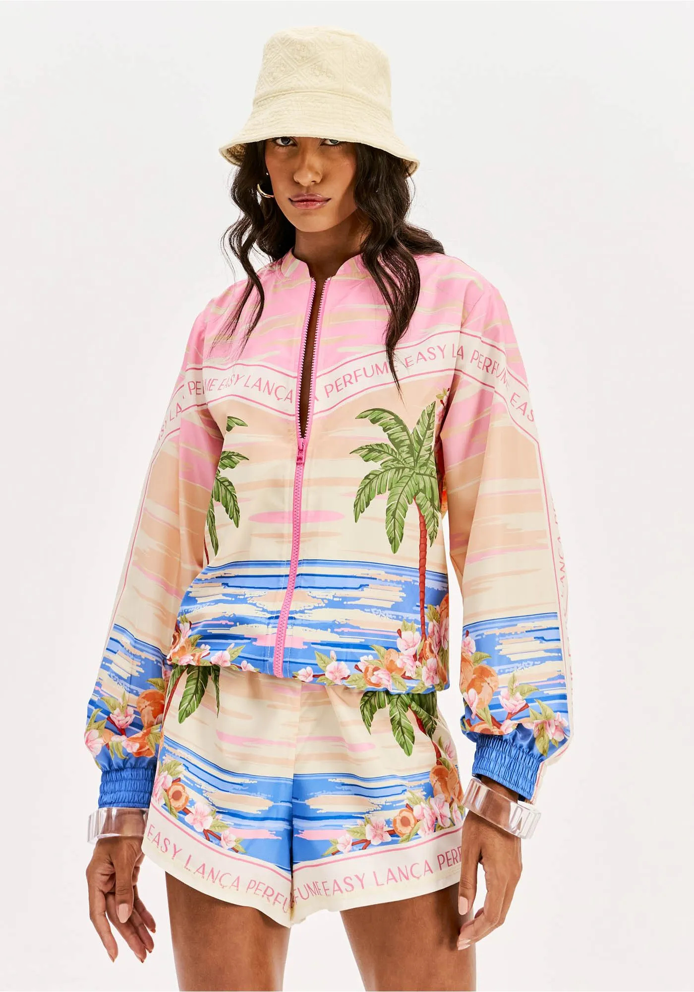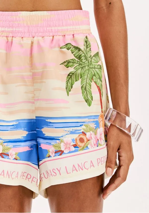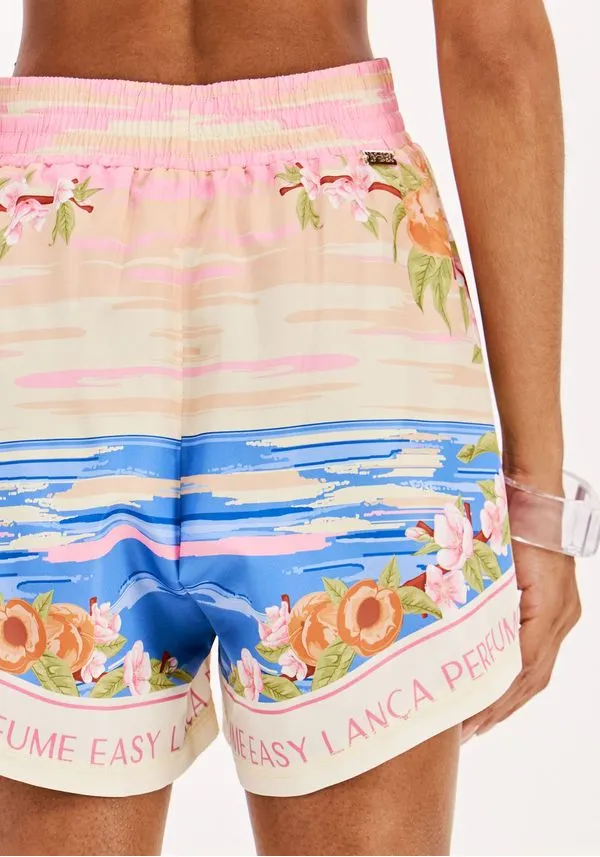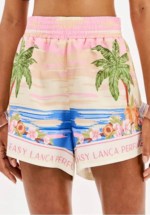 com print tropical que traduz o mood fresh sunset, o short de cintura alta tem caimento solto e cós elástico, equilibrando estilo e conforto. A barra personalizada reforça o toque moderno. Combine com regatas e explore combinações cheias de atitude