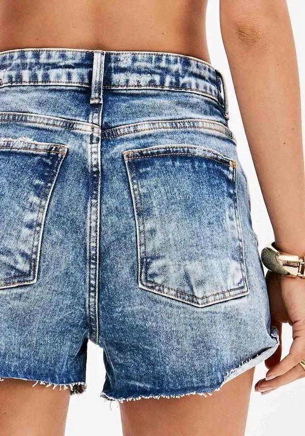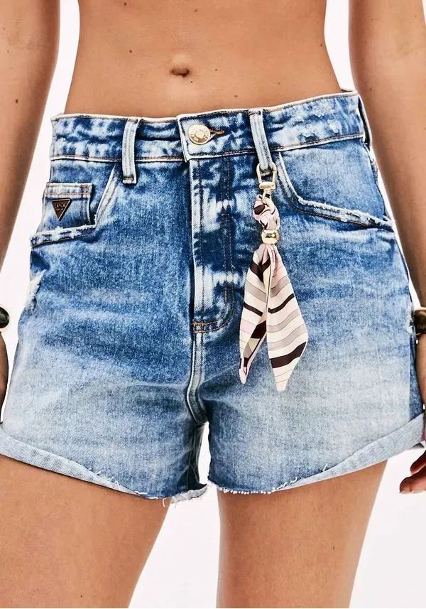Versátil, o short em jeans com elastano é feito com modelagem comfort e cintura super alta. apresenta bolsos funcionais, barras cortadas a fio fixas nas laterais e chaveiro removível com lenço estampado. Peça-chave para um visual moderno!