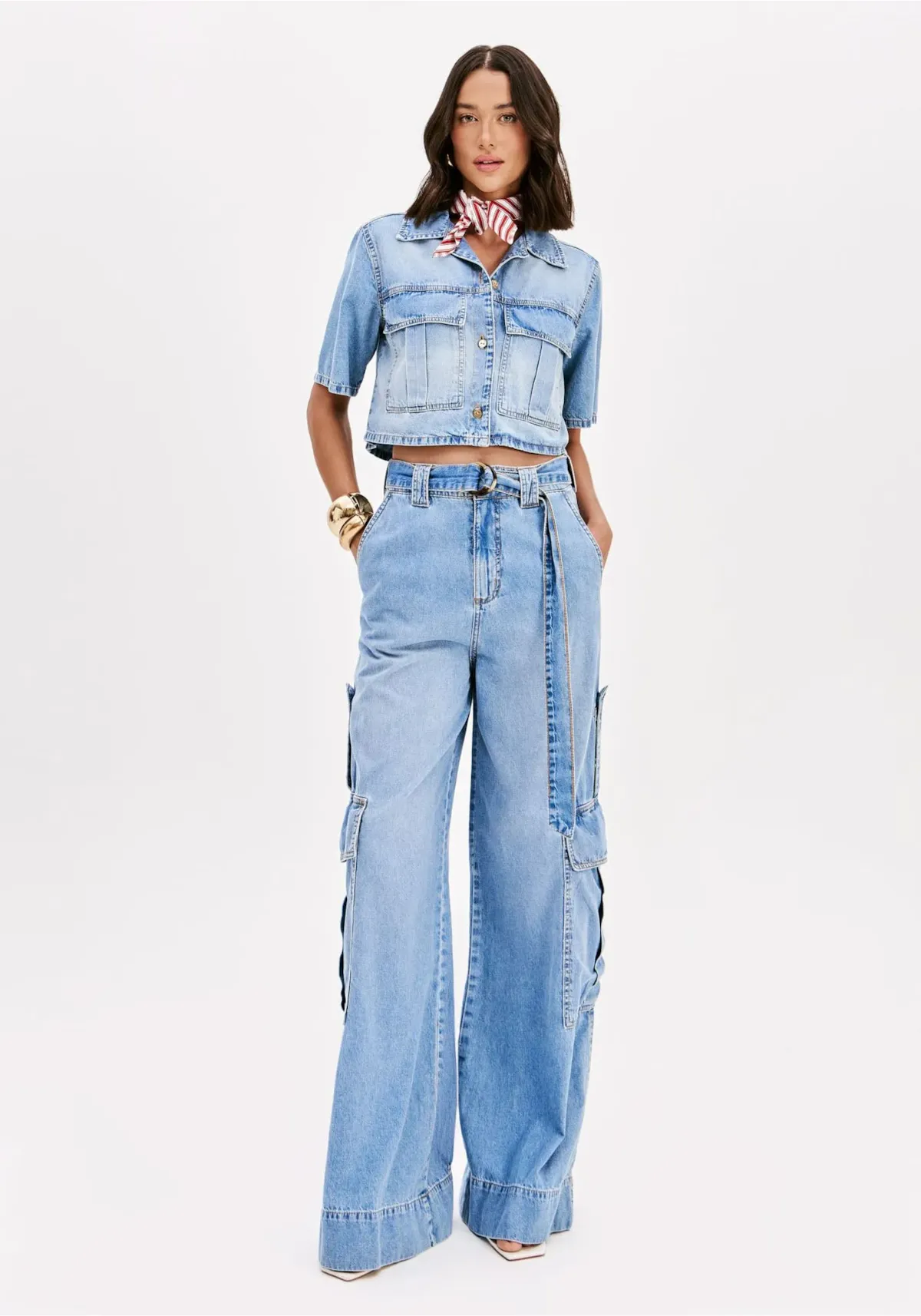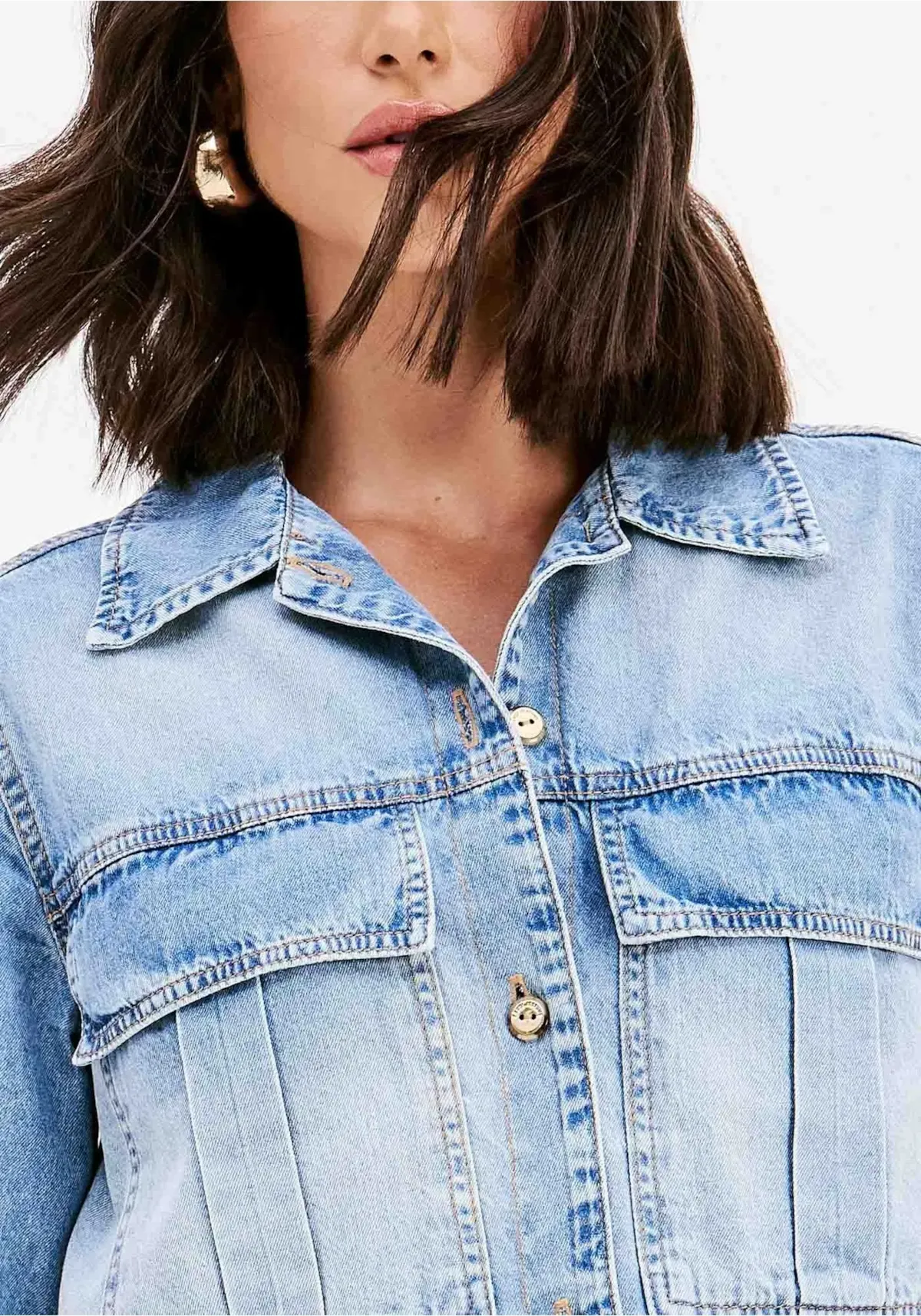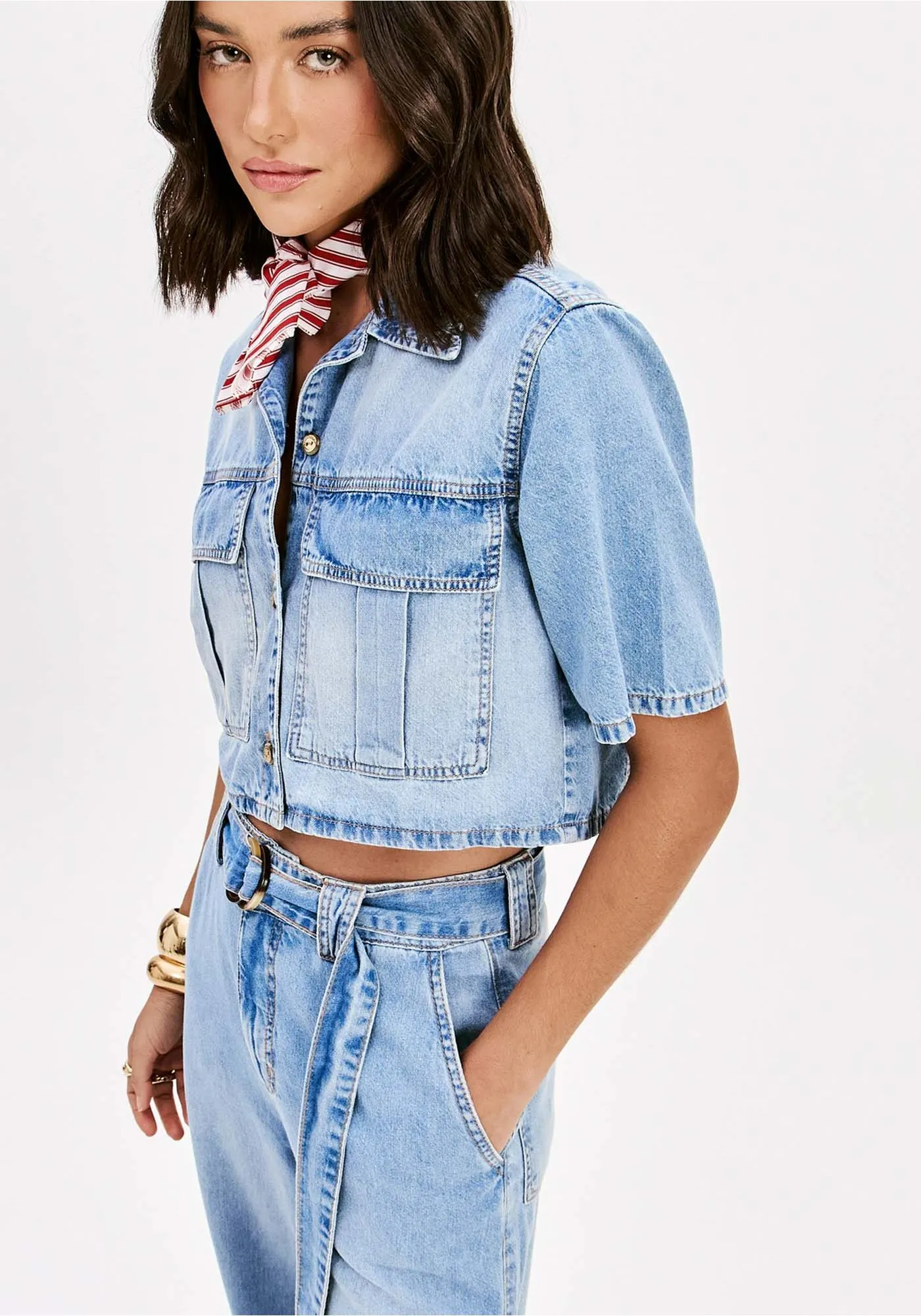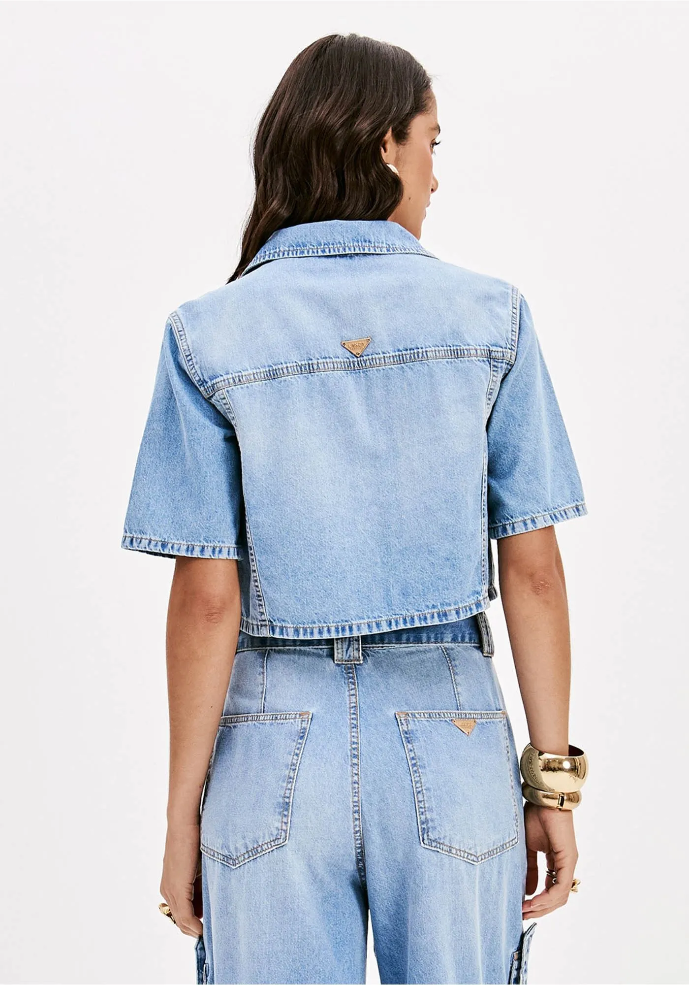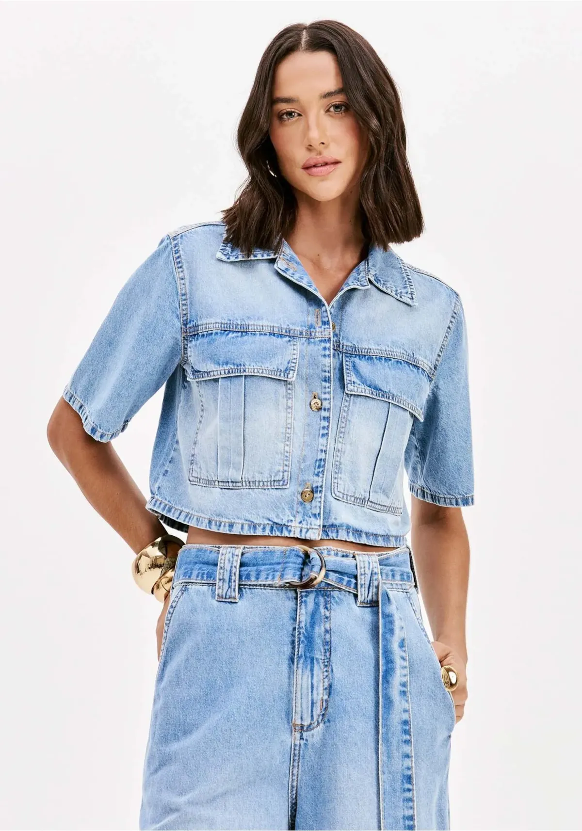 Confeccionada em jeans, a camisa de mangas curtas traz gola tradicional, bolsos frontais com lapela e fechamento por botões. O destaque fica por conta do shape curto que valoriza a peça e exala modernidade. Use com calça lp de cintura alta!