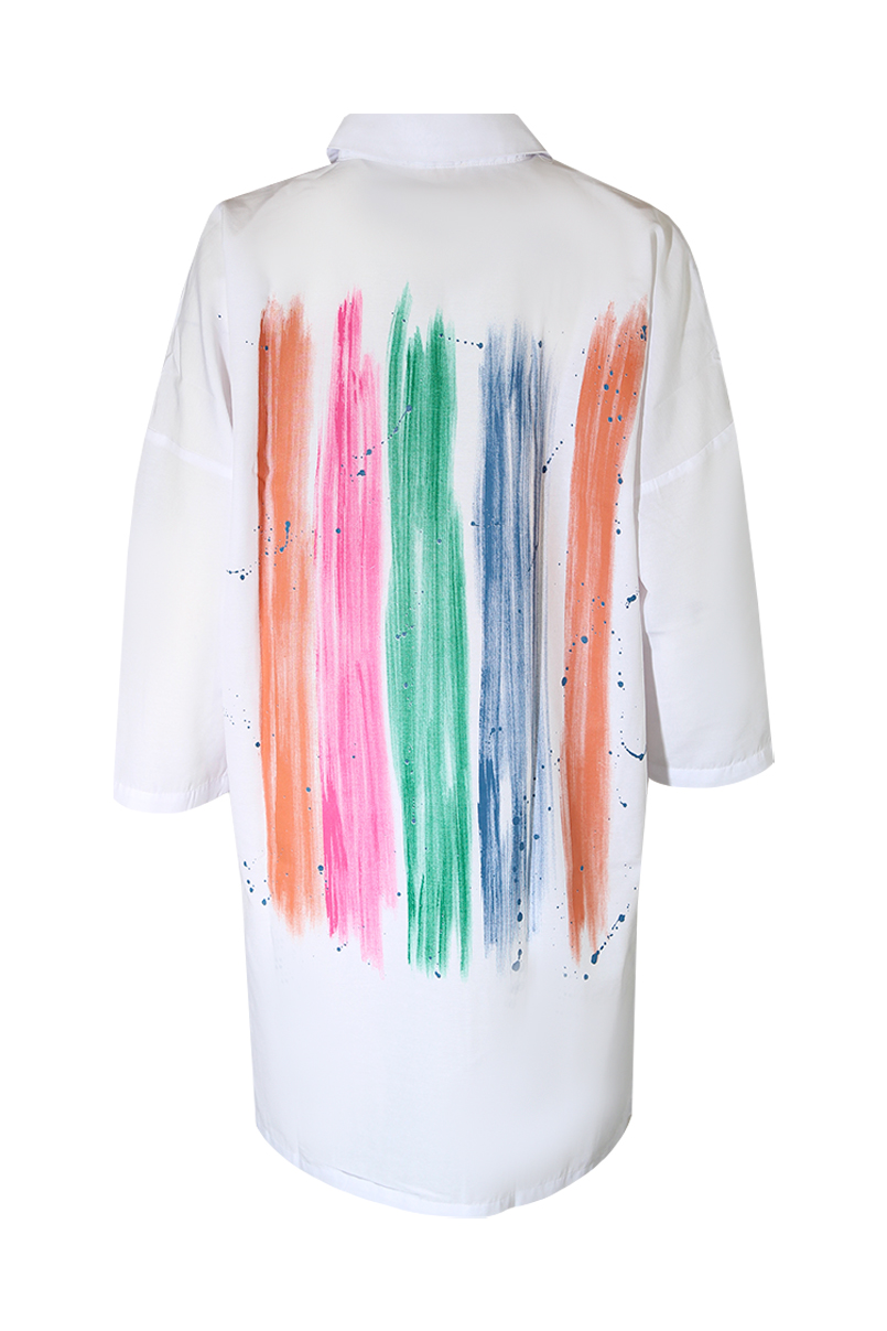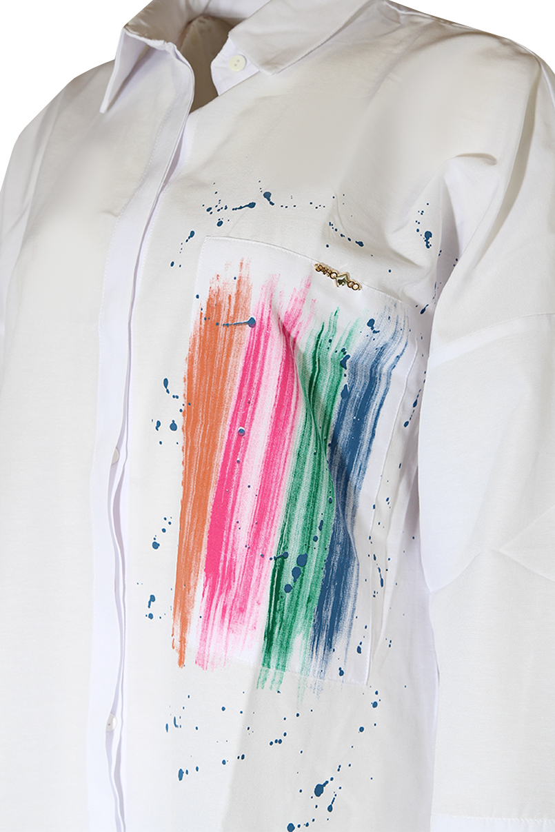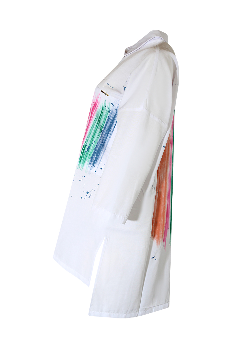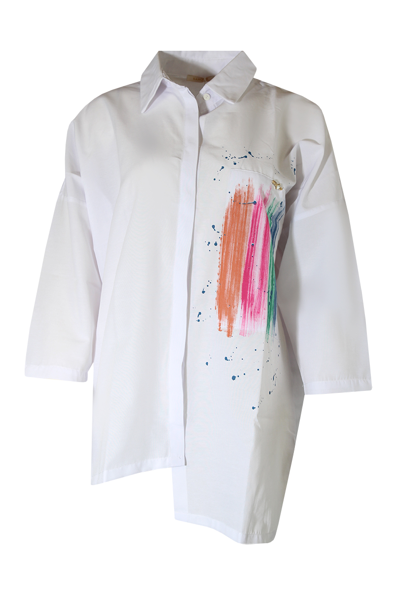 Camisa confecionada em fiação de algodão. Gola de lapela e manga 3/4. Pormenor de estampado. Bolso frontal de chapa. Bainha assimétrica. Fecho de botões ocultos por carcela à frente.