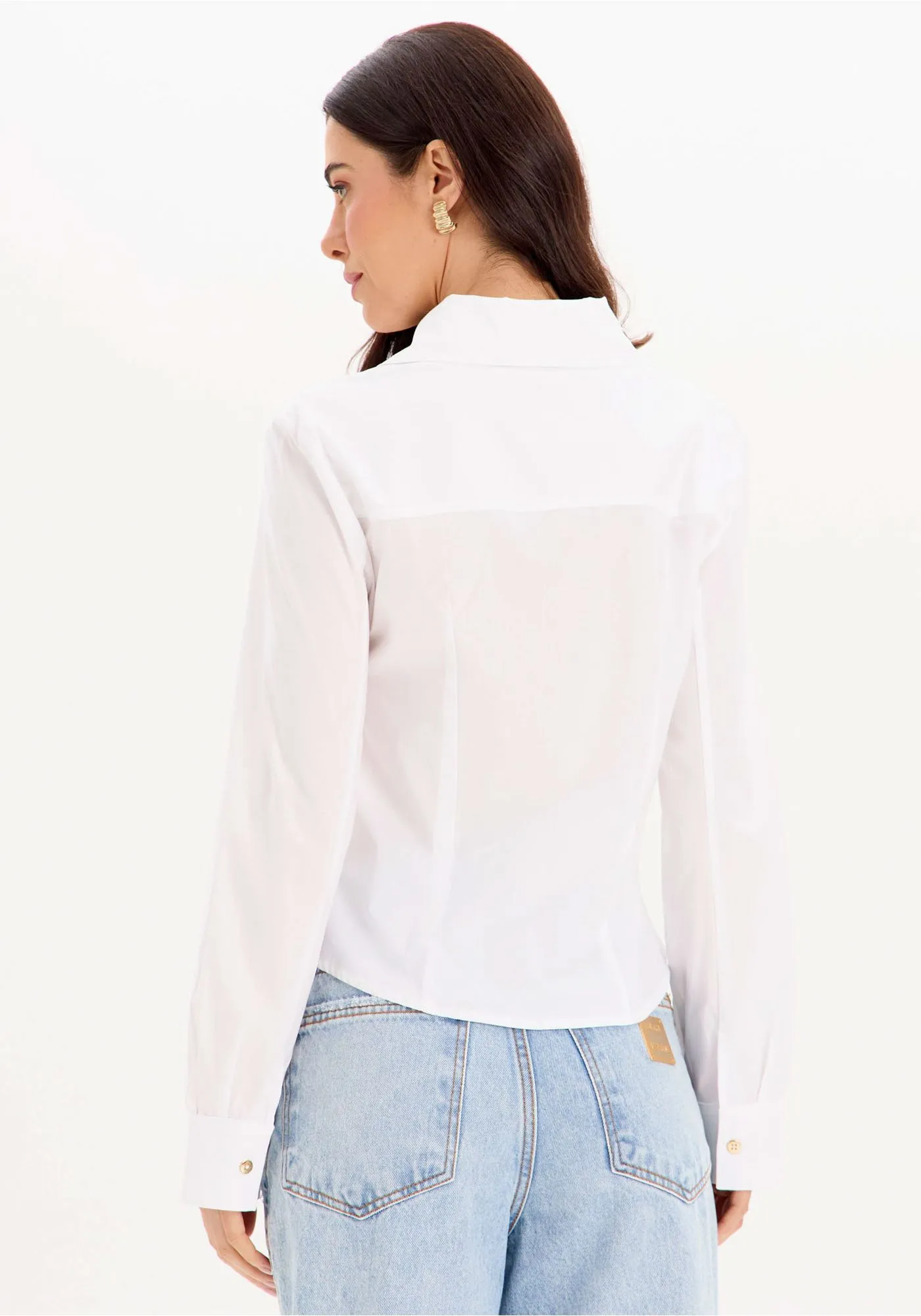 a camisa feita em tricoline é um clássico indispensável no closet. Seu design versátil e atemporal recebe um toque de elegância através do aplique frontal exclusivo. Aposte!