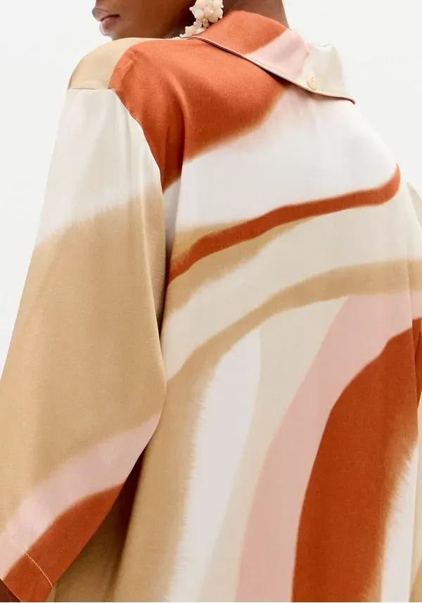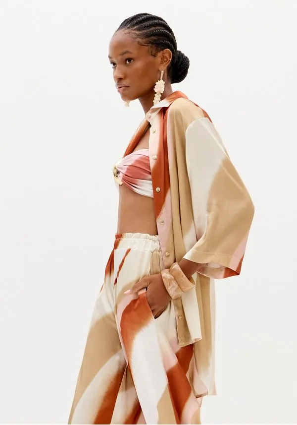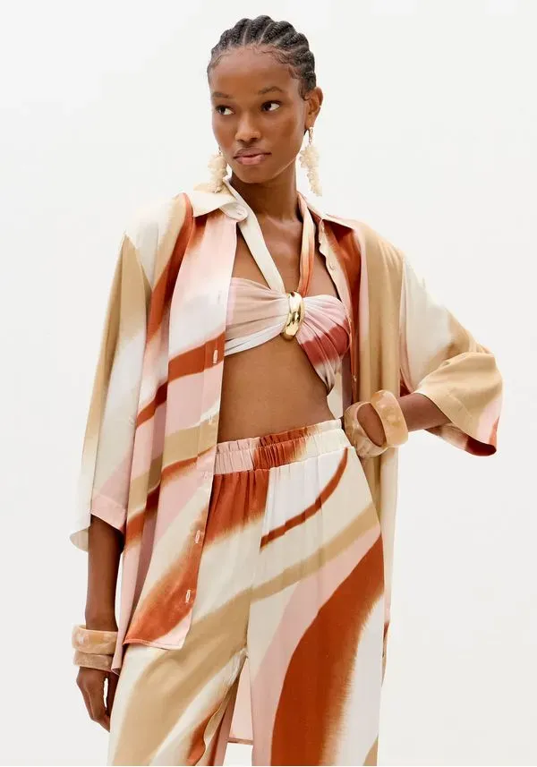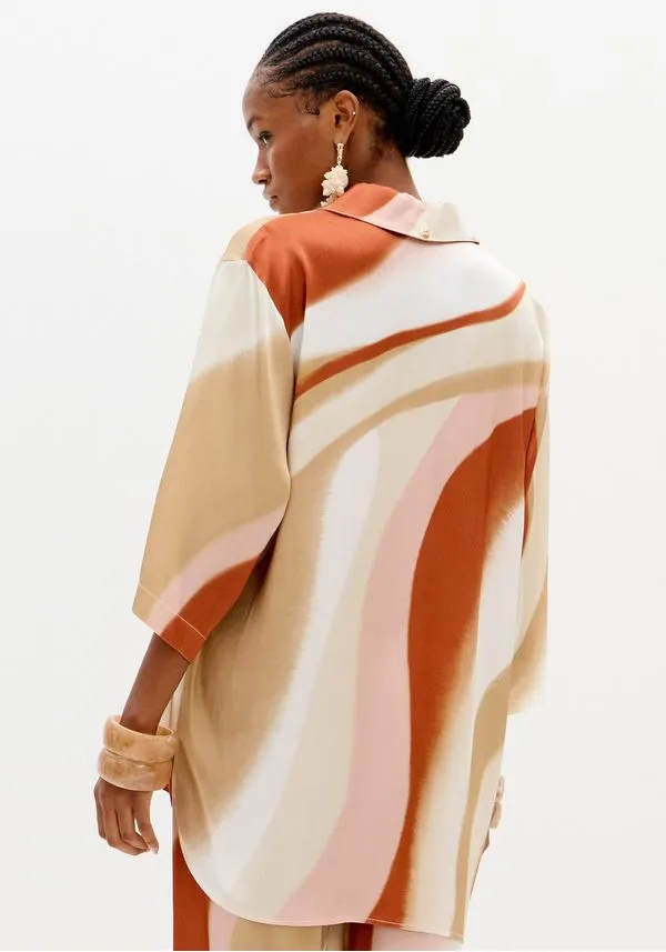 A camisa estampada é feita em tecido leve de toque acetinado com comprimento alongado e modelagem oversized. De caimento amplo e fluido, apresenta fechamento por botões, mangas médias e gola clássica. Uma proposta versátil e marcante para fugir do óbvio!