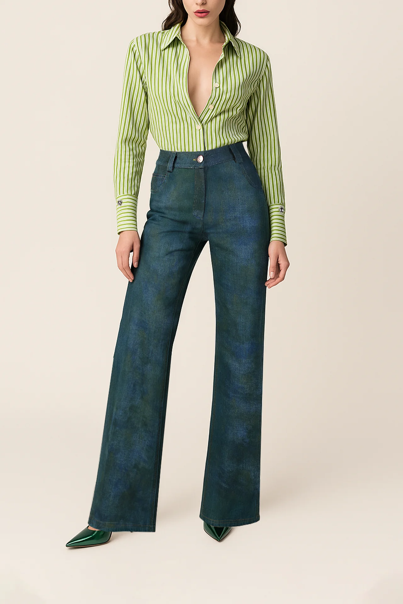 Camisa Sahoco em algodão com riscas douradas, de corte solto e mangas compridas com punhos largos. O brilho subtil do tecido eleva o clássico design de camisa, conferindo-lhe um toque contemporâneo e sofisticado.