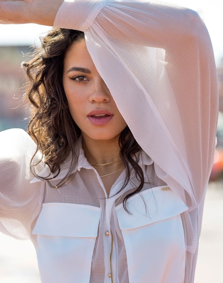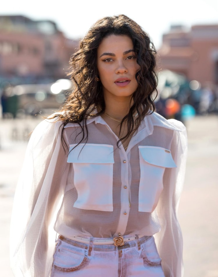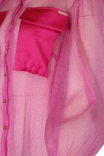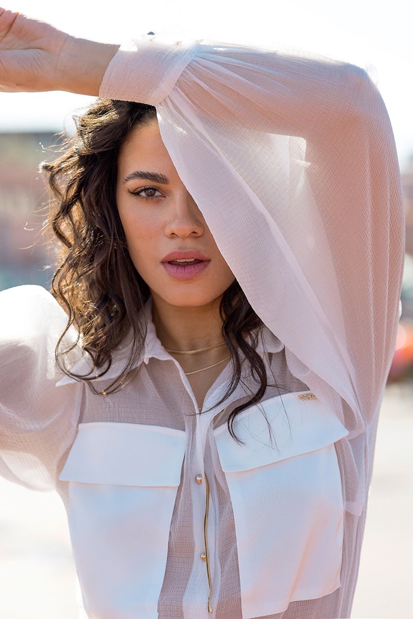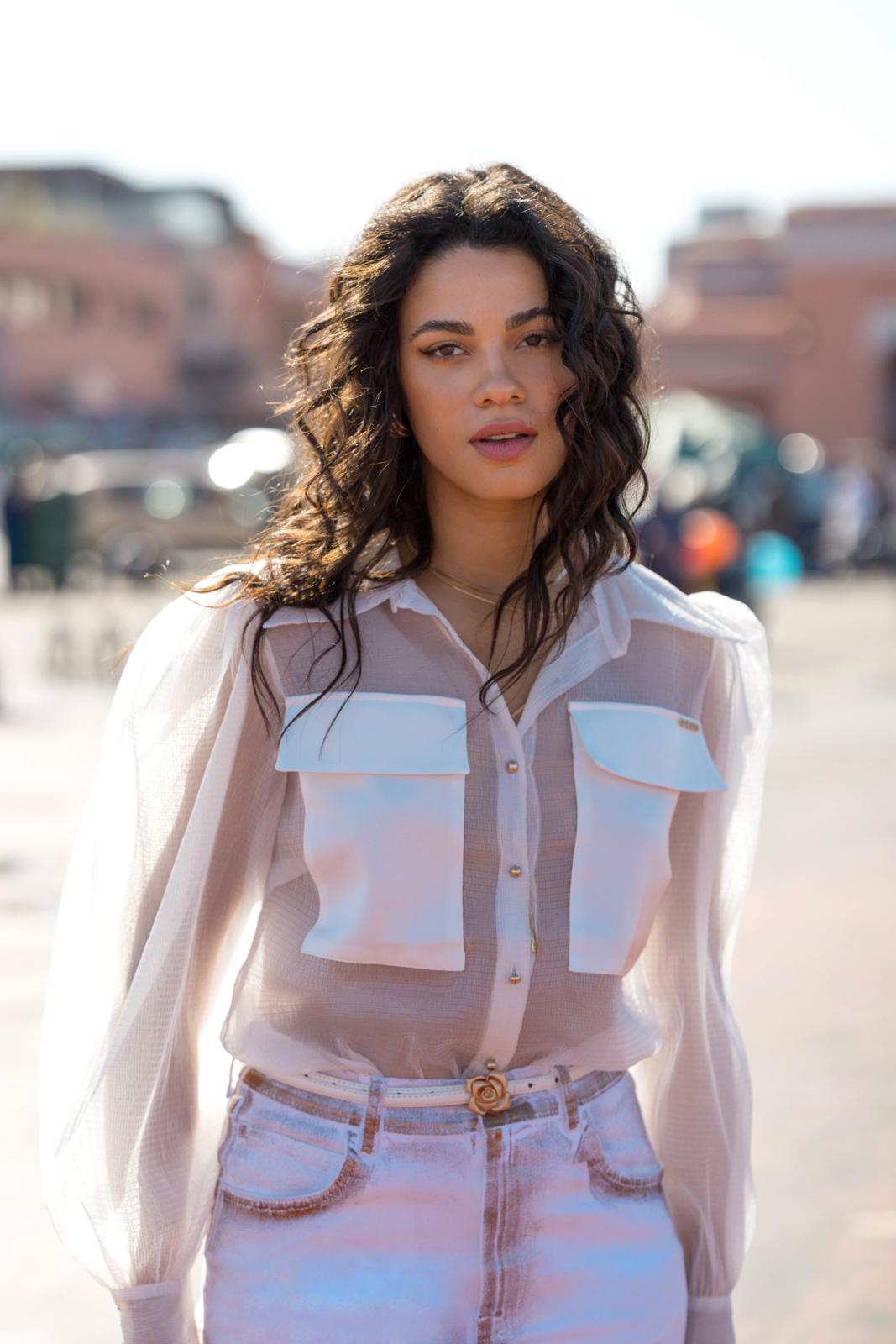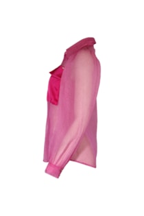 Blusa semitransparente de manga comprida acabada em punho. Gola de abas e fecho frontal com botões dourados. Bolsos de chapa com aba no peito. Bainha assimétrica.