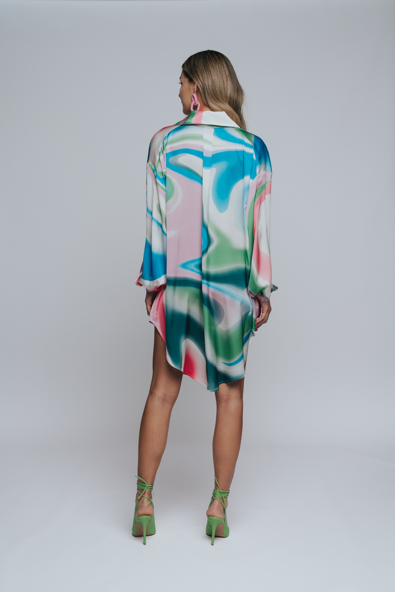 Camiseiro estampado de manga comprida e gola com lapela. Mais curto à frente e mais comprido atrás. Fecho frontal com botões.