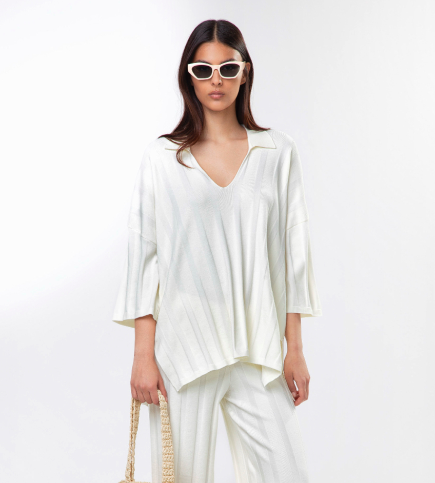 Camisola branca risca e decote em V