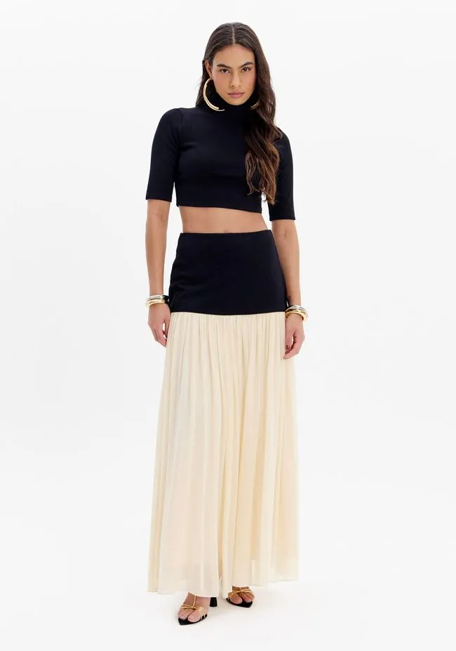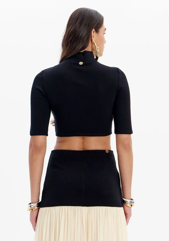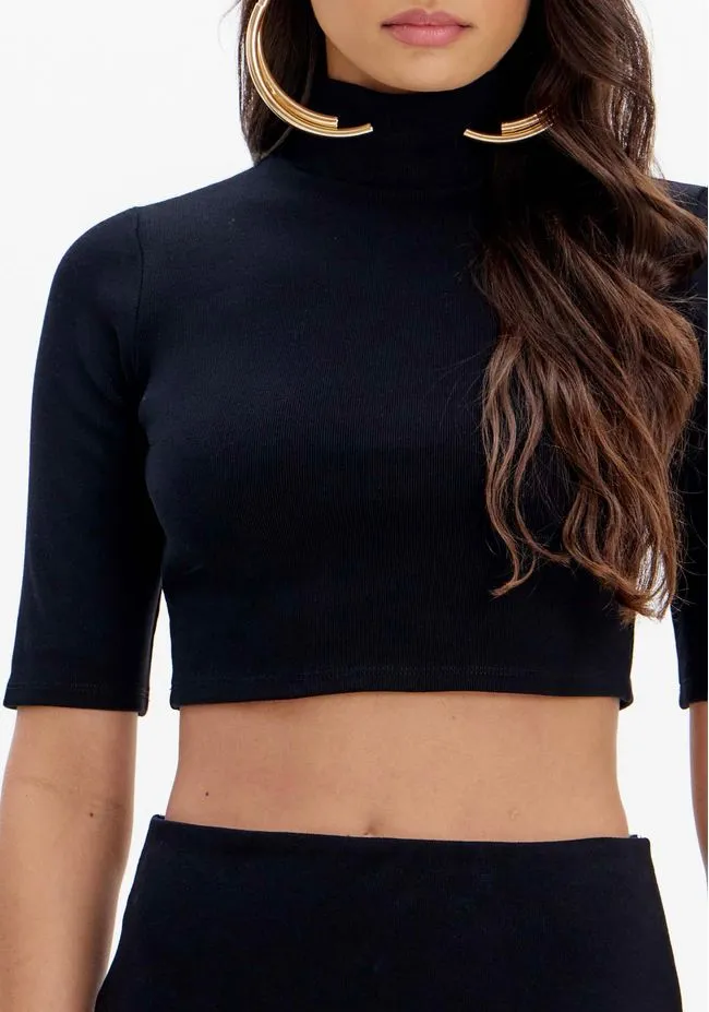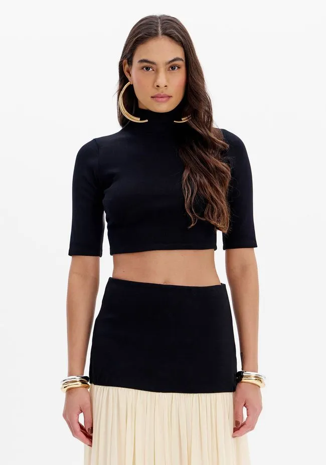 Atemporal e cheia de estilo, esta blusa cropped feita em malha canelada apresenta gola alta, mangas curtas e um caimento justo que valoriza o corpo. Perfeita para composições versáteis e modernas em todas as estações