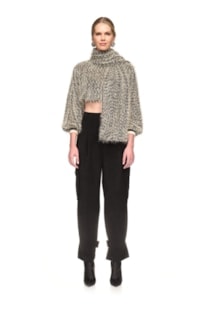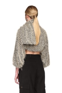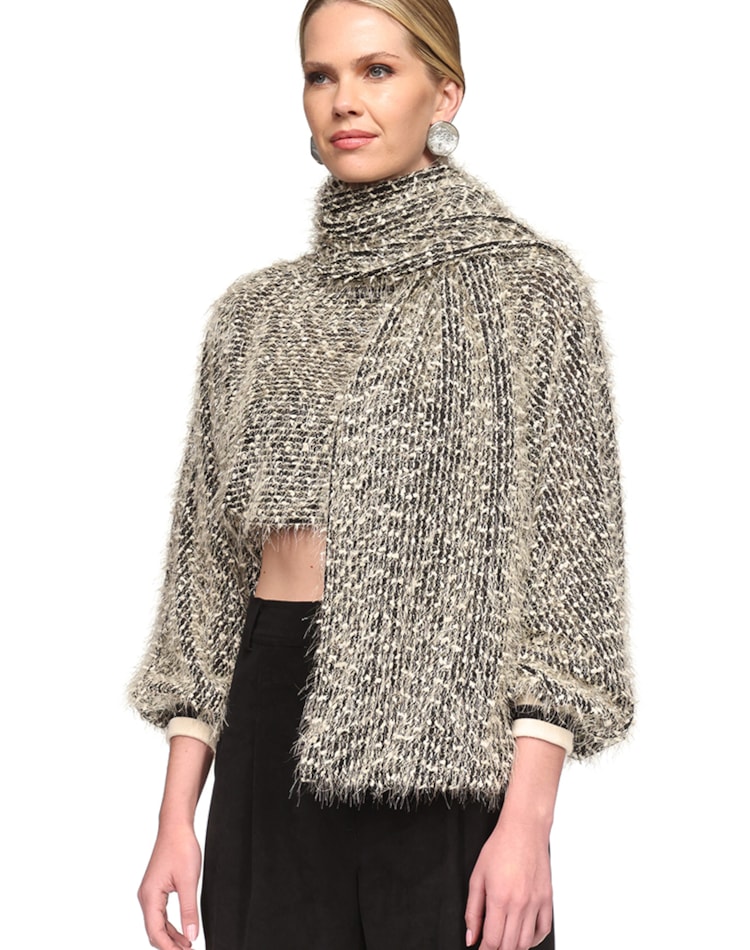 Camisola de malha com manga comprida. Punhos terminados com ribe. Suéter oversize. Decote redondo com cachecol.