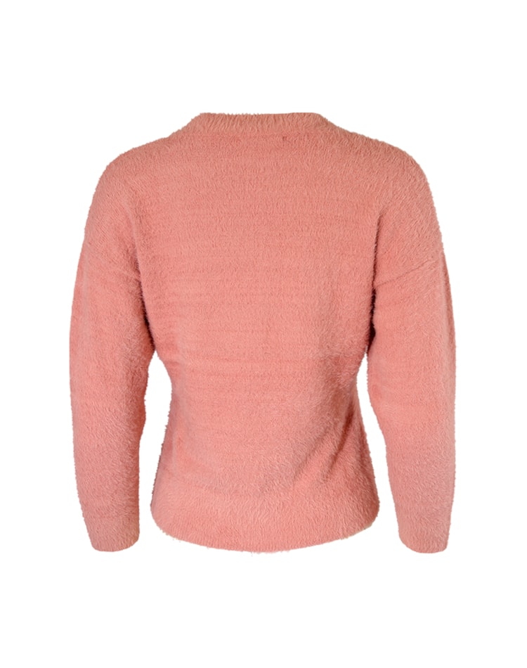 Camisola de malha tato suave. Manga comprida. Decote em bico com aplicação em renda.