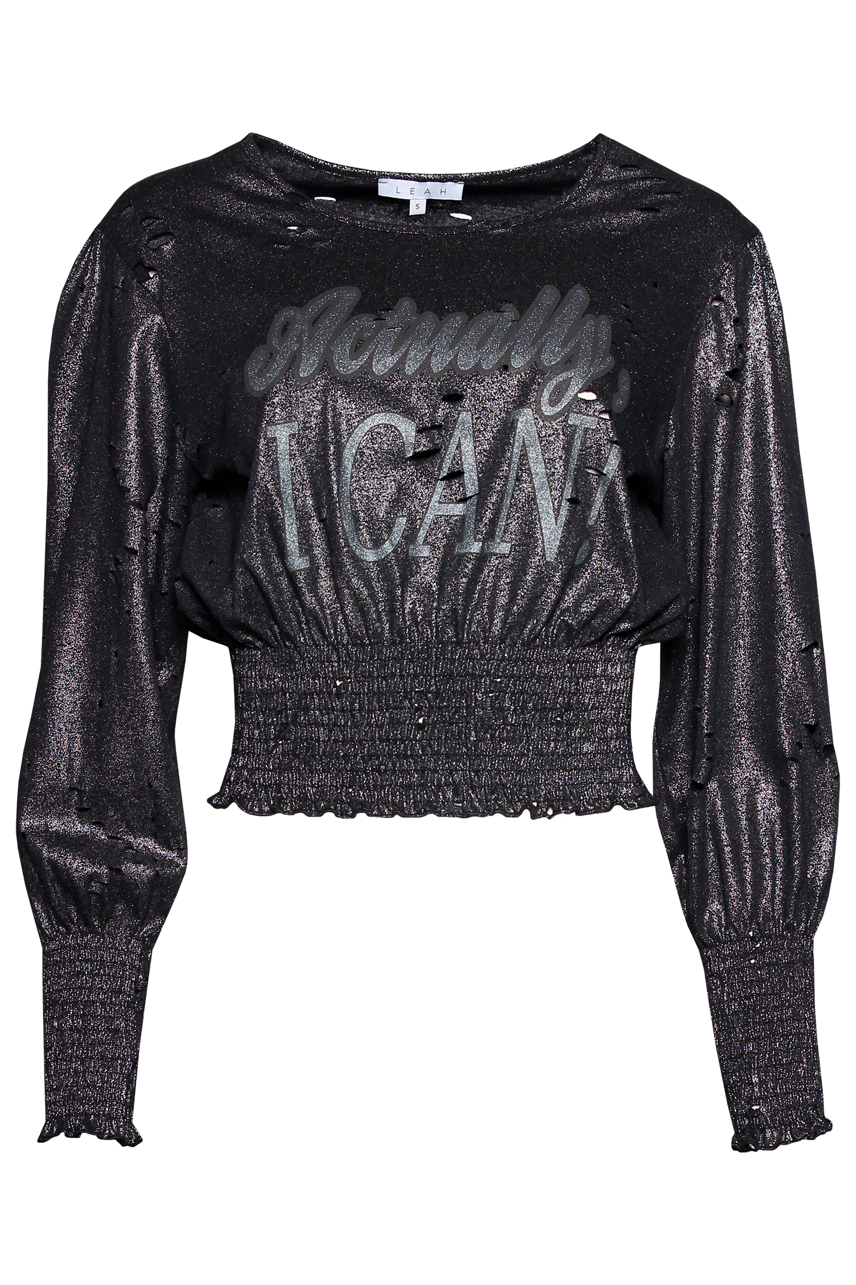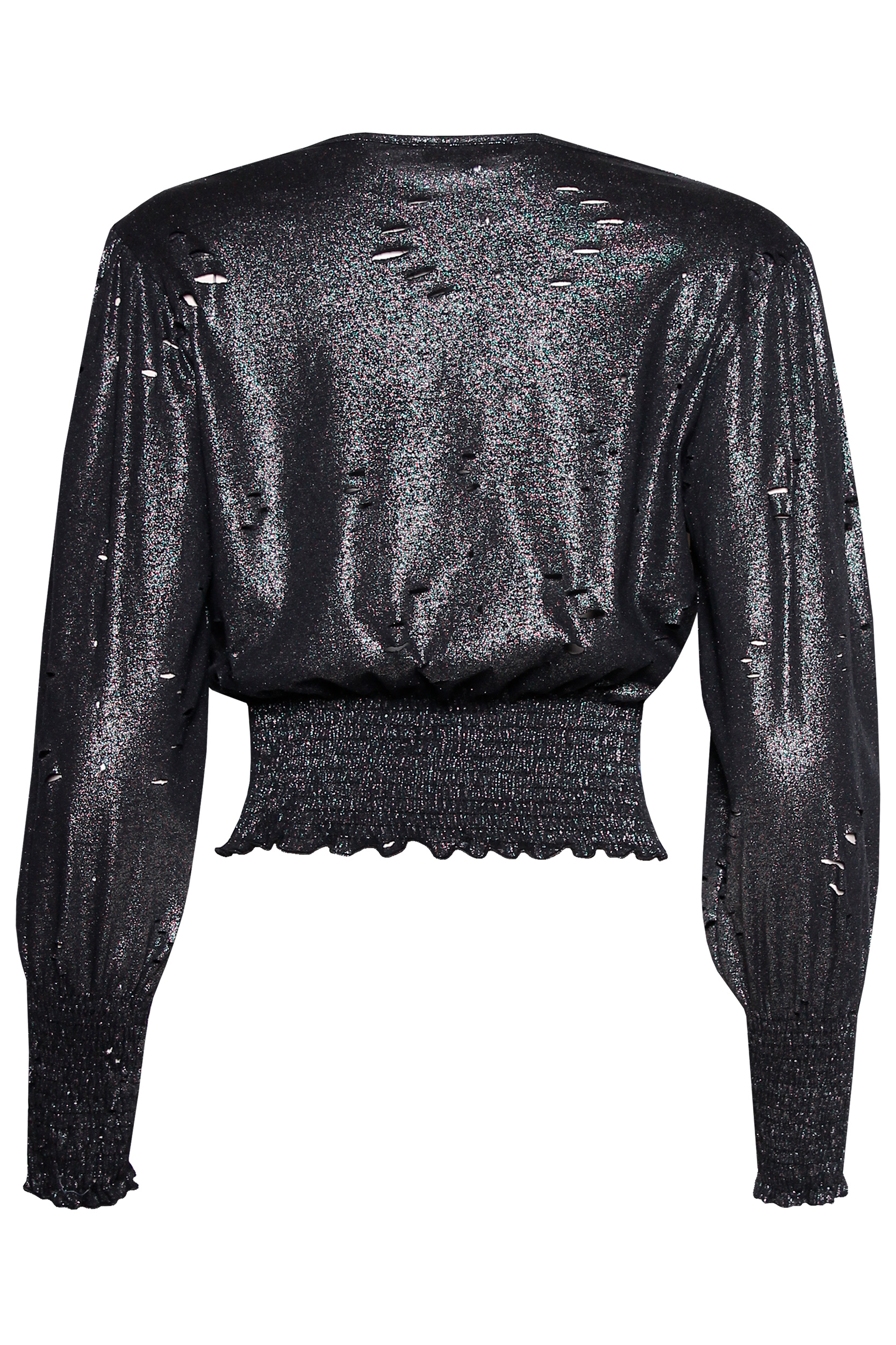 Camisola com ombreiras em malha com rasgões e brilho. Manga comprida e elásticos nos punhos e no fundo da baínha.Estampado na frente.