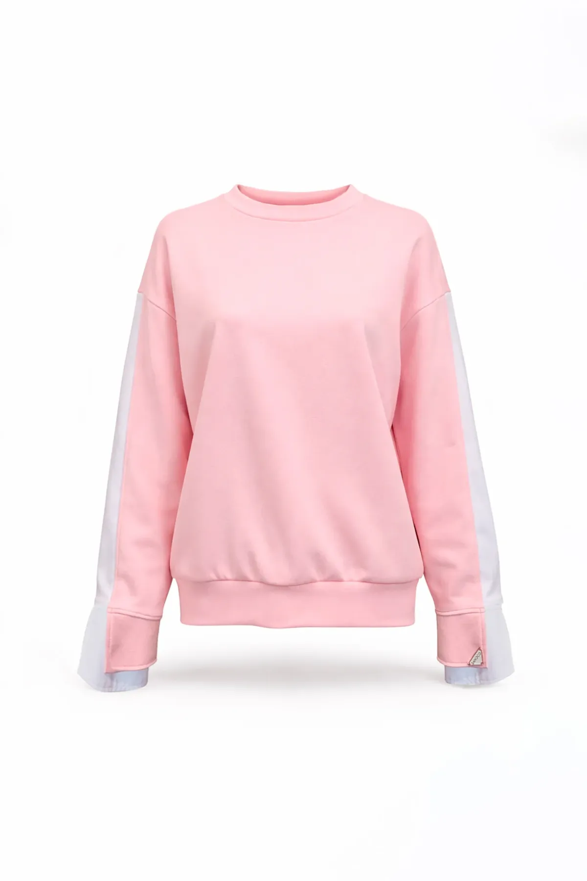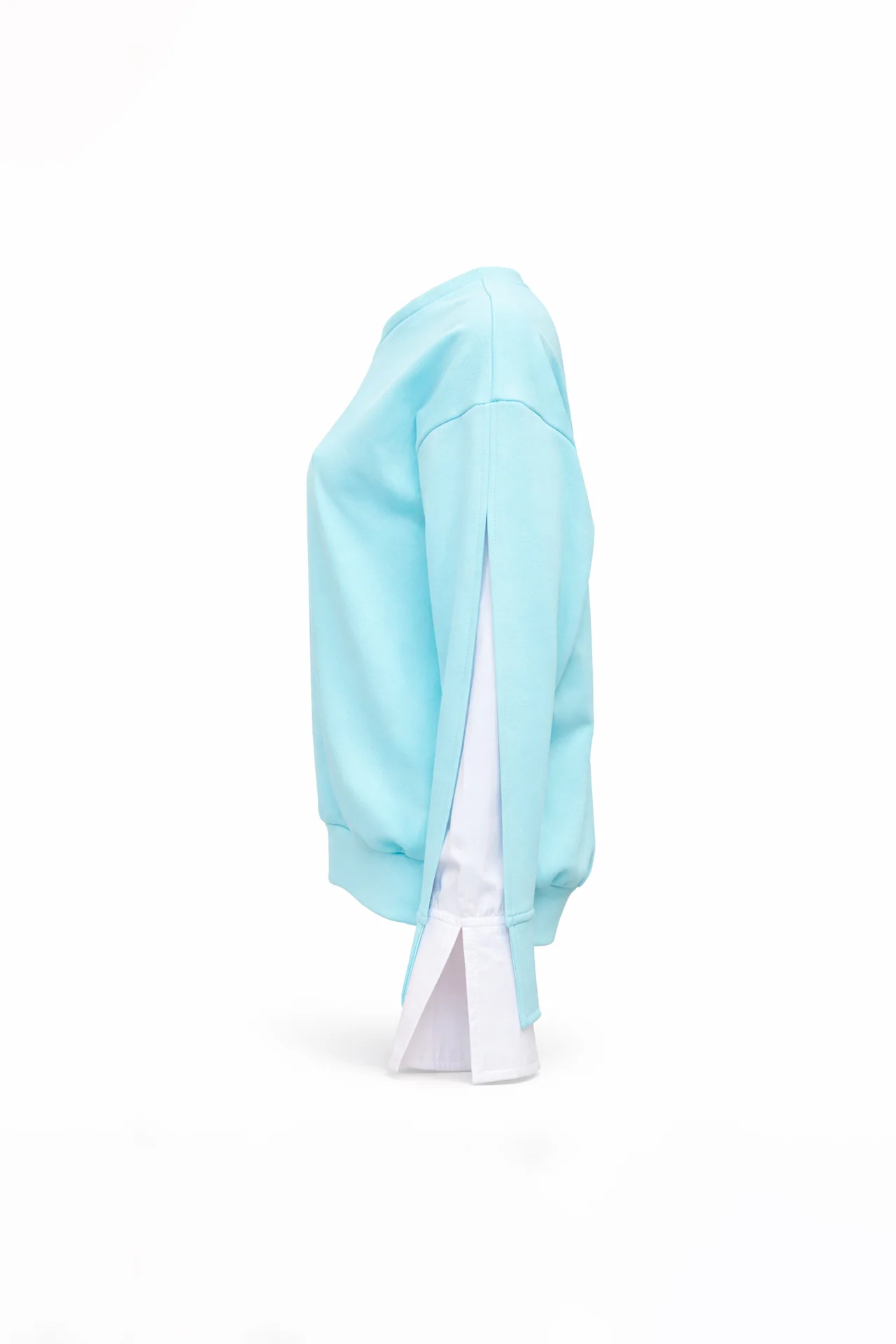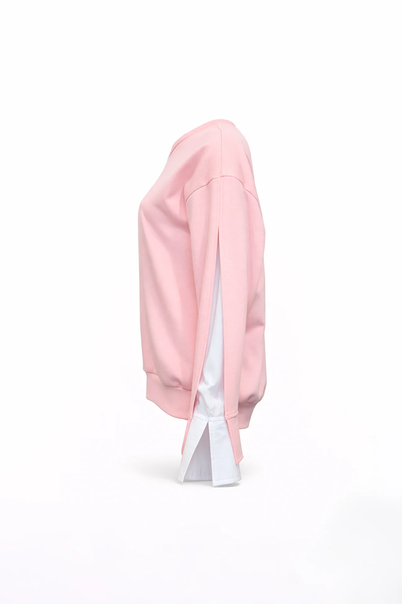 Sweatshirt com decote redondo e manga comprida de ombro descaído. Detalhe de abertura ao longo da manga com inserção interior em tecido tipo camisa, criando um efeito de sobreposição e movimento. Acabamentos em canelado no decote e na bainha.