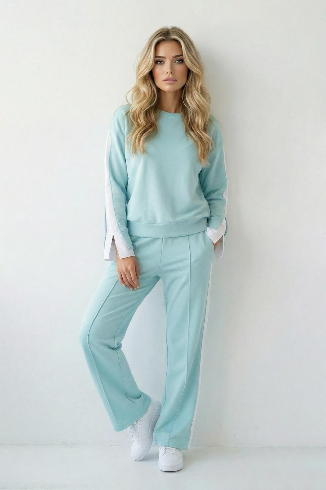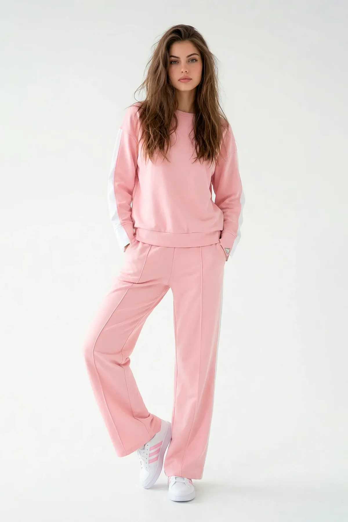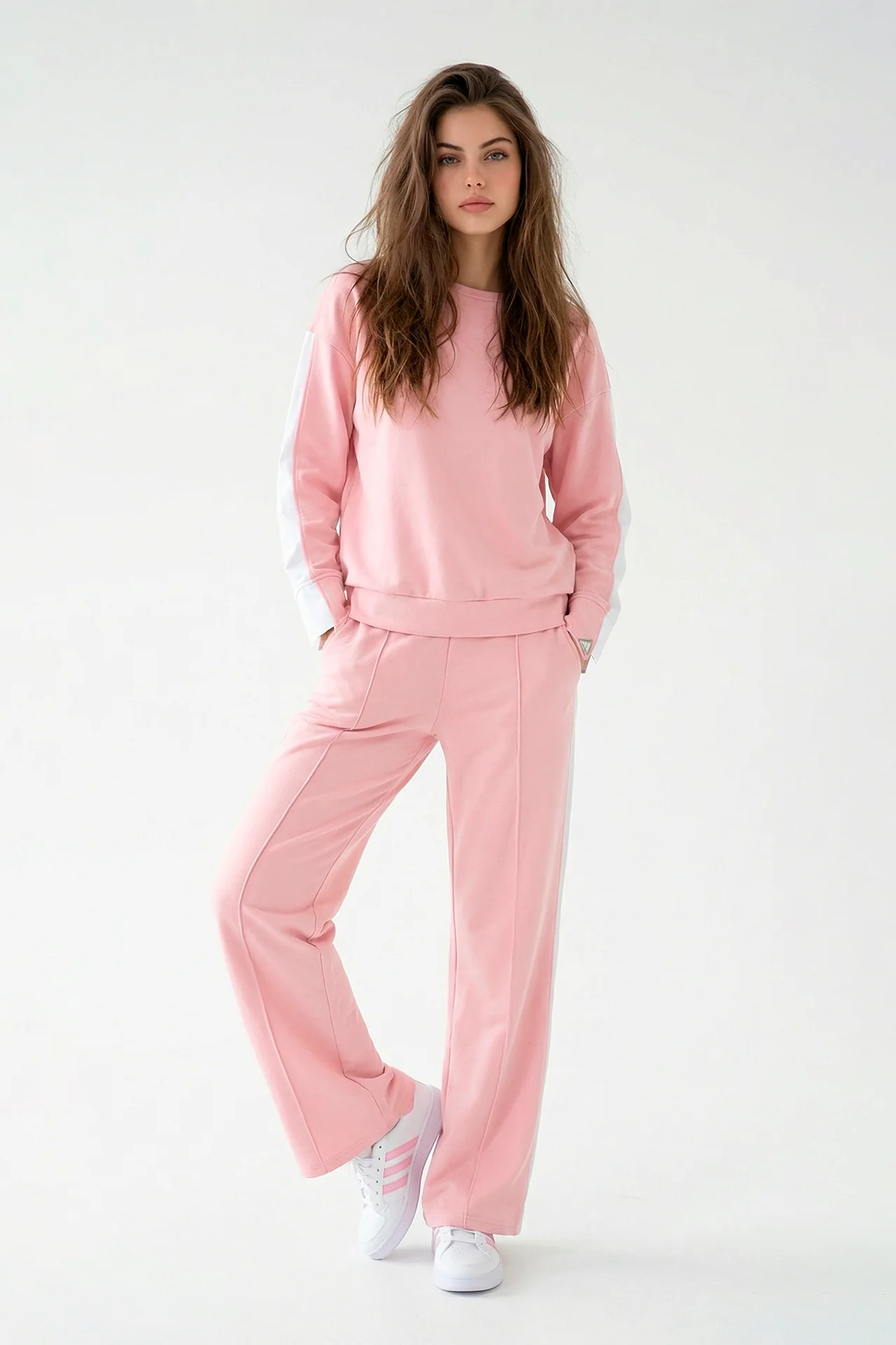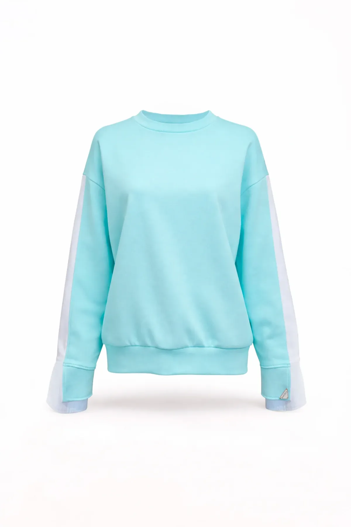 Sweatshirt com decote redondo e manga comprida de ombro descaído. Detalhe de abertura ao longo da manga com inserção interior em tecido tipo camisa, criando um efeito de sobreposição e movimento. Acabamentos em canelado no decote e na bainha.
