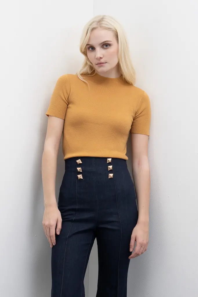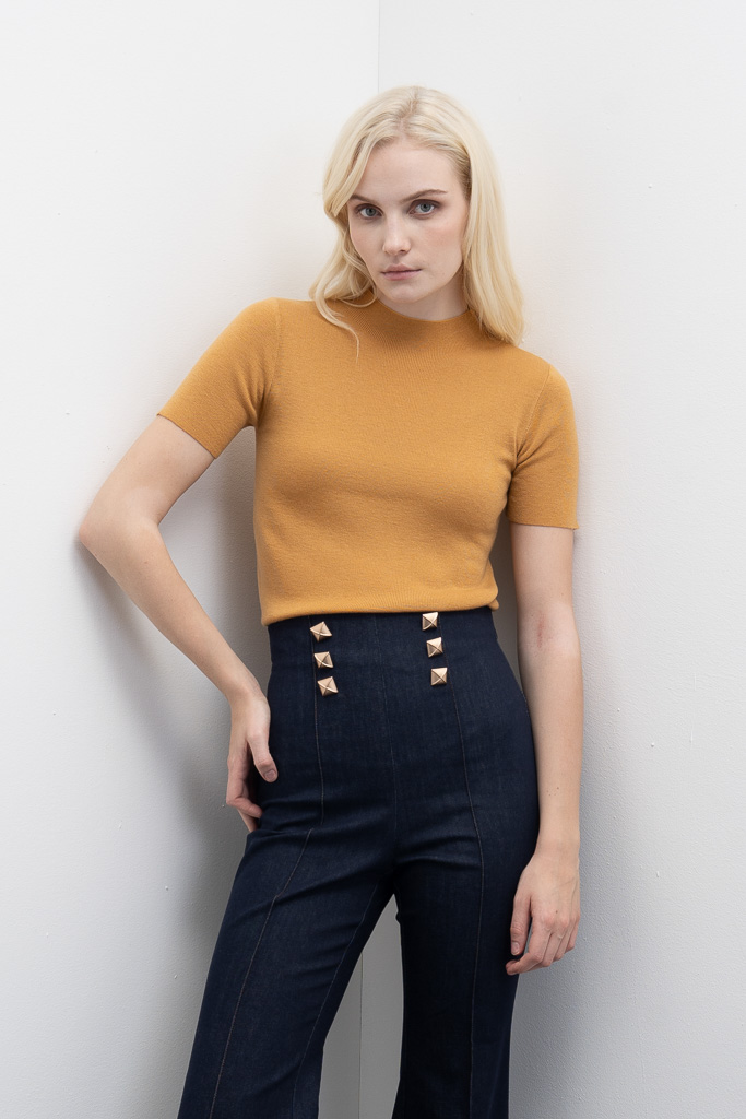Camisola de manga curta com gola alta.