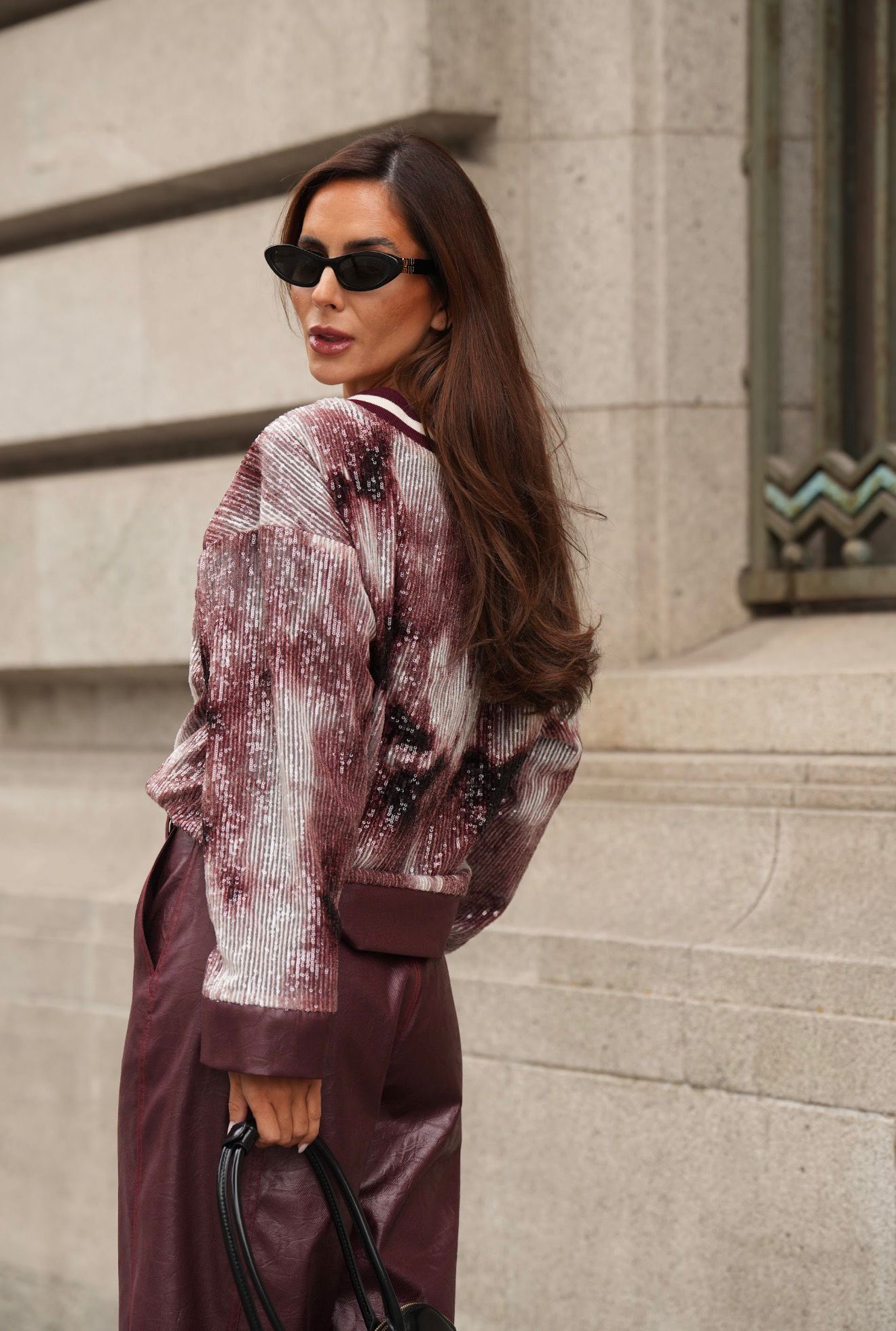 Camisola com base em malha estruturada, totalmente revestida por lantejoulas de aplicação uniforme. O número 89 surge em destaque na parte frontal através de uma aplicação têxtil que adiciona relevo e dimensão. A gola em V com acabamento desportivo cria contraste e suaviza o brilho intenso da superfície. Um design que funde estética casual com acabamento de noite.