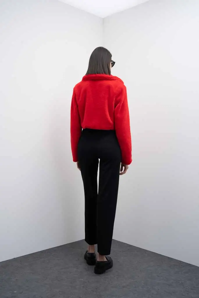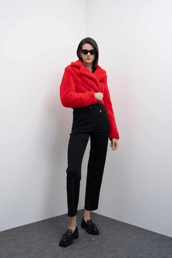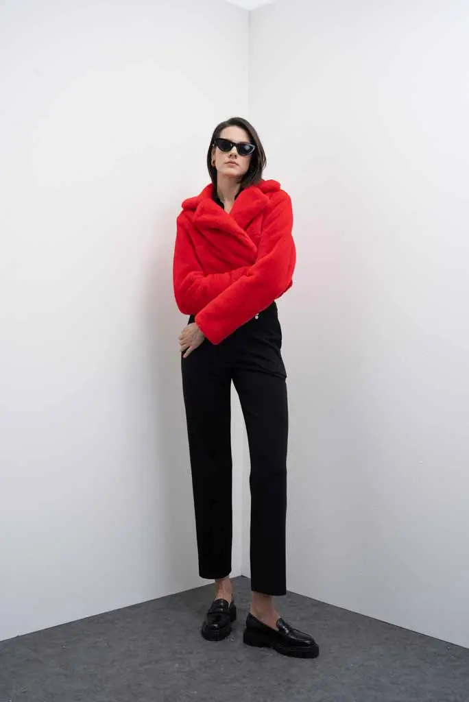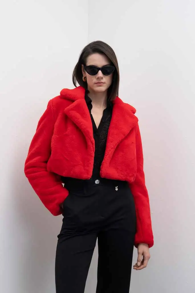 Bolero curto de pele sintética Design elegante e sofisticado com acabamento aveludado Gola com lapela para um toque clássico Fechamento frontal aberto sem botões Mangas compridas com caimento solto Corte cropped para um look moderno e versátil