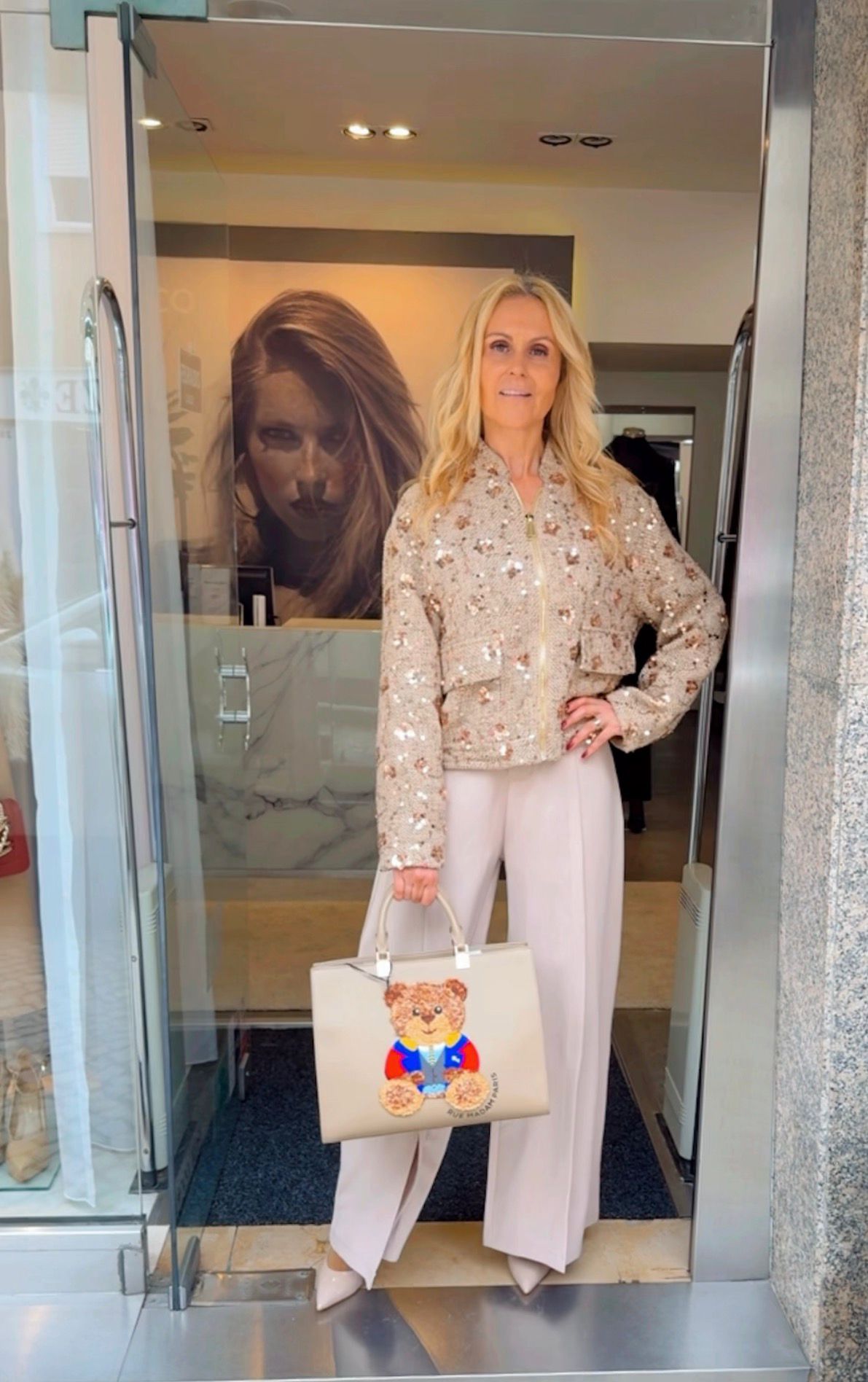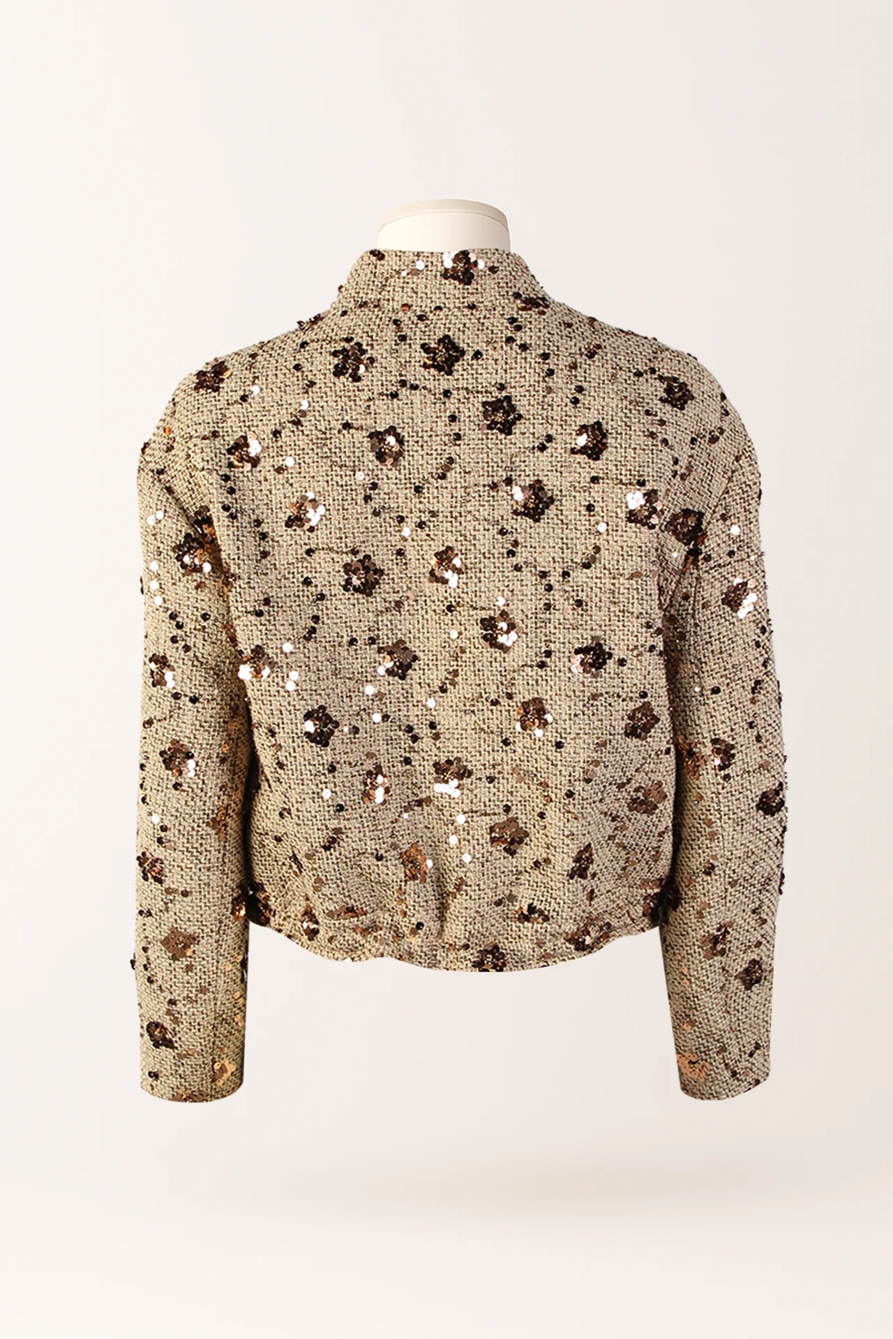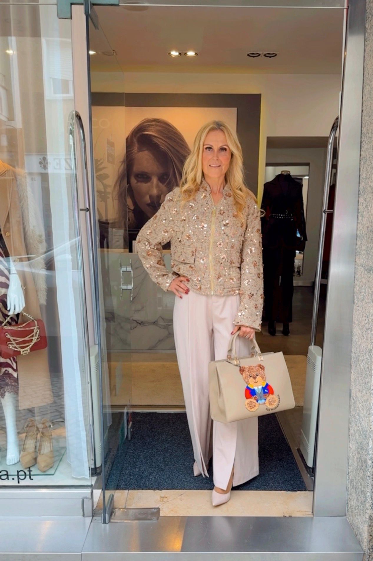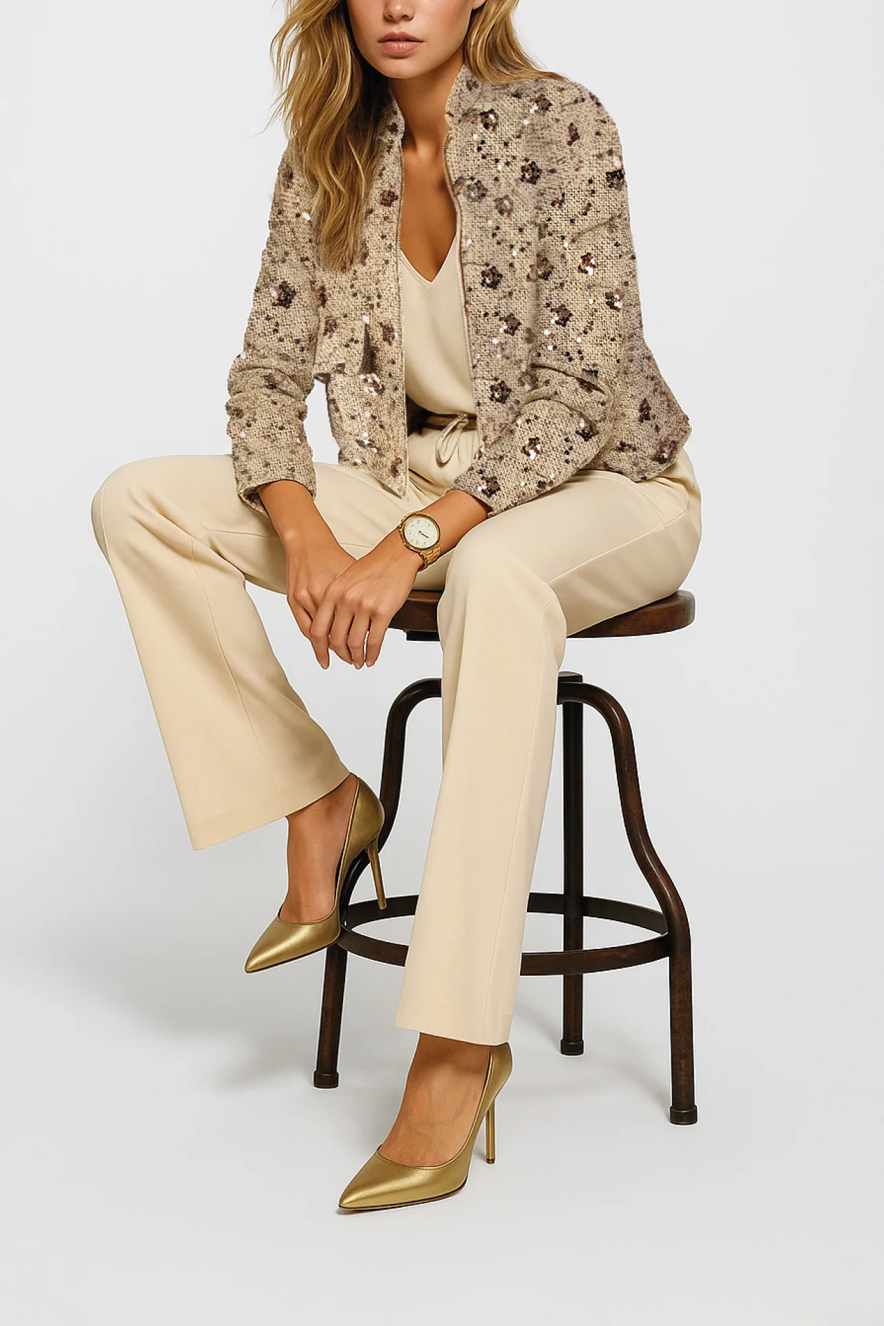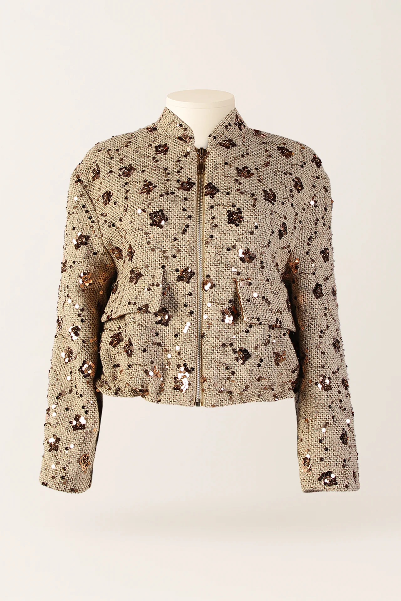 Bomber curto em tecido texturado adornado com lantejoulas que refletem a luz com elegância subtil. Apresenta gola subida, fecho frontal com fecho de correr metálico e bolsos com aba. O modelo é finalizado com cordões ajustáveis na cintura, que permitem definir a silhueta e adaptar o estilo. Uma fusão entre brilho e estrutura, reinterpretando o clássico bomber com o toque sofisticado e contemporâneo da estação.
