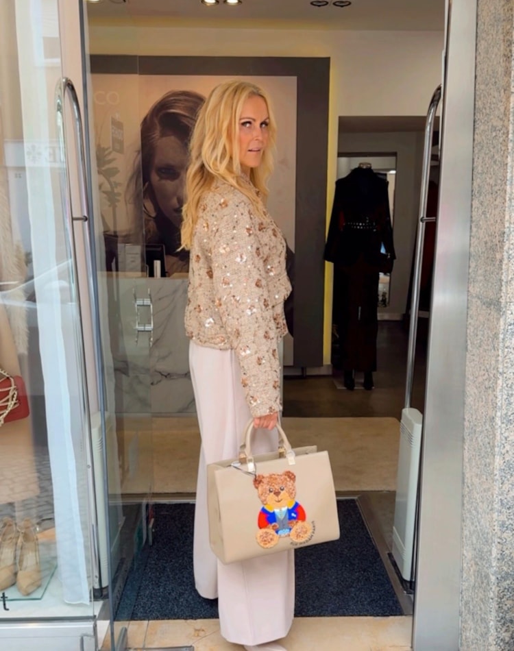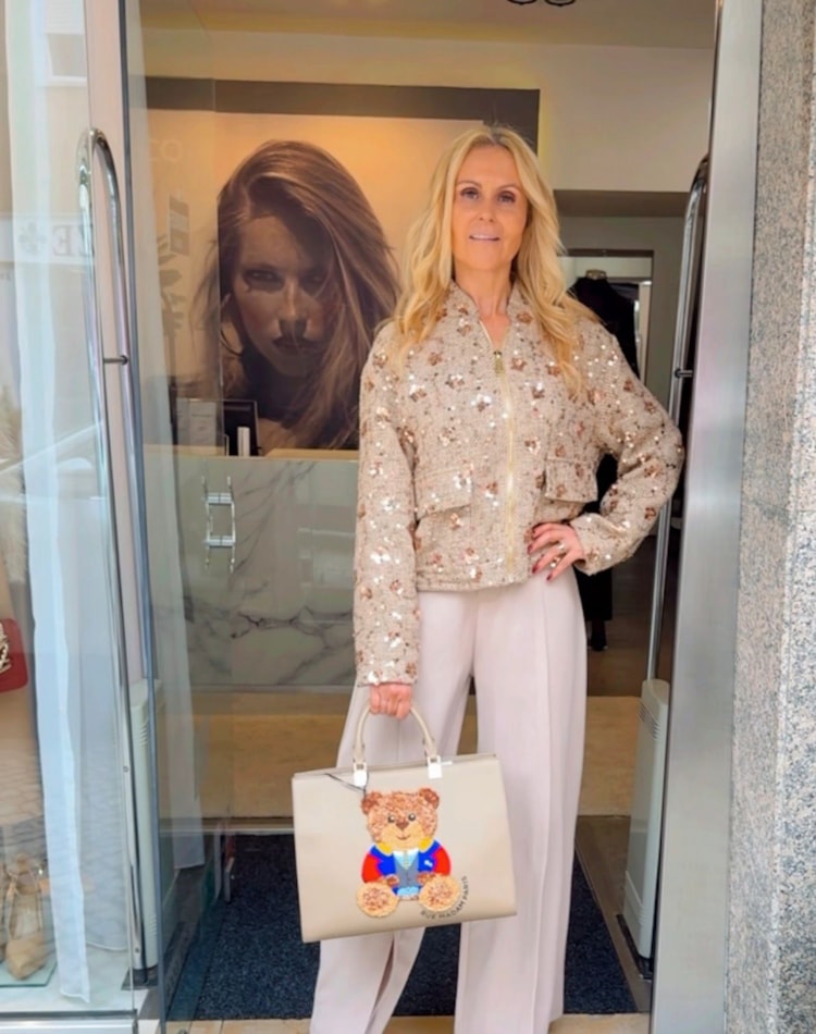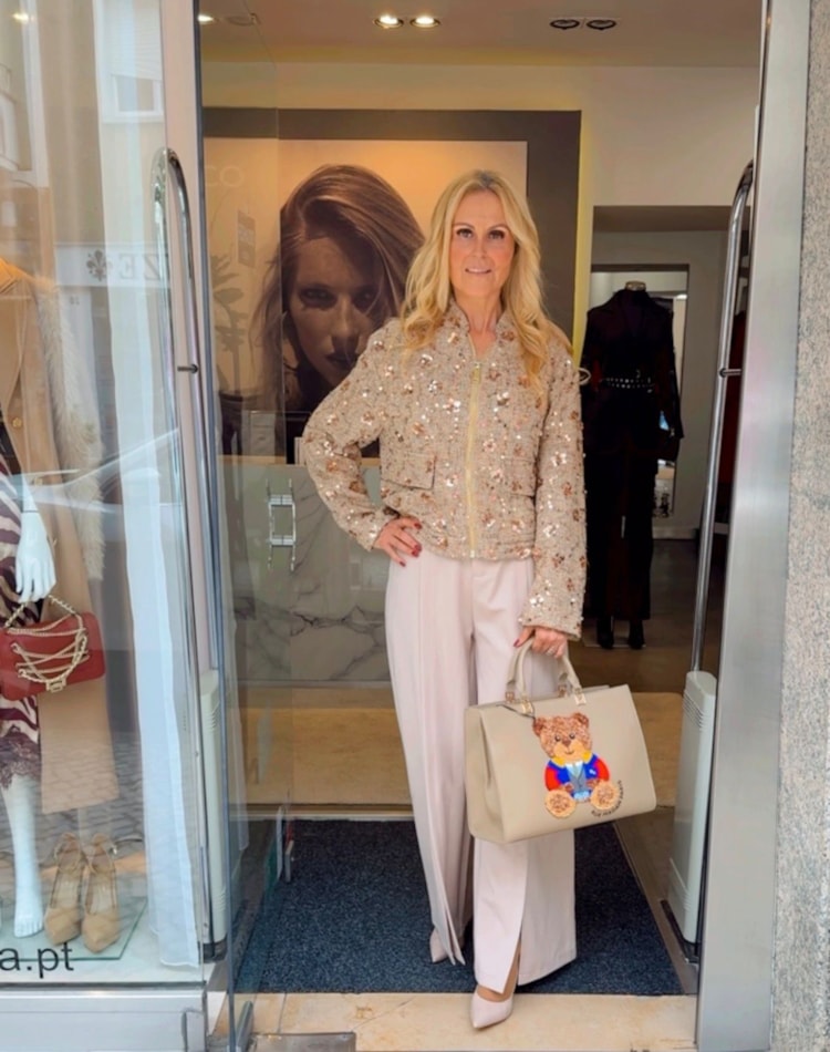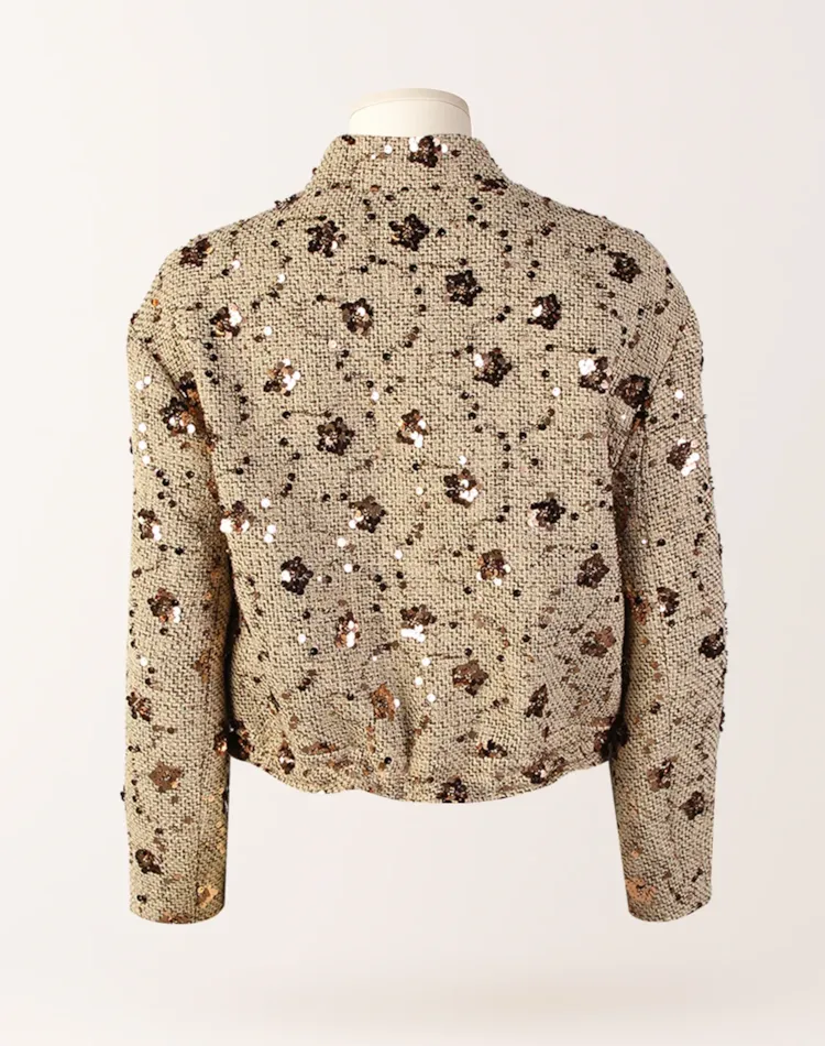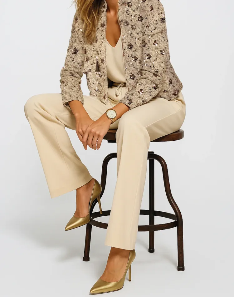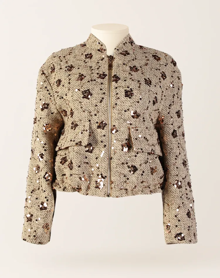Bomber curto em tecido texturado adornado com lantejoulas que refletem a luz com elegância subtil. Apresenta gola subida, fecho frontal com fecho de correr metálico e bolsos com aba. O modelo é finalizado com cordões ajustáveis na cintura, que permitem definir a silhueta e adaptar o estilo. Uma fusão entre brilho e estrutura, reinterpretando o clássico bomber com o toque sofisticado e contemporâneo da estação.