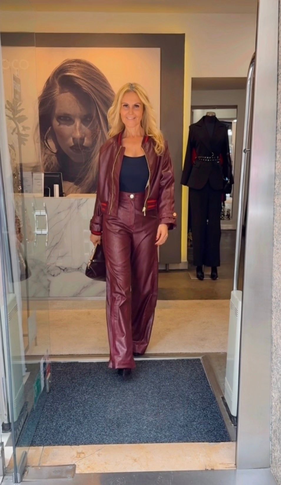Bomber em eco pele de textura suave e acabamento luminoso, reinterpretando o estilo desportivo com uma abordagem sofisticada. Apresenta gola, punhos e cós em malha canelada com riscas contrastantes, além de fecho frontal com fecho de correr metálico. As mangas estruturadas e os punhos ajustáveis com botão acrescentam personalidade. Uma peça statement que combina o conforto urbano com a atitude glam da estação.