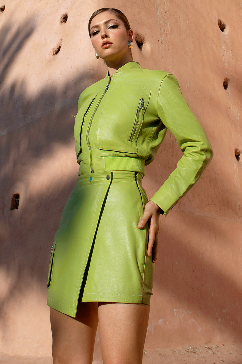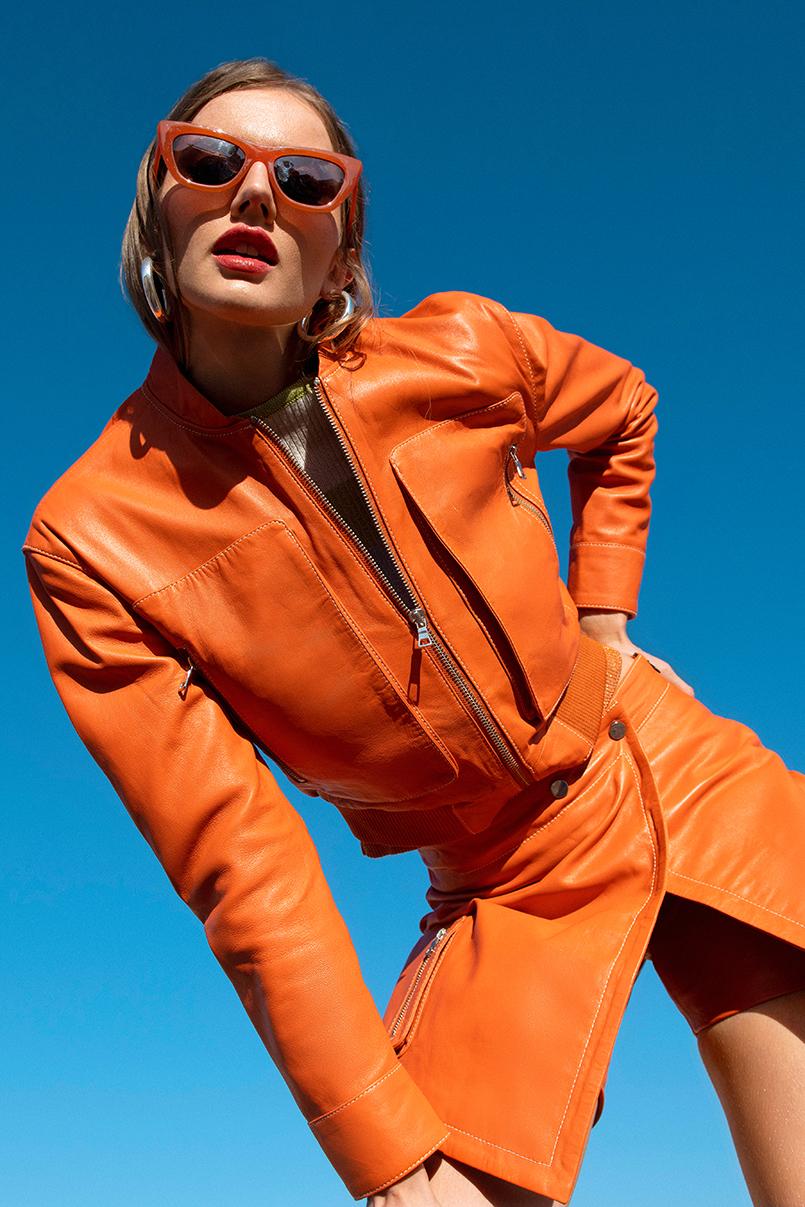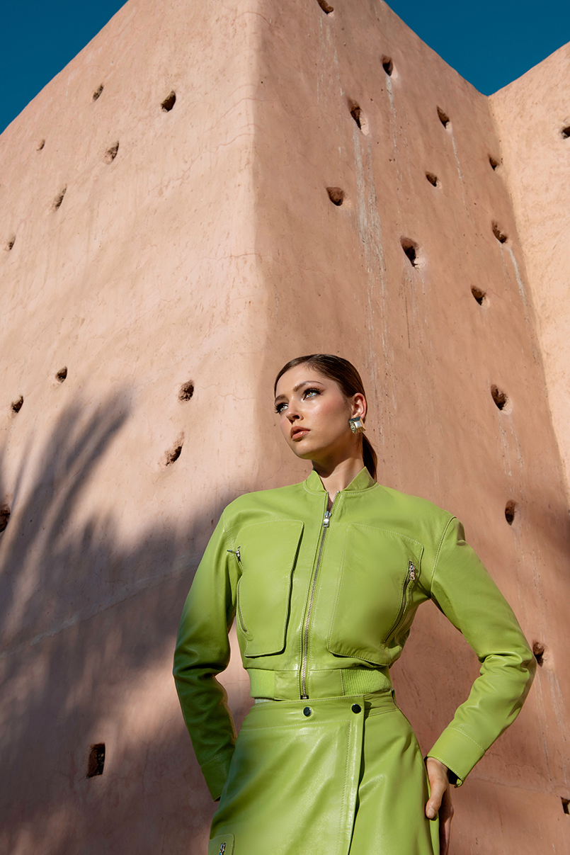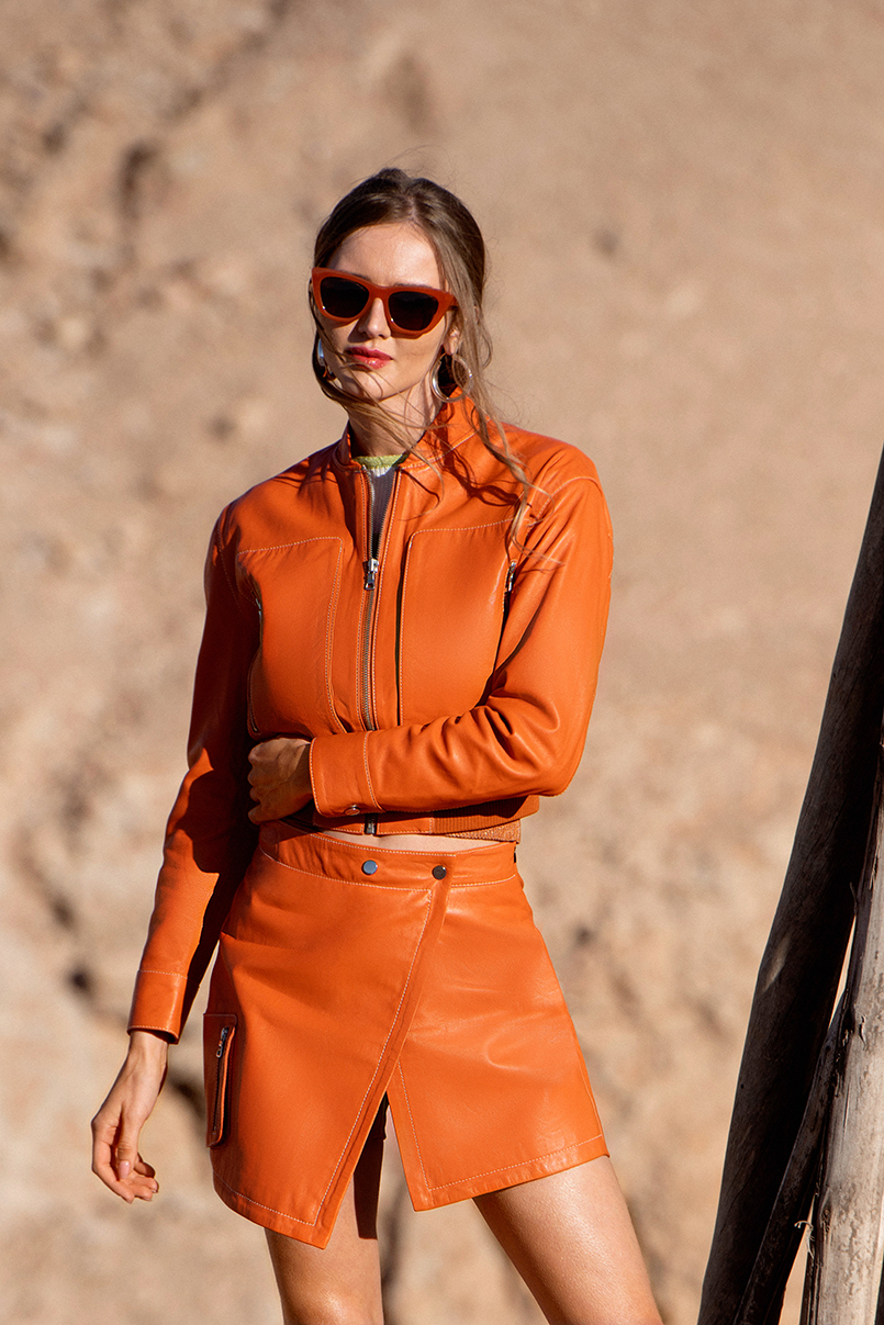 Bomber em pele de fit curto e justo. Manga comprida com punhos e mola de pressão. Bolsos frontais de chapa. Fecho de correr à frente. Base com elástico. Forro interior ao tom. Pormenor de pesponto em contraste.