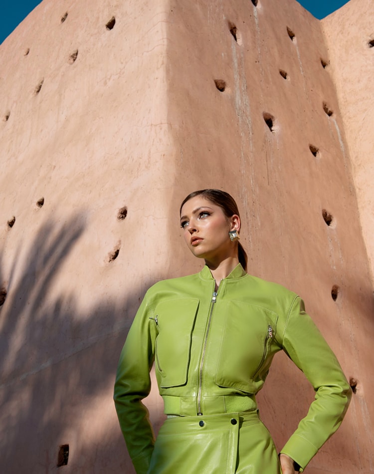Bomber em pele de fit curto e justo. Manga comprida com punhos e mola de pressão. Bolsos frontais de chapa. Fecho de correr à frente. Base com elástico. Forro interior ao tom. Pormenor de pesponto em contraste.