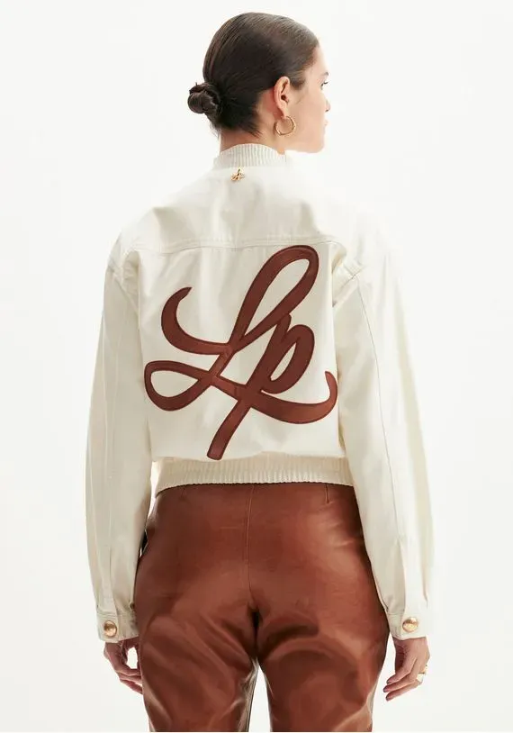 Casaco bomber é uma peça atemporal. Possui decote redondo, abertura frontal em botões metalizados, mangas longas e caimento confortável. O destaque fica por conta da assinatura com as iniciais de lp bordada em poliuretano nas costas. Aposte!