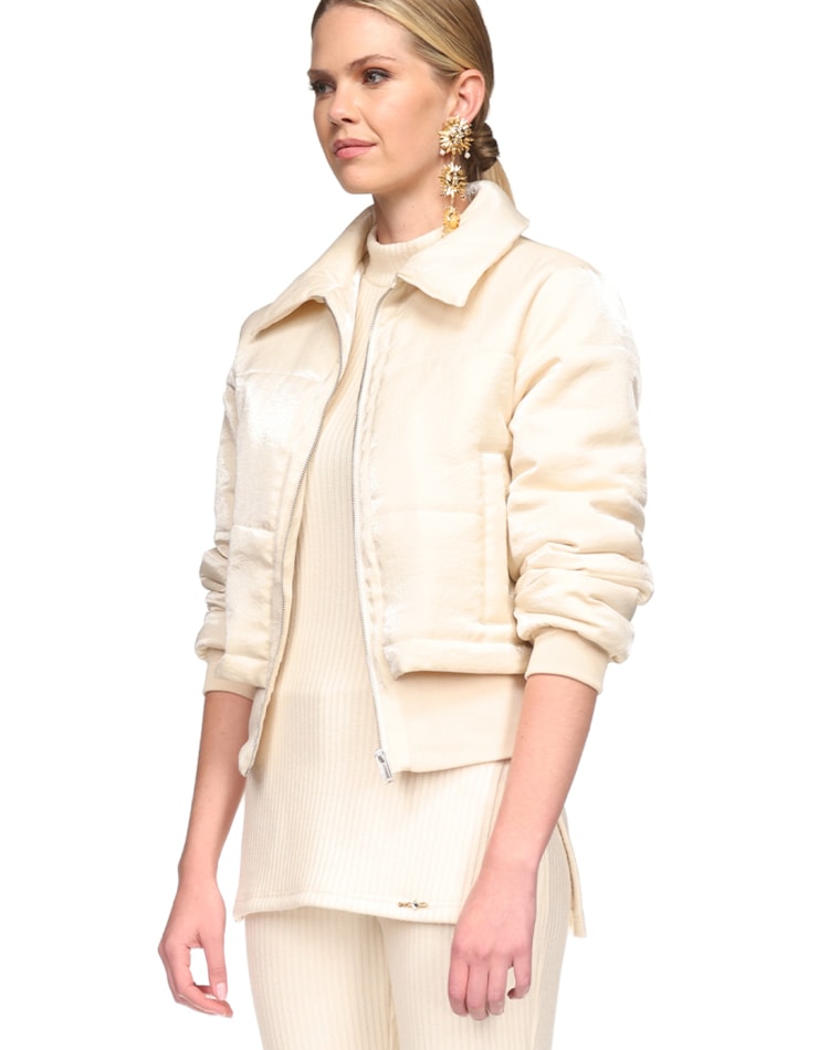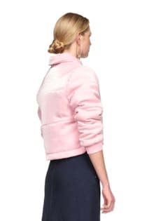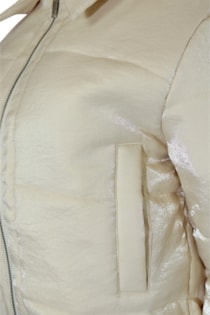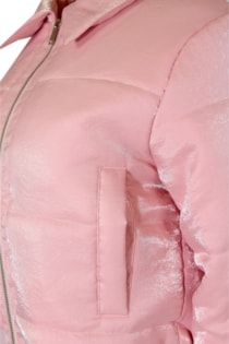 Casaco curto com ligeiro enchimento. Gola de lapelas. Fecho frontal com fecho metálico. Punhos e cintura com elástico de nervuras. Bolsos laterais.