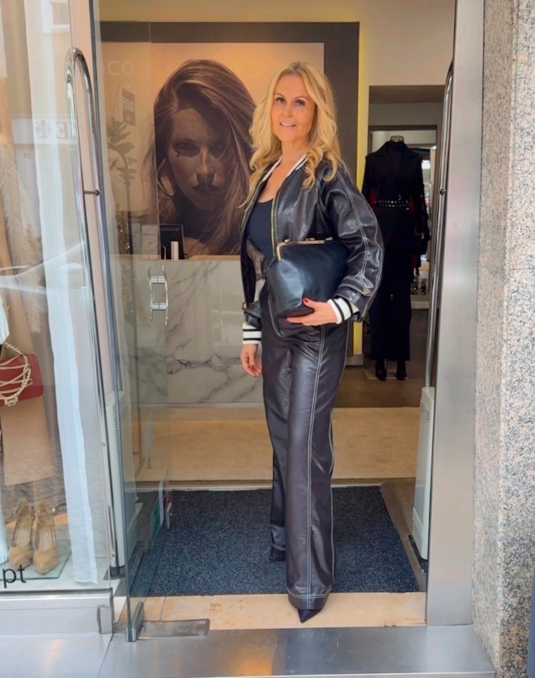 Bomber em eco pele de textura suave e acabamento luminoso, reinterpretando o estilo desportivo com uma abordagem sofisticada. Apresenta gola, punhos e cós em malha canelada com riscas contrastantes, além de fecho frontal com fecho de correr metálico. As mangas estruturadas e os punhos ajustáveis com botão acrescentam personalidade. Uma peça statement que combina o conforto urbano com a atitude glam da estação.