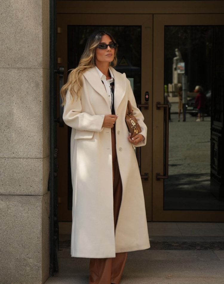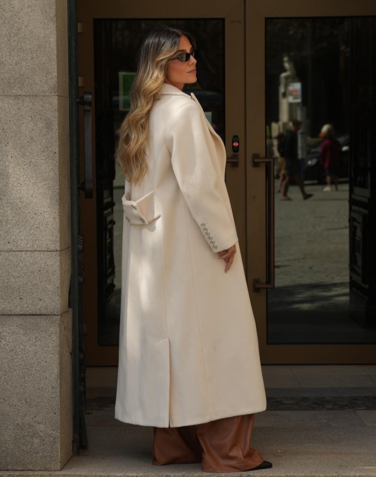 Casaco comprido Sahoco em lã premium. O design estruturado com lapelas clássicas e abotoamento frontal transmite elegância intemporal. Detalhe posterior com faixa e botões para um ajuste refinado. Perfeito para completar coordenados elegantes em dias frios, combinando modernidade com sofisticação.