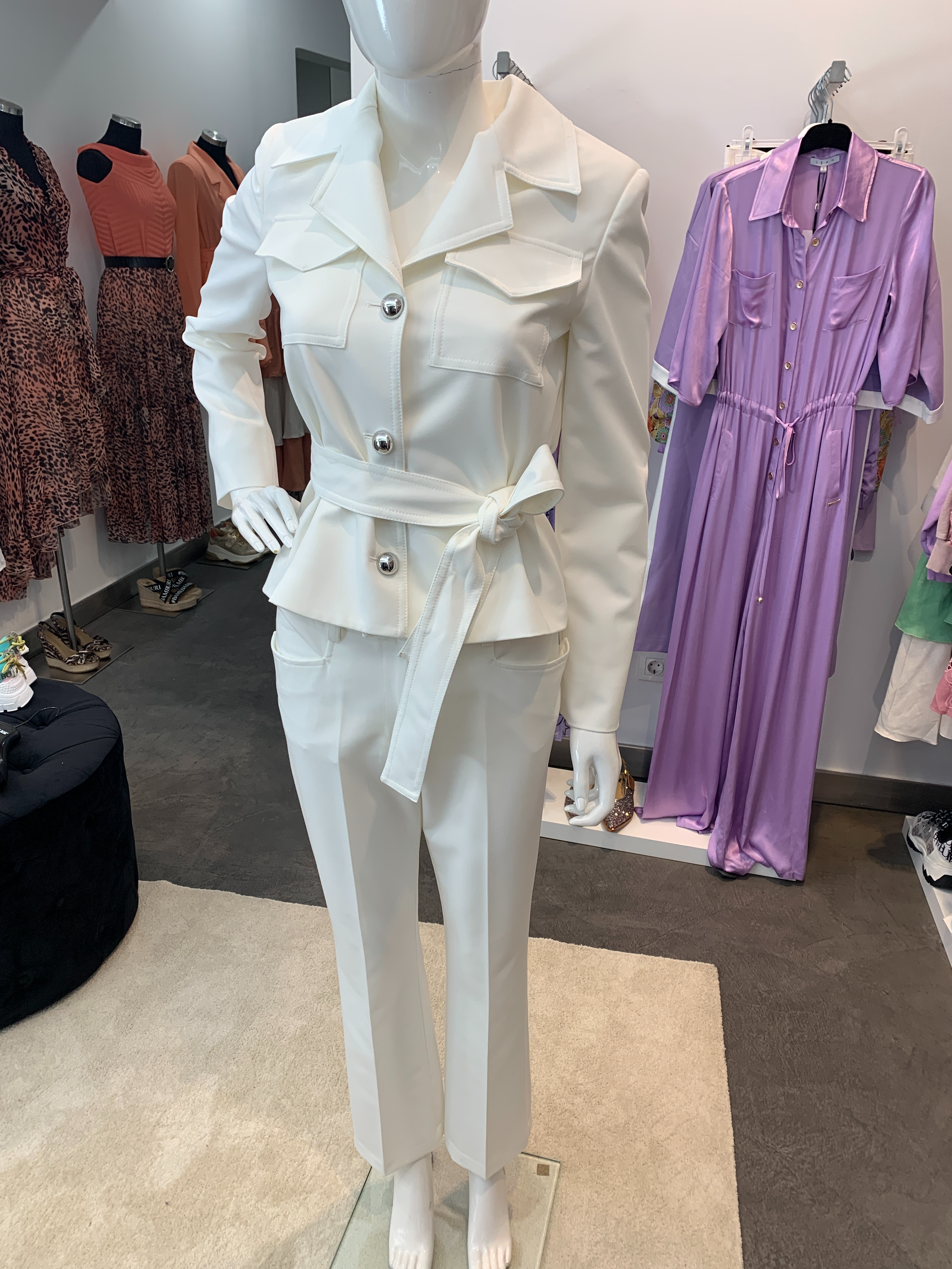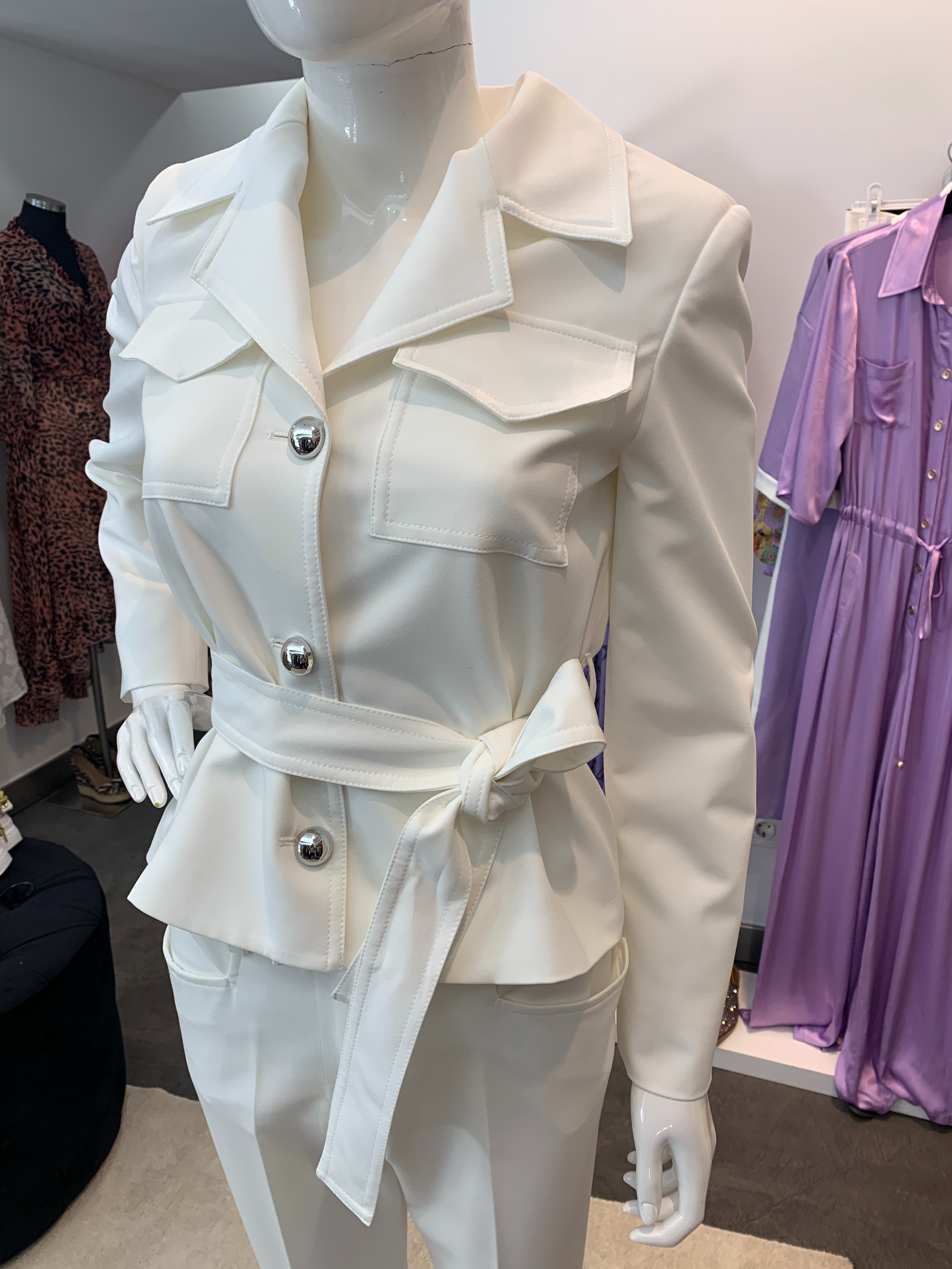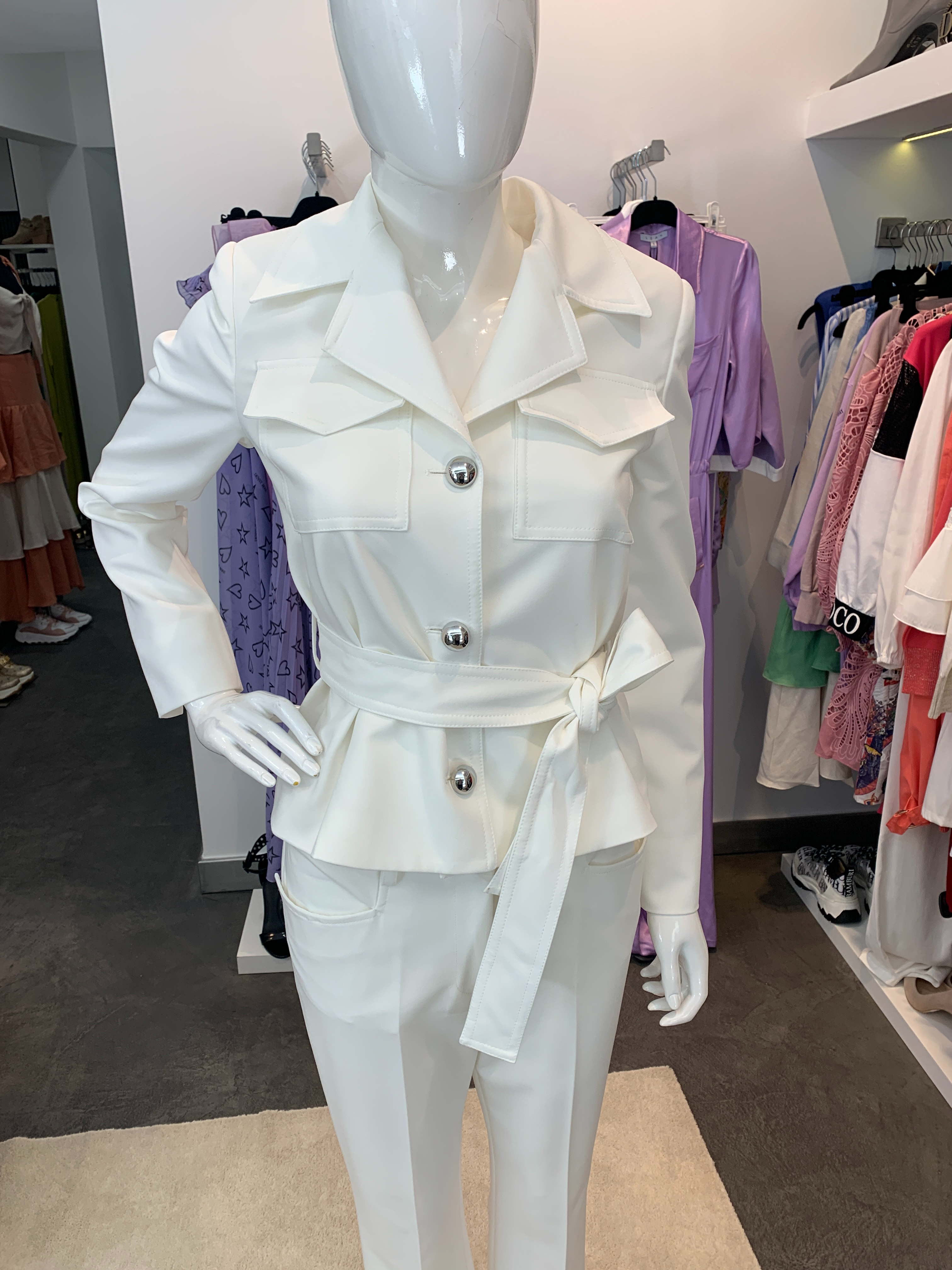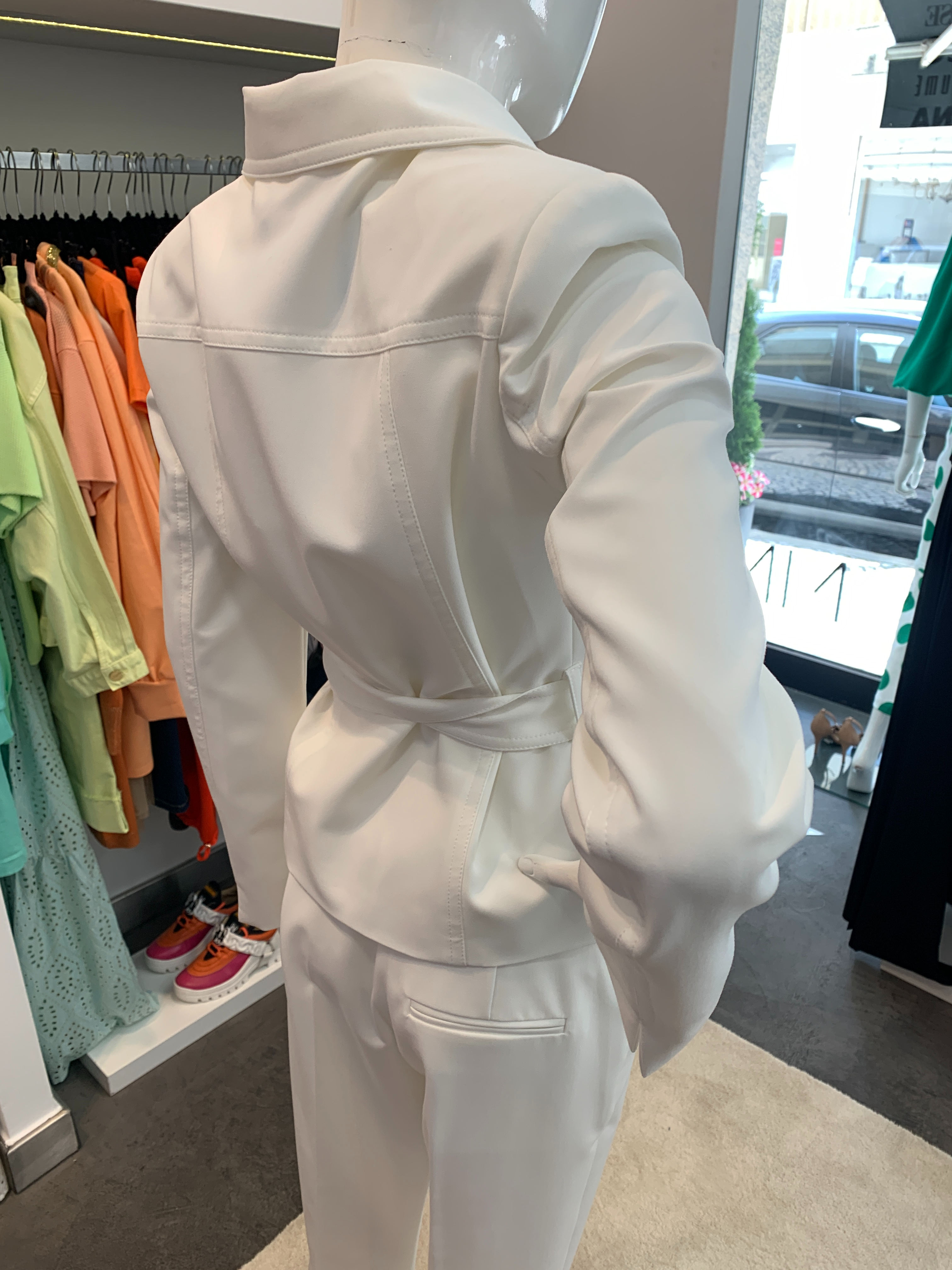 Casaco curto com cinto do mesmo tecido e com botões prata