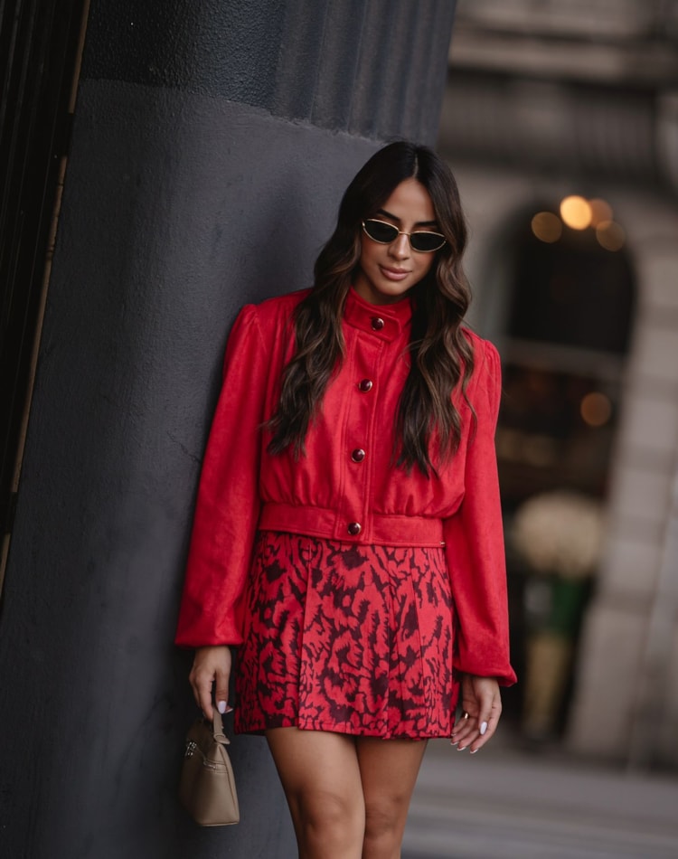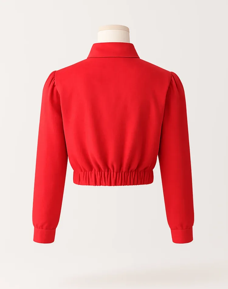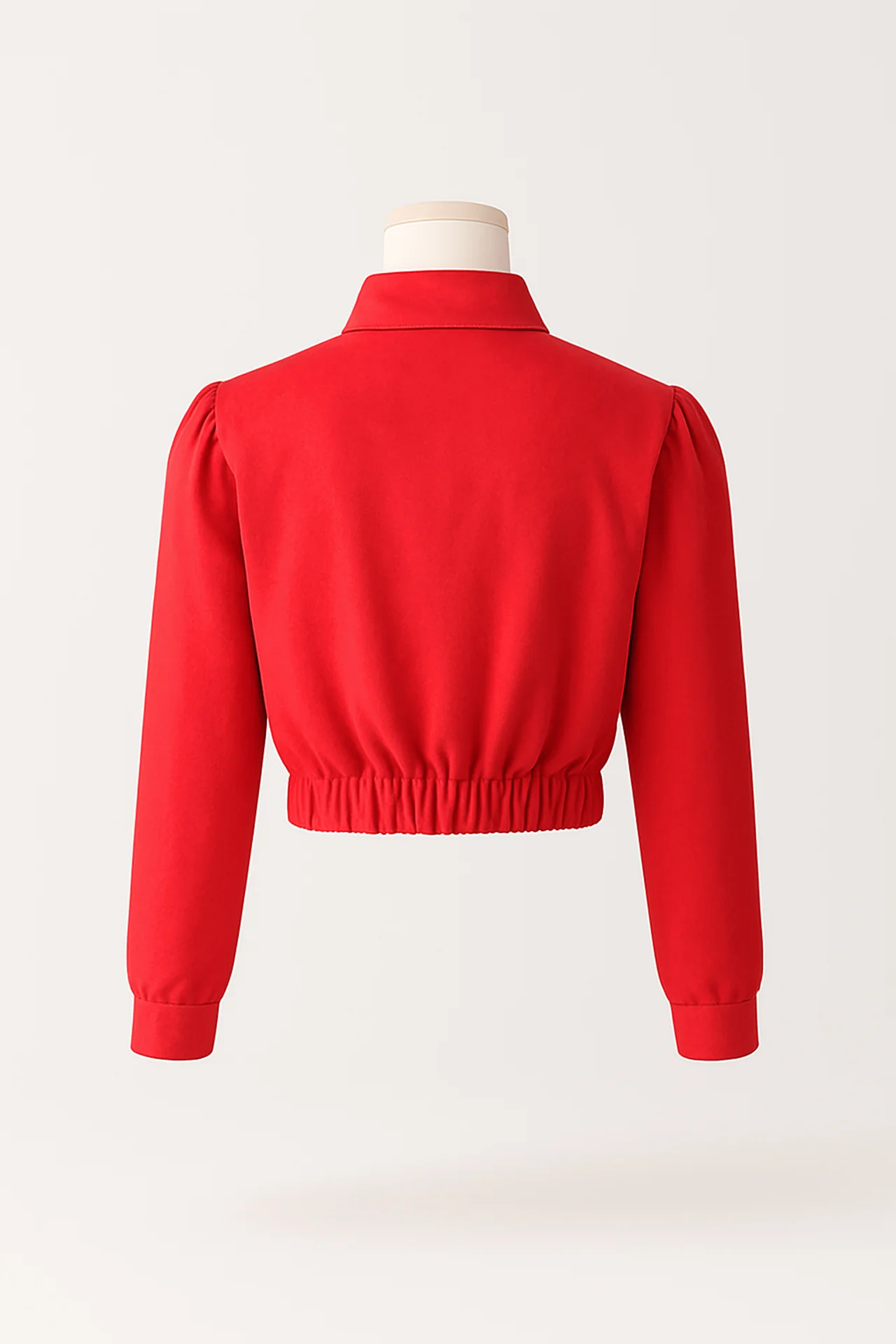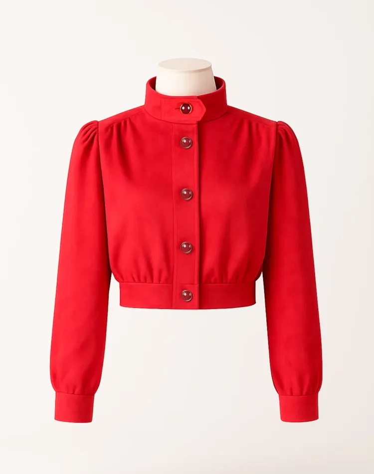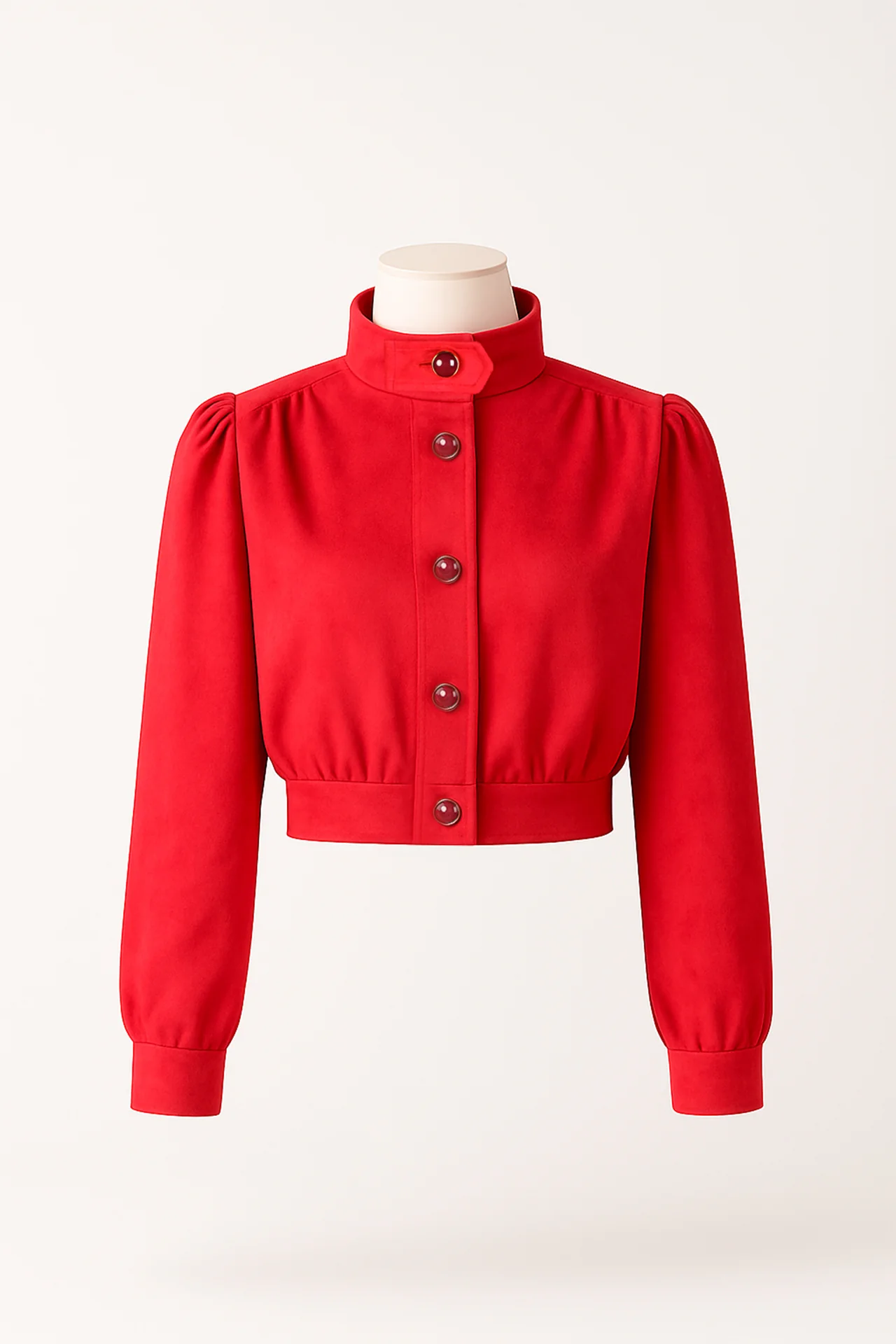Casaco curto em veludo suave com gola subida e abotoamento frontal. O corte estruturado e o brilho subtil do tecido conferem elegância moderna e conforto. Uma peça versátil que eleva instantaneamente qualquer coordenado.