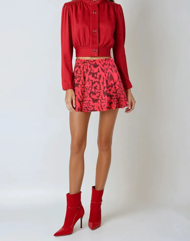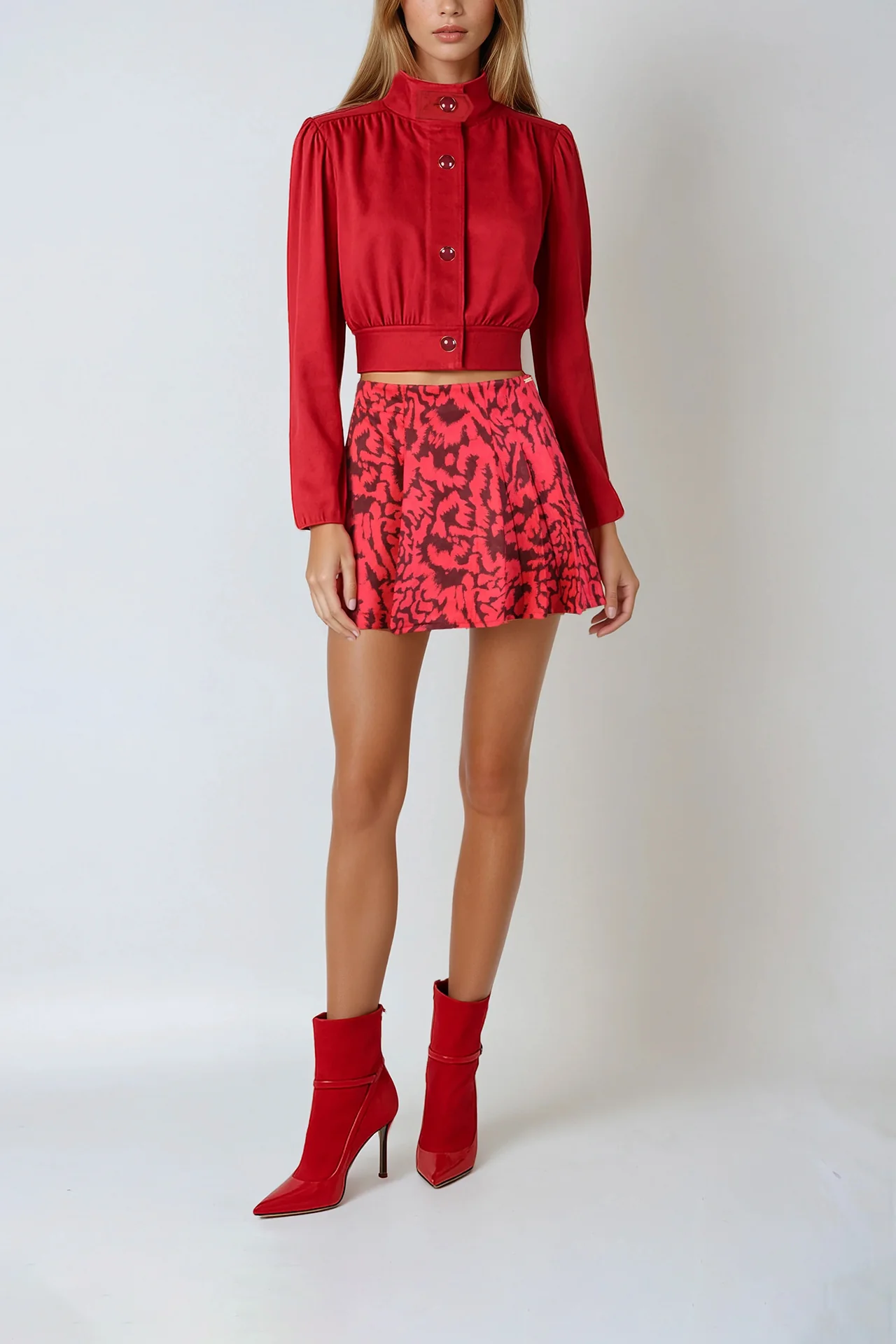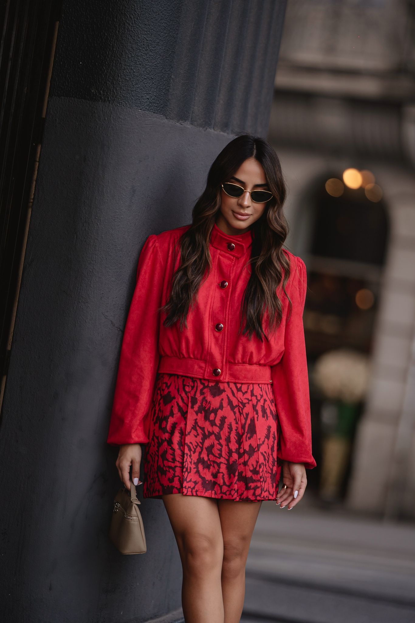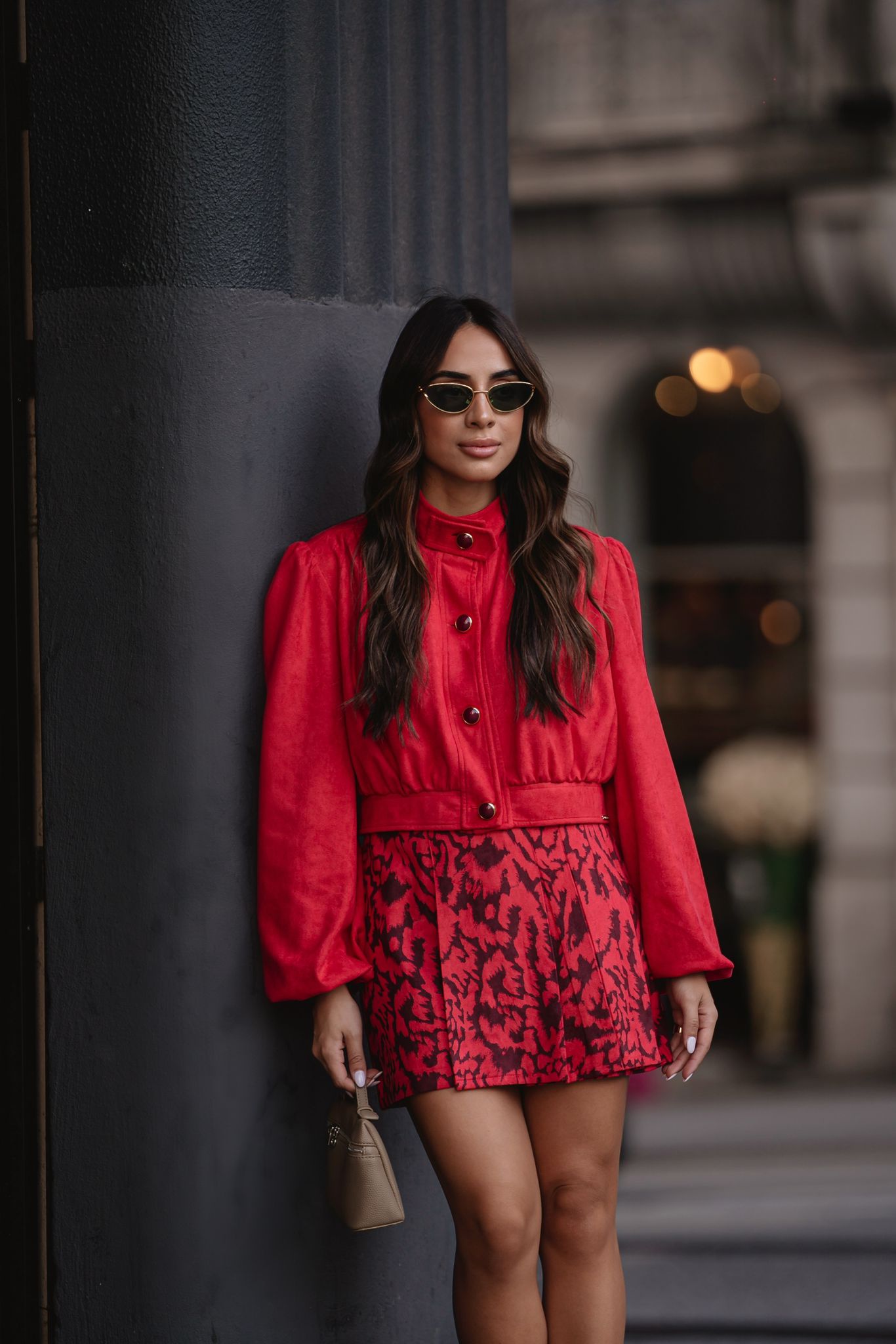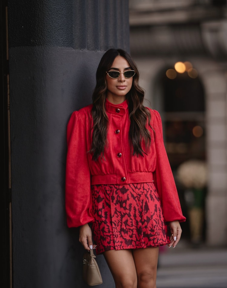 Casaco curto em veludo suave com gola subida e abotoamento frontal. O corte estruturado e o brilho subtil do tecido conferem elegância moderna e conforto. Uma peça versátil que eleva instantaneamente qualquer coordenado.